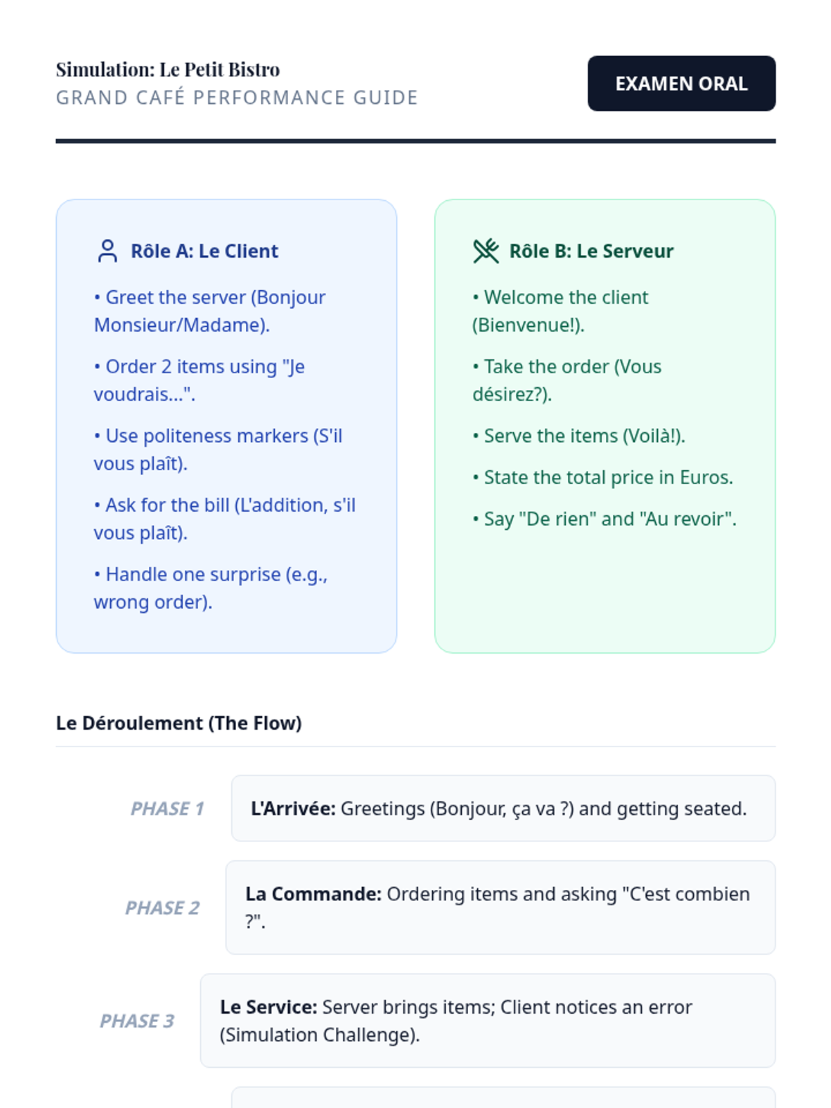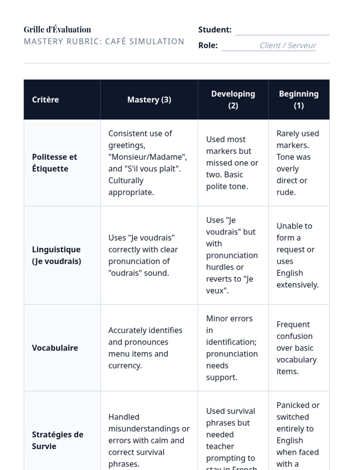 A 5-lesson unit for 9th-grade French beginners focused on navigating a French café. Students progress from basic vocabulary to a full-scale simulation, mastering polite requests, menu reading, and survival phrases along the way.
