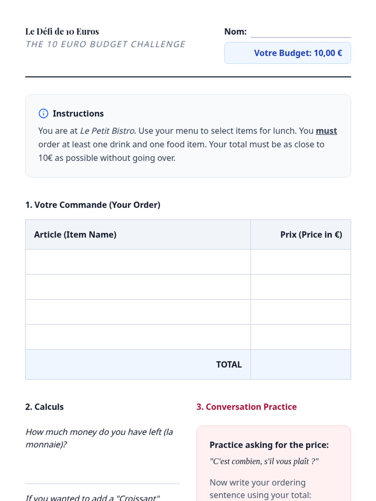 A high-stakes travel simulation building French listening proficiency in logistics: numbers, time, prices, and directions. Students navigate virtual 'survival' scenarios where accurate information processing is the key to a successful journey.