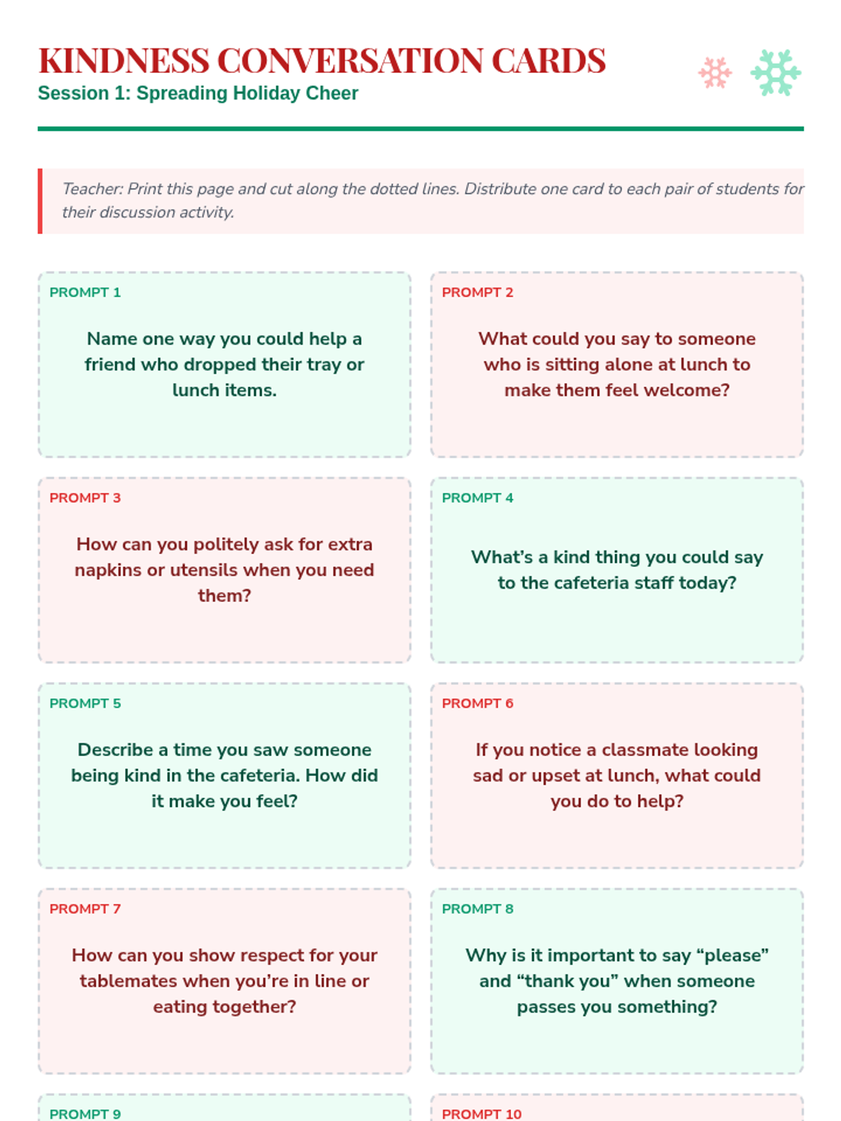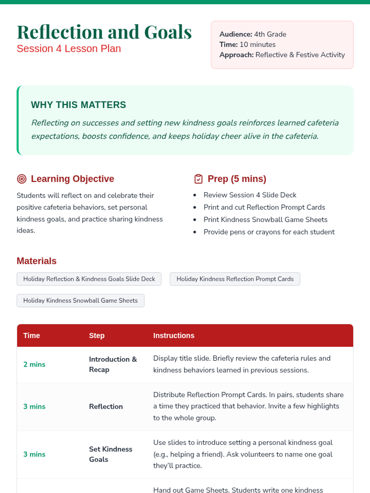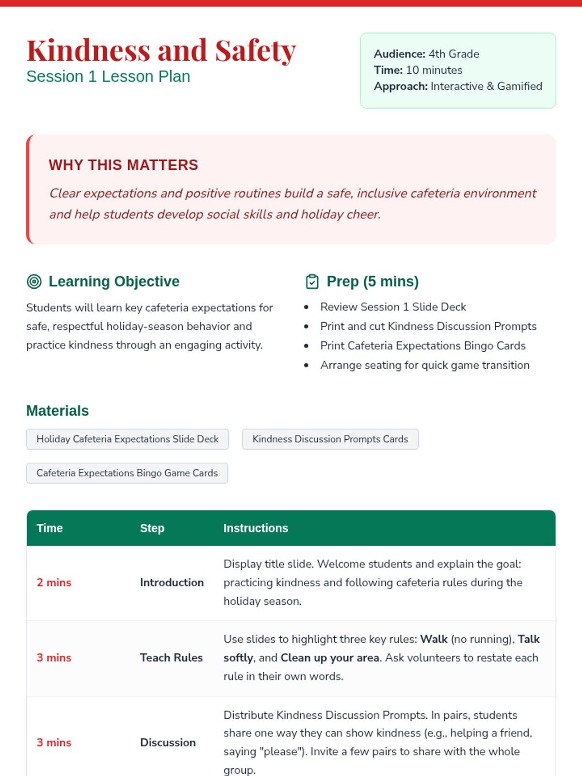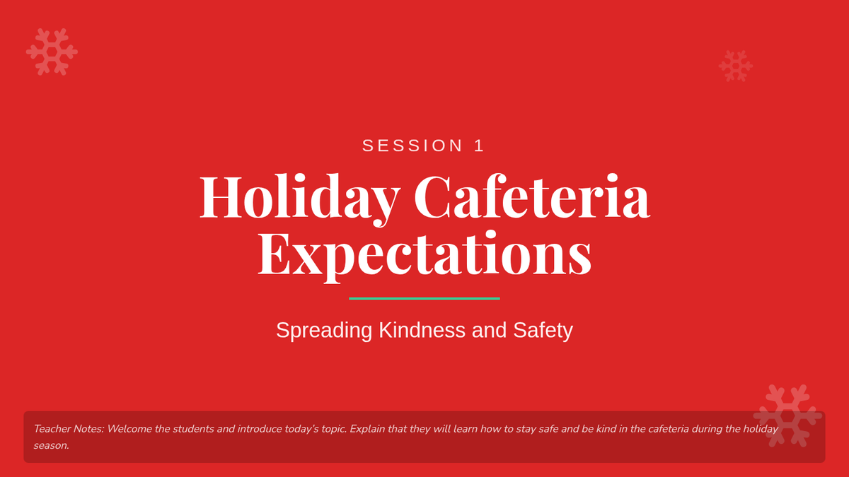 A 4-session series for 4th graders focused on spreading kindness and following cafeteria expectations during the holiday season. The lessons use interactive games, slides, and discussions to reinforce positive routines and social skills.