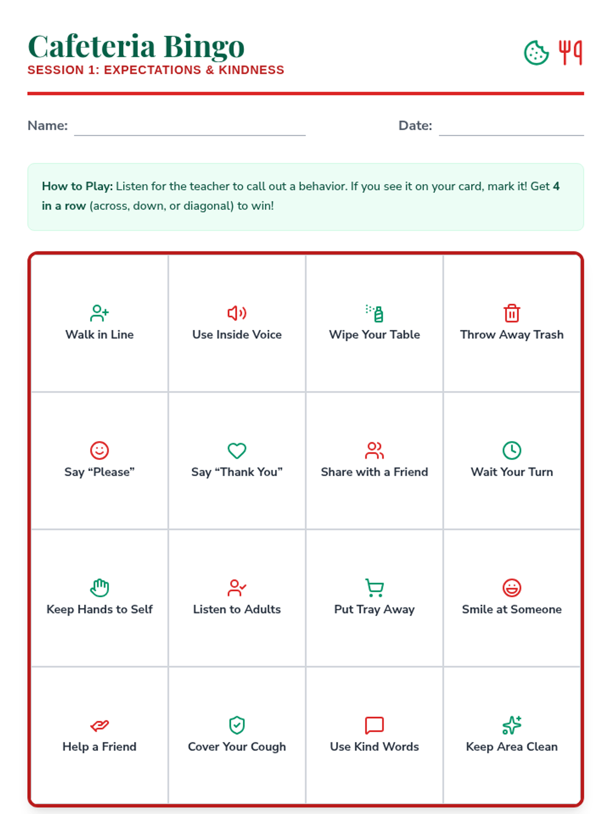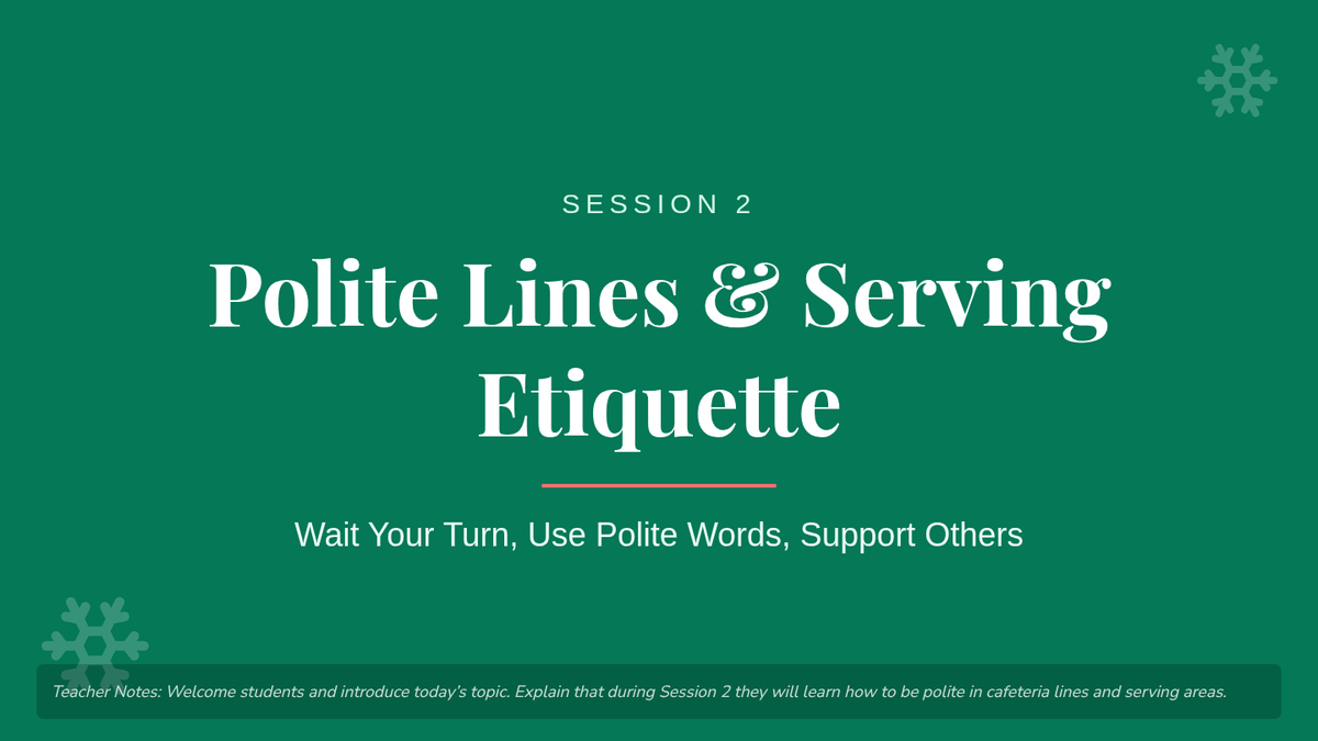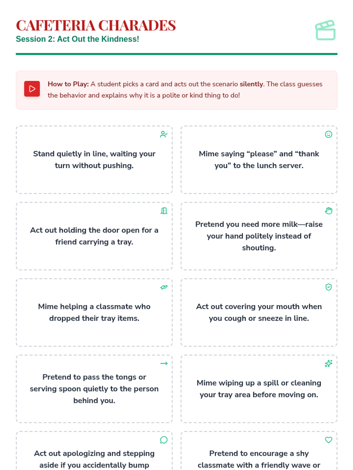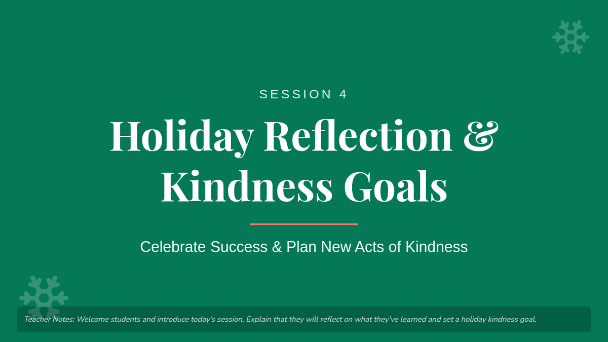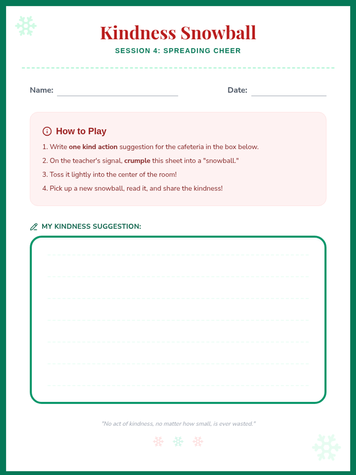 A 4-session series for 4th graders focused on spreading kindness and following cafeteria expectations during the holiday season. The lessons use interactive games, slides, and discussions to reinforce positive routines and social skills.