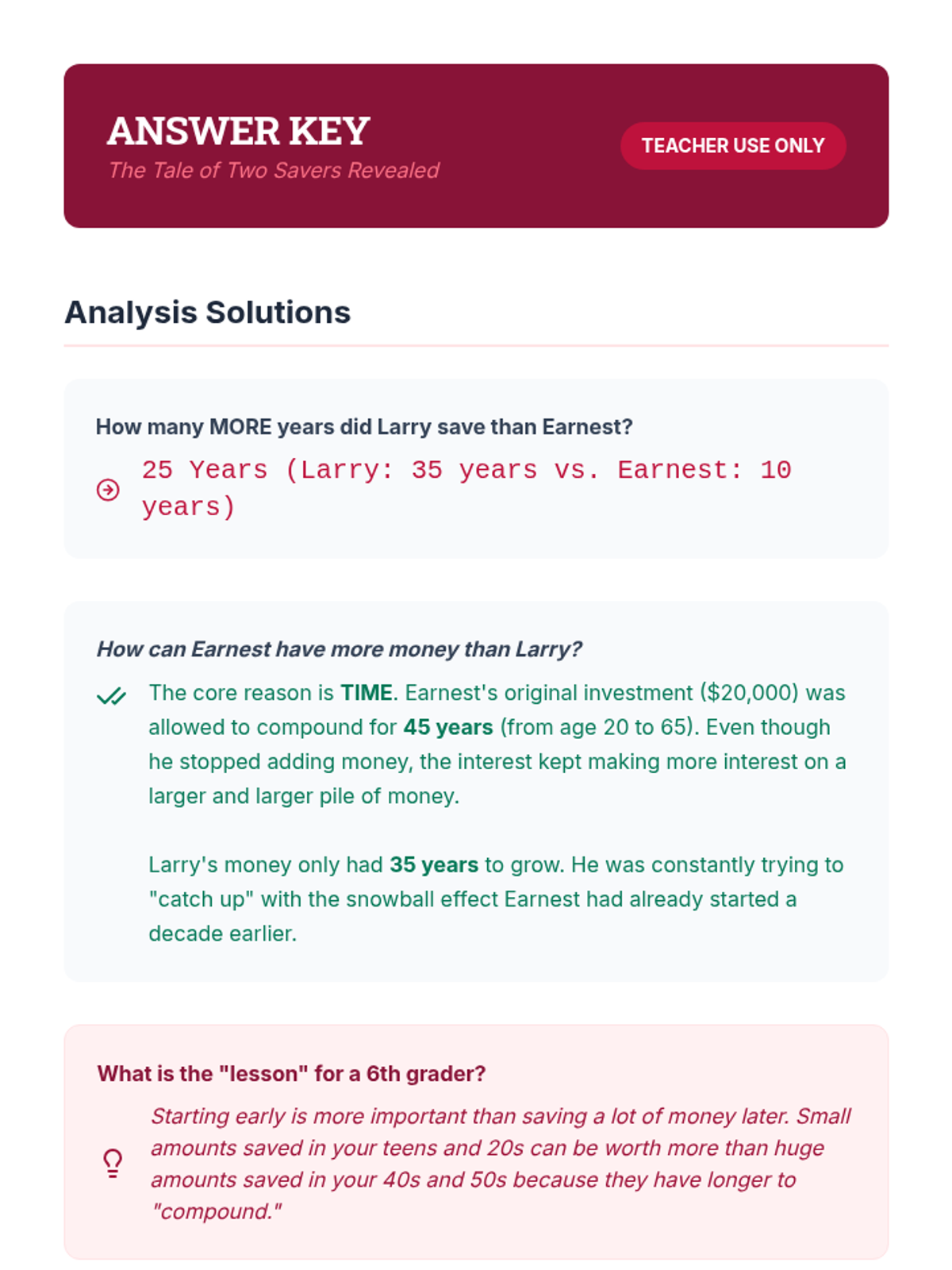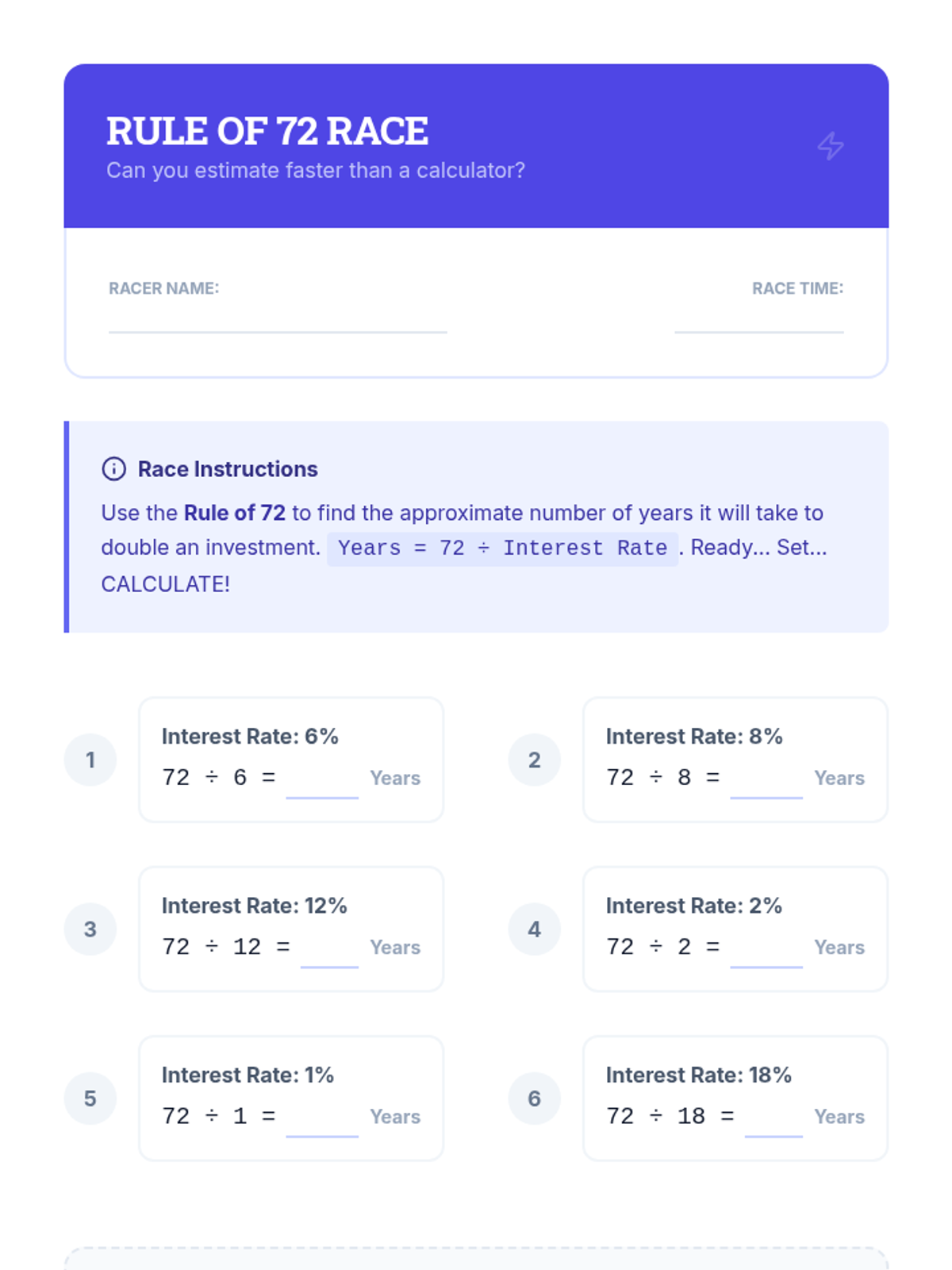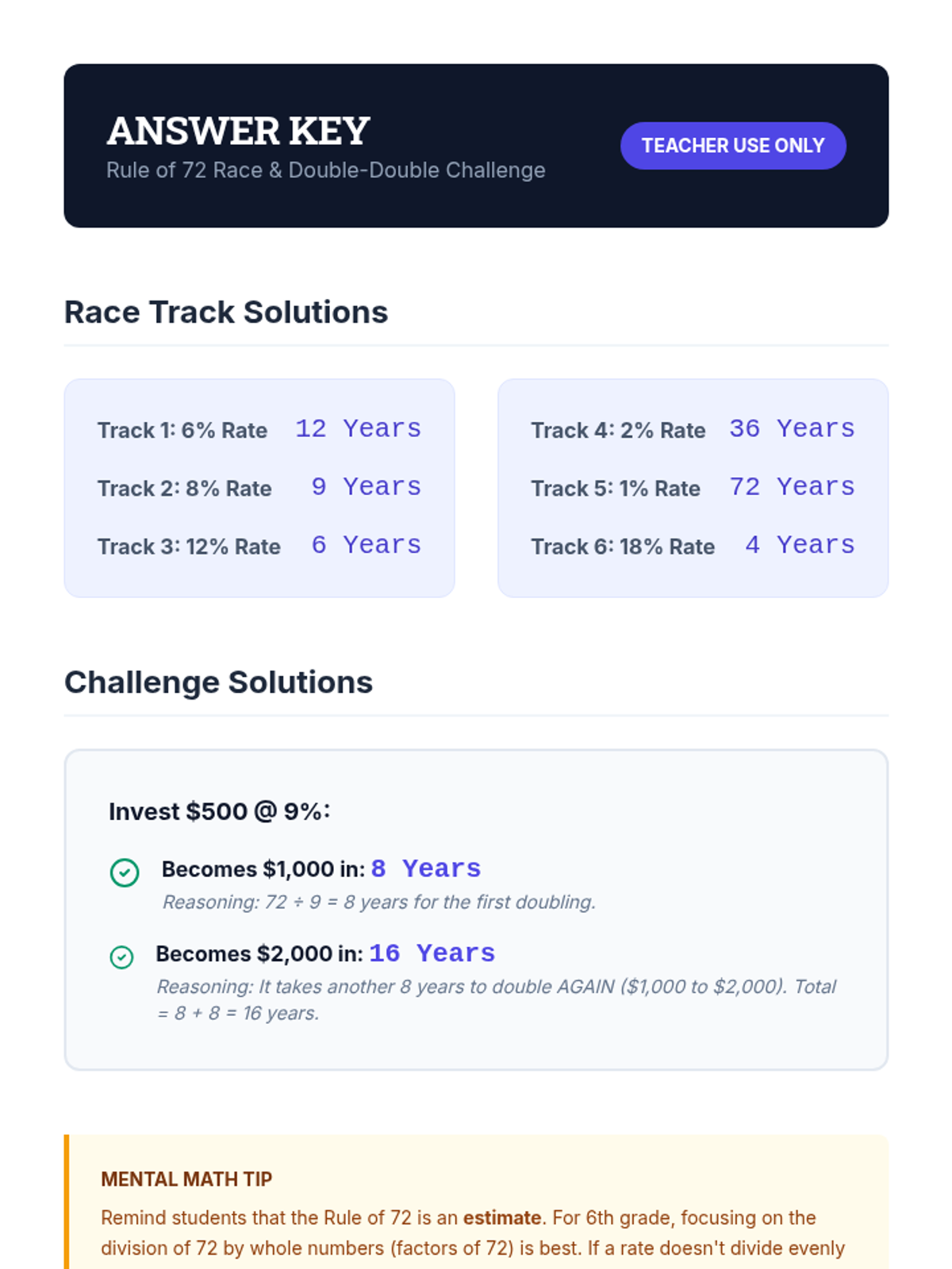 This 5-lesson sequence demystifies compound interest for 6th graders, moving from manual calculations to future wealth projections using the Rule of 72 and the Time Value of Money.