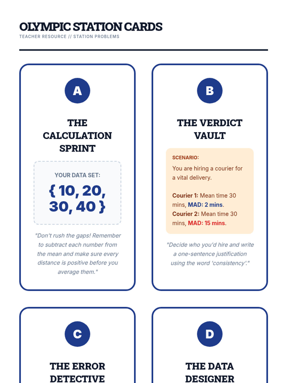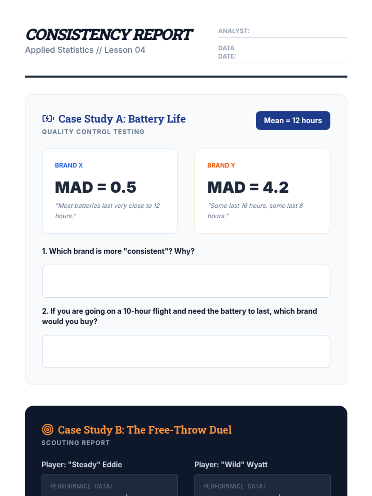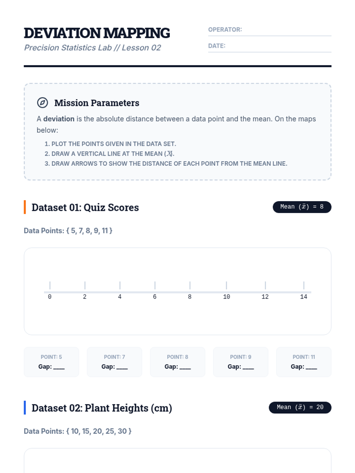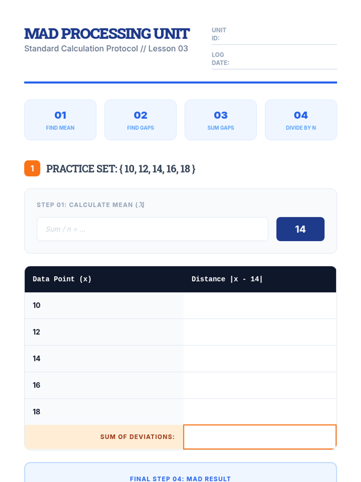 This sequence guides 6th-grade students through the conceptual and procedural steps of calculating and interpreting Mean Absolute Deviation (MAD). Students move from understanding mean as a balance point to visualizing deviation as distance, eventually mastering the multi-step calculation and applying it to evaluate data consistency in real-world contexts.