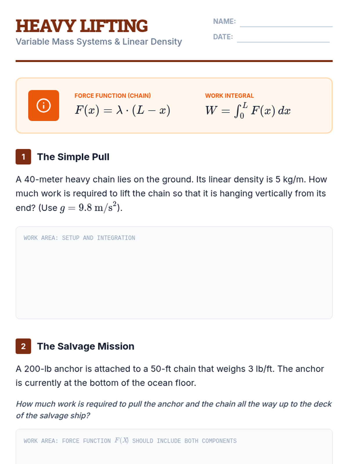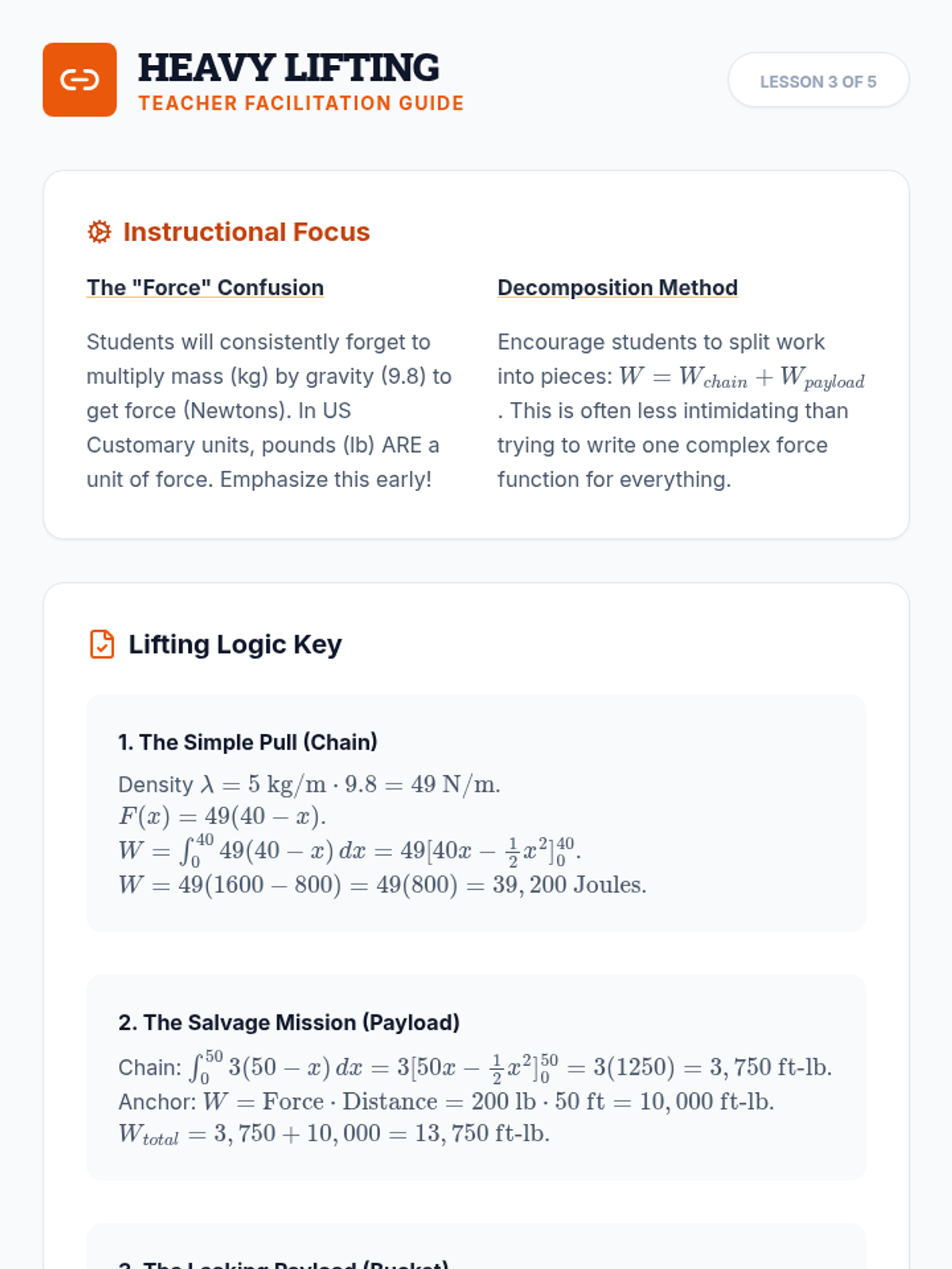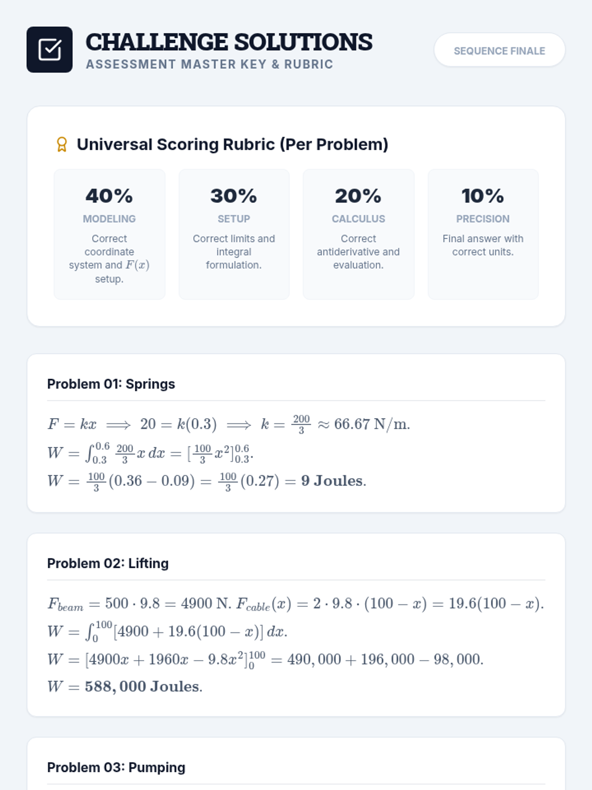 This sequence connects calculus to physics by applying integration to calculate Work and Force in variable systems. Students explore Hooke's Law, tank pumping, and lifting variable-mass objects, culminating in a mastery assessment of physical engineering applications.