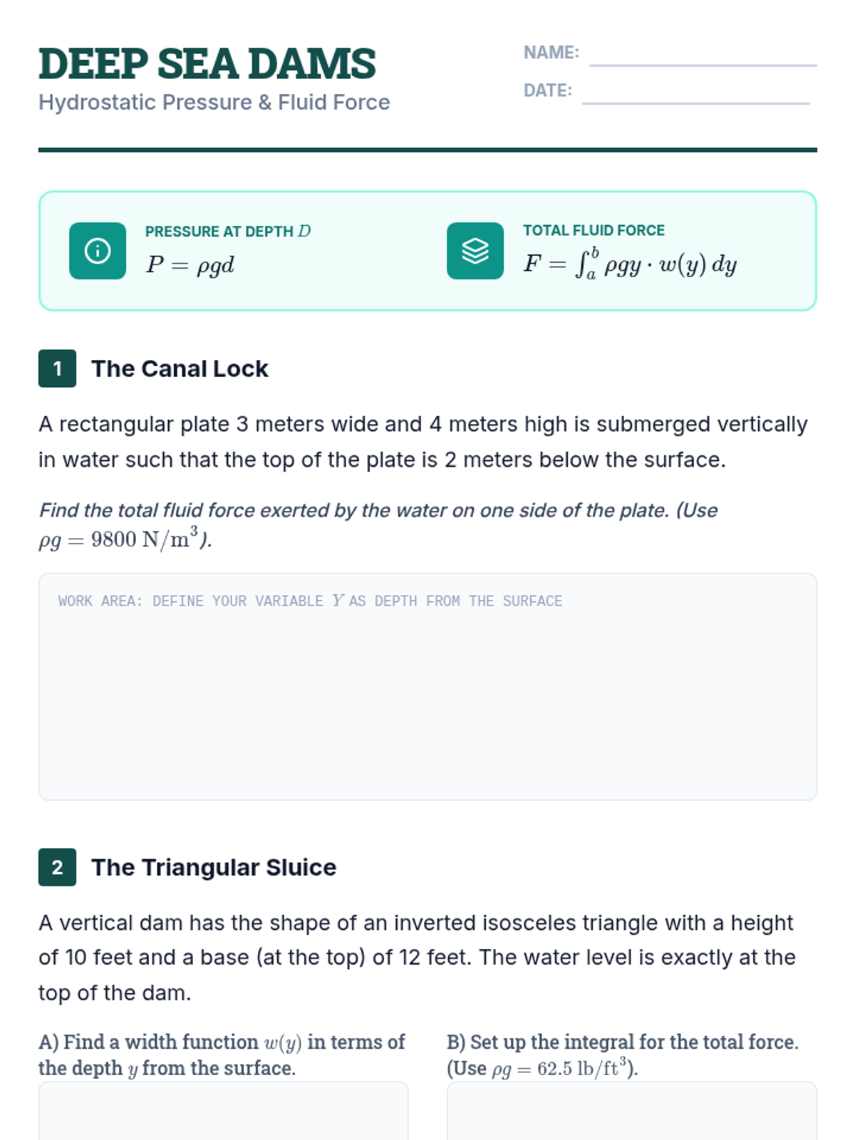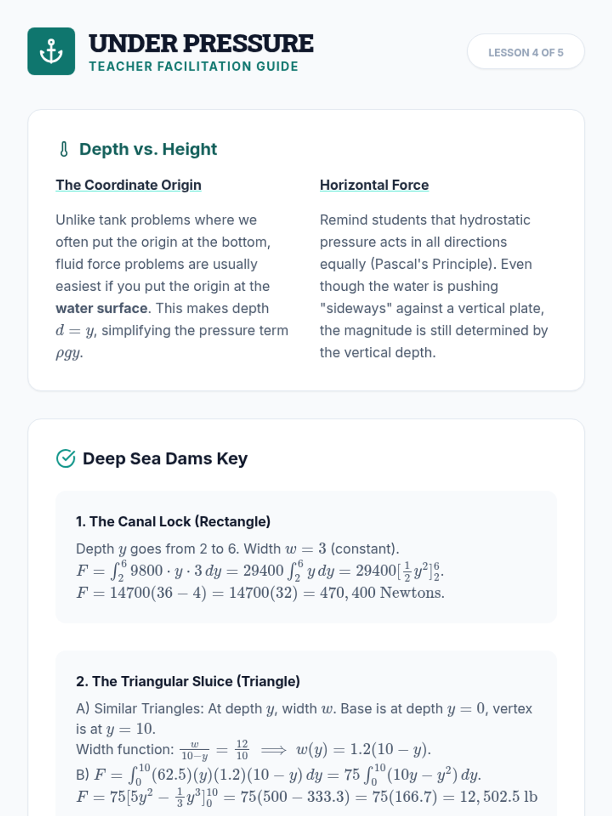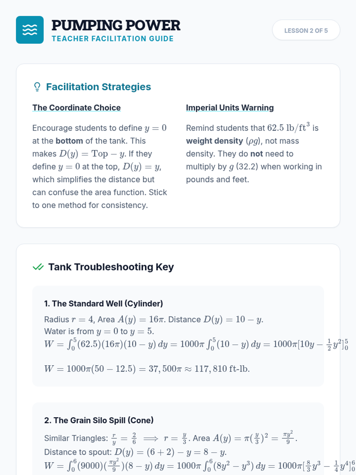 This sequence connects calculus to physics by applying integration to calculate Work and Force in variable systems. Students explore Hooke's Law, tank pumping, and lifting variable-mass objects, culminating in a mastery assessment of physical engineering applications.