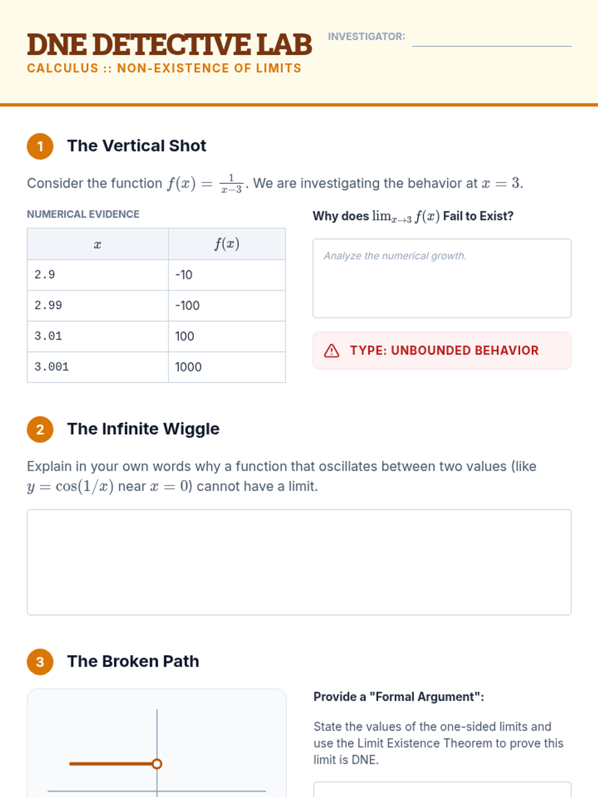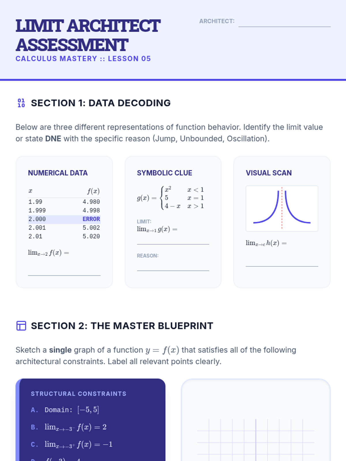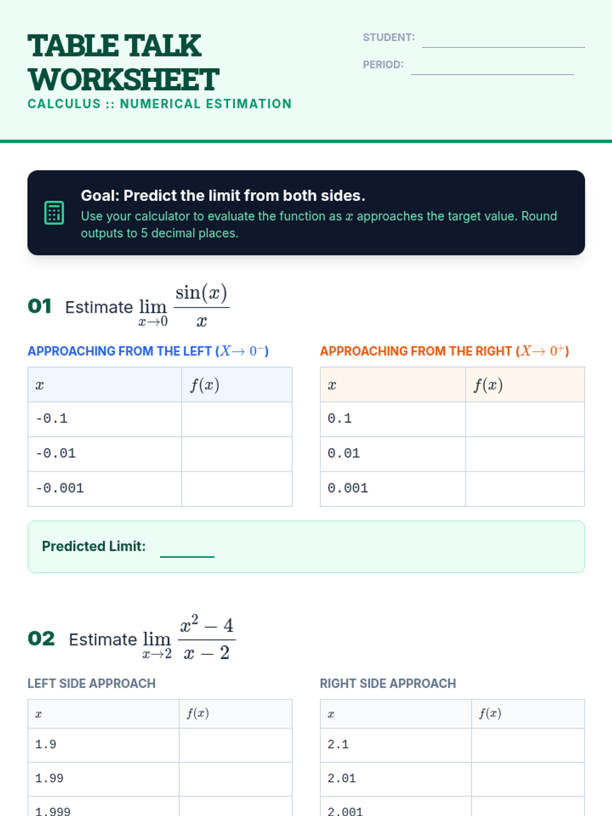A 12th-grade Calculus sequence introducing limits through the tangent line problem, numerical estimation, and graphical analysis of function behavior. Students progress from intuitive approximations to understanding one-sided limits and cases where limits fail to exist.
