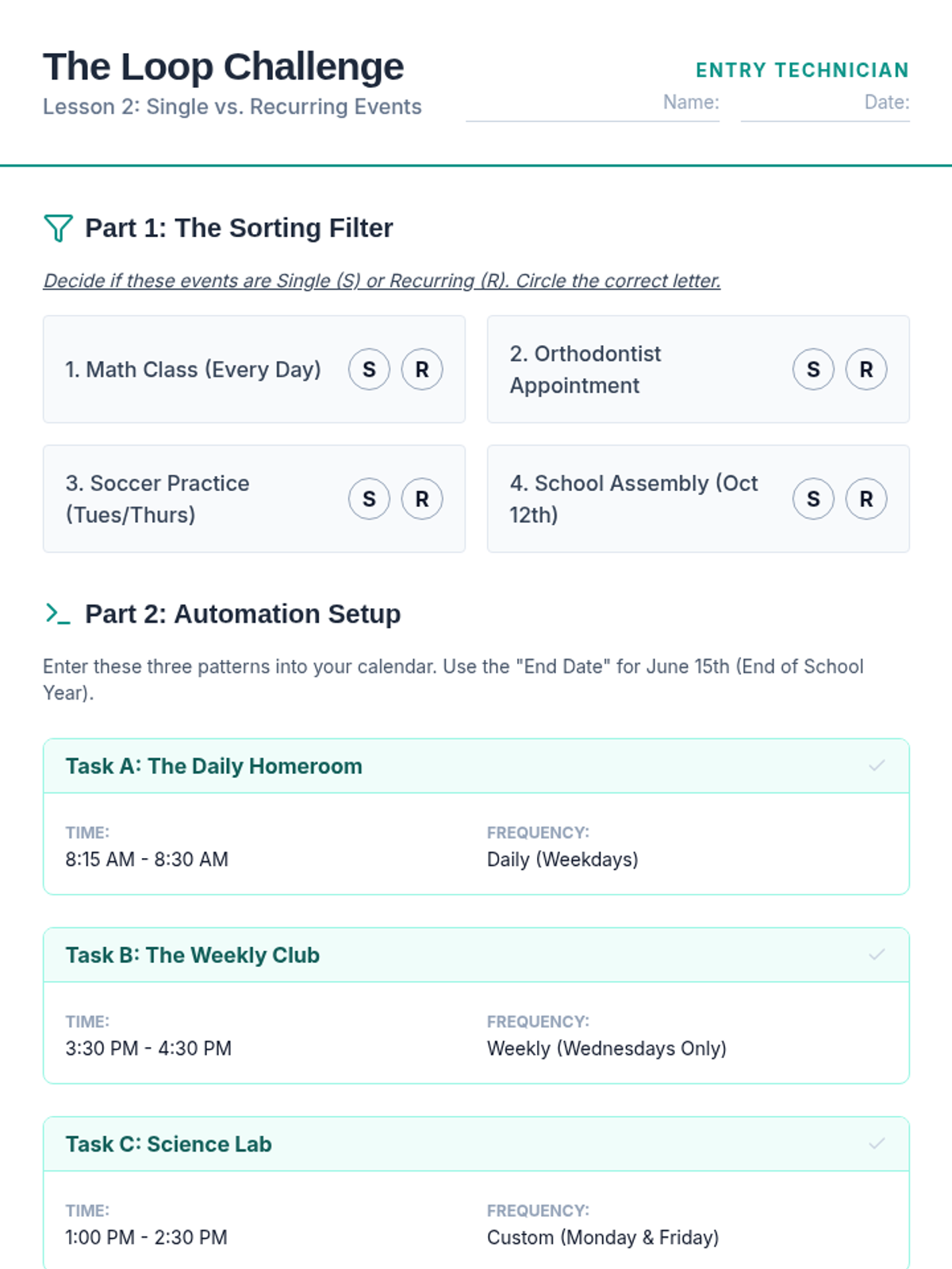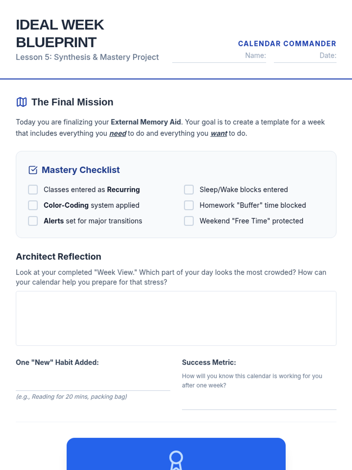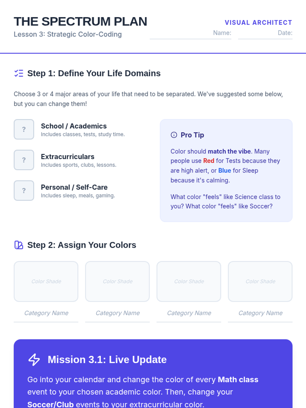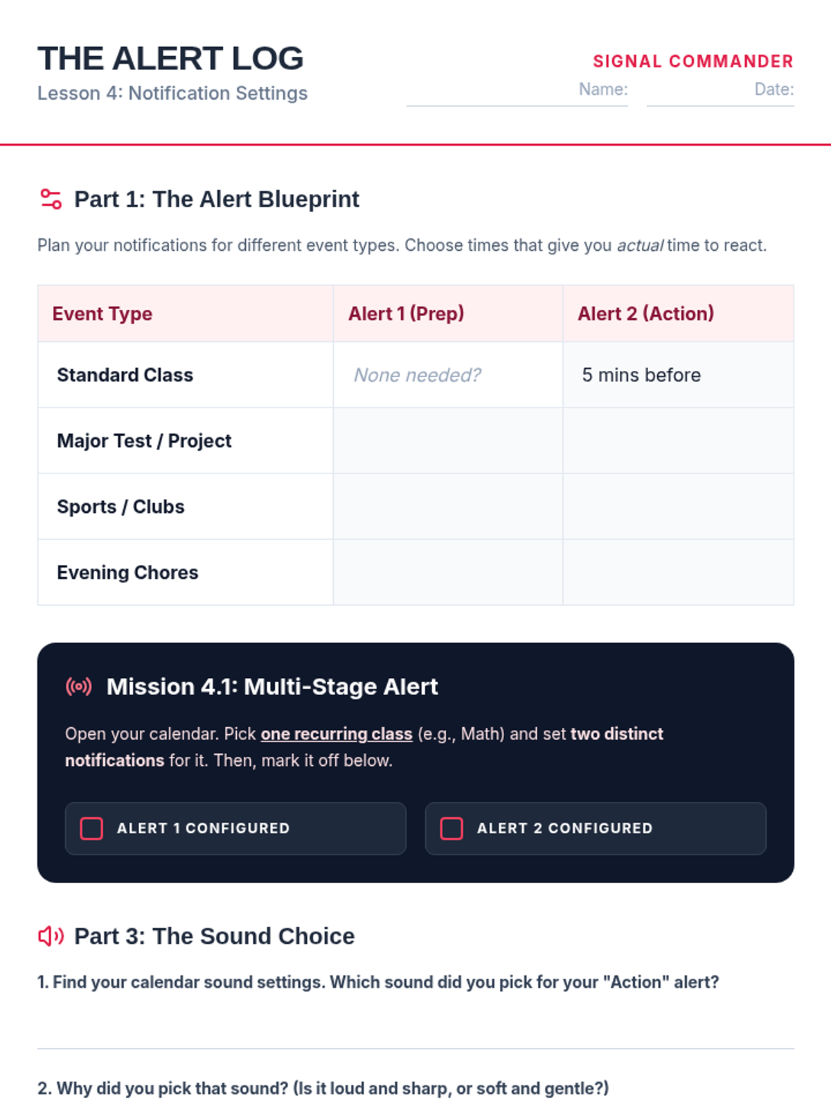 A foundational sequence for 8th-grade students to master digital calendar organization, moving from basic interface navigation to strategic time blocking and personalization. Students learn to use the calendar as an external memory aid to support executive function and academic independence.
