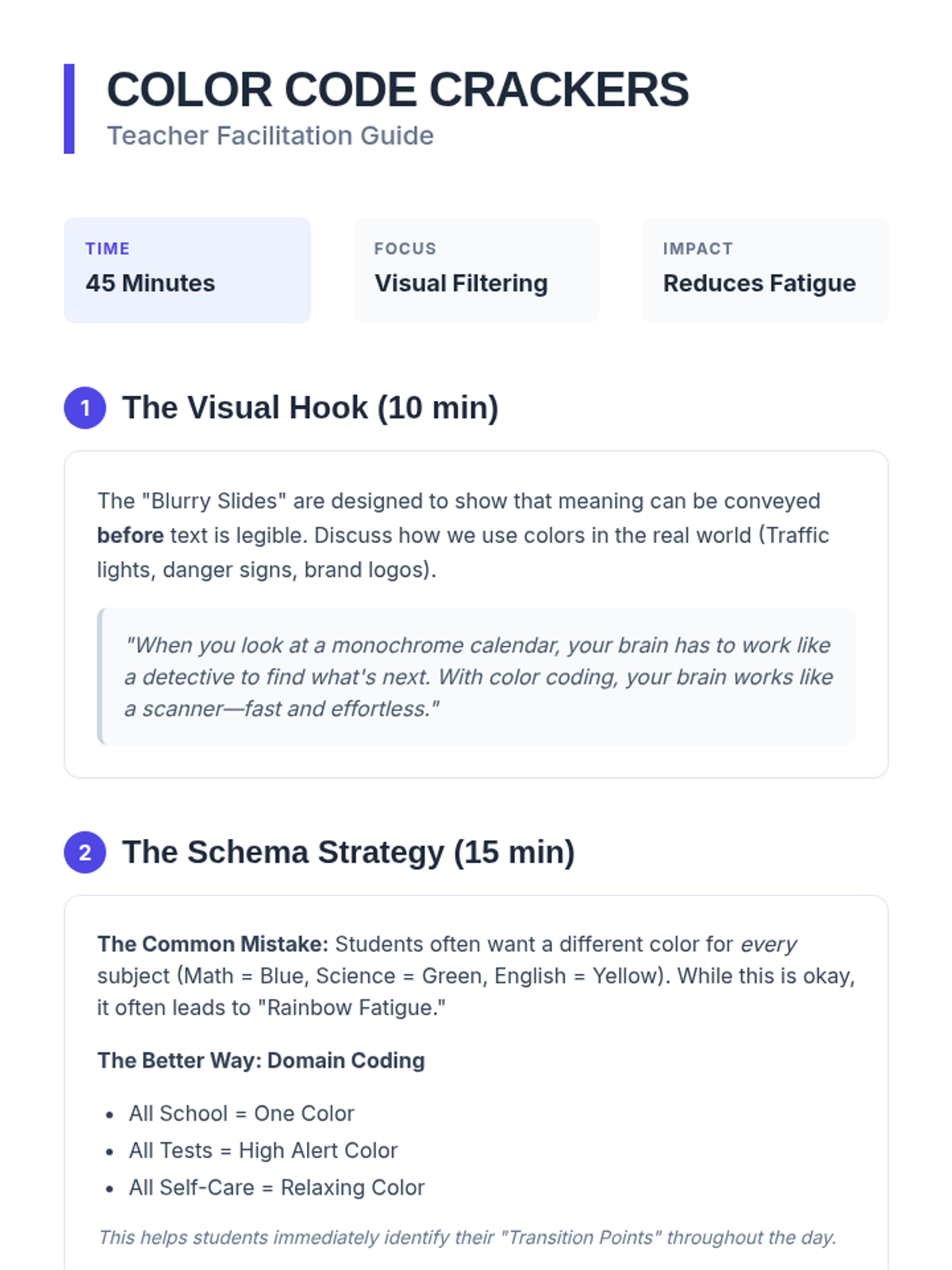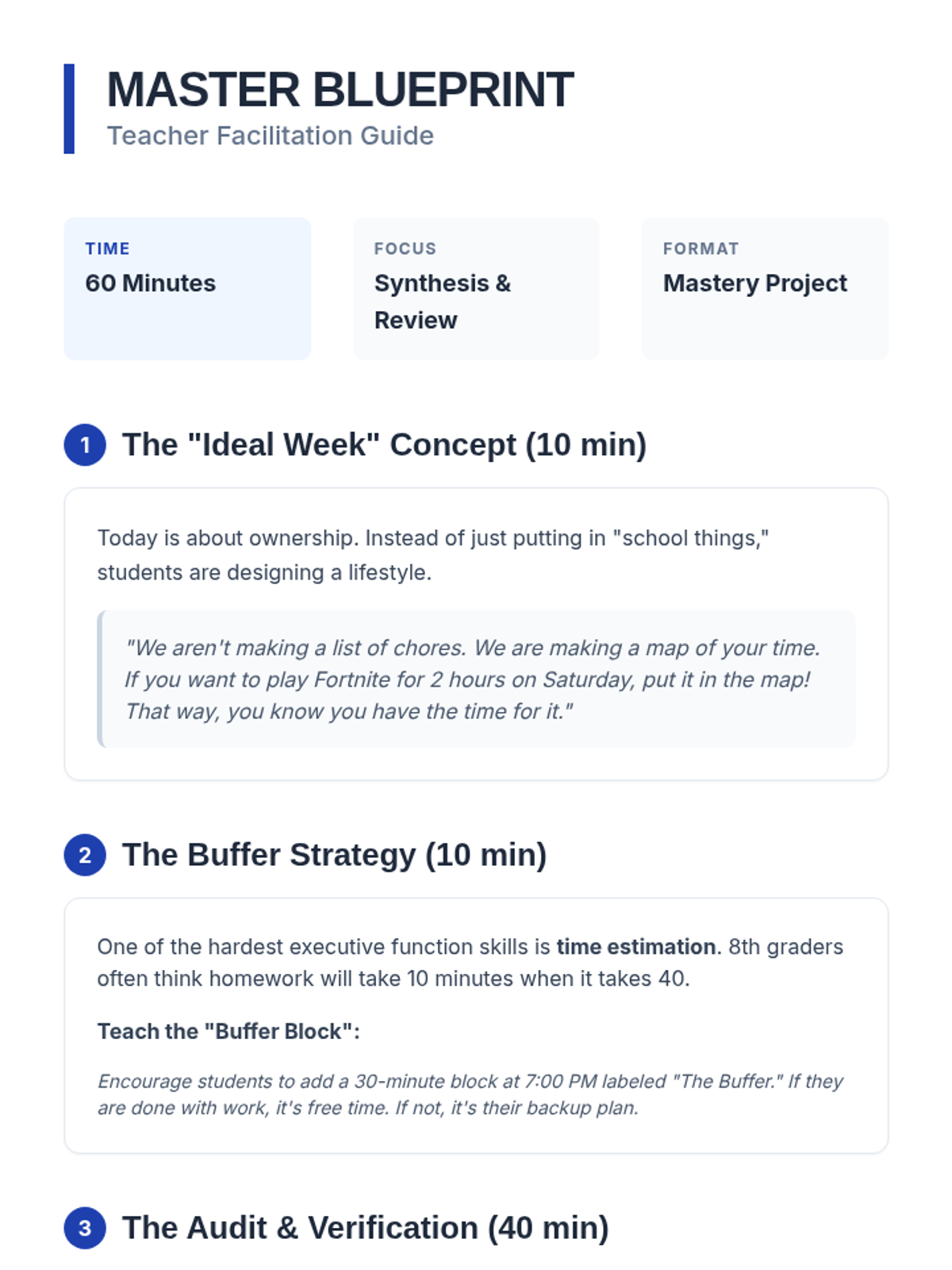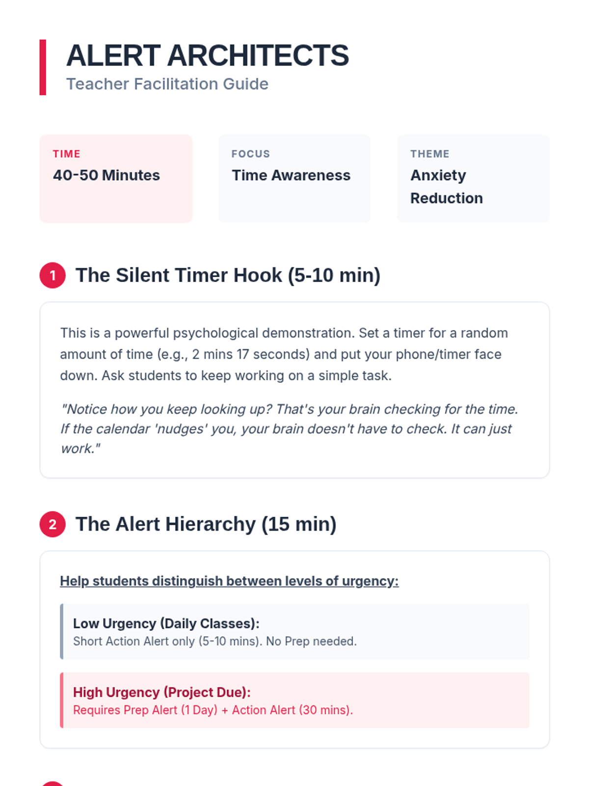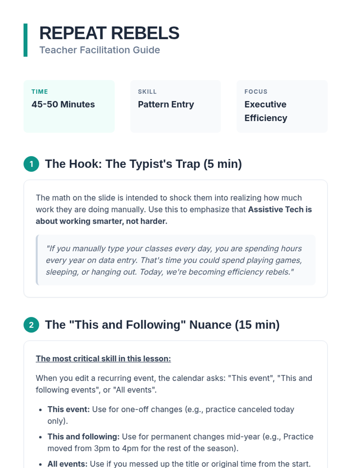 A foundational sequence for 8th-grade students to master digital calendar organization, moving from basic interface navigation to strategic time blocking and personalization. Students learn to use the calendar as an external memory aid to support executive function and academic independence.
