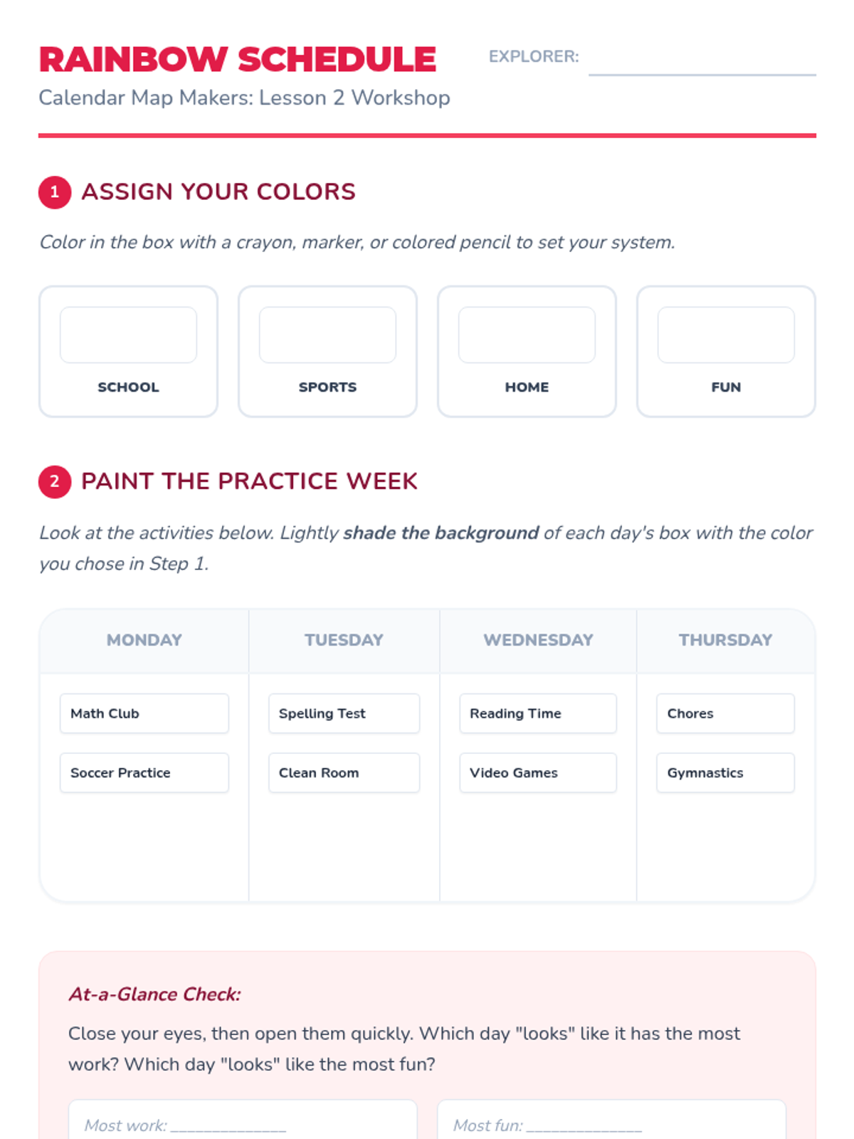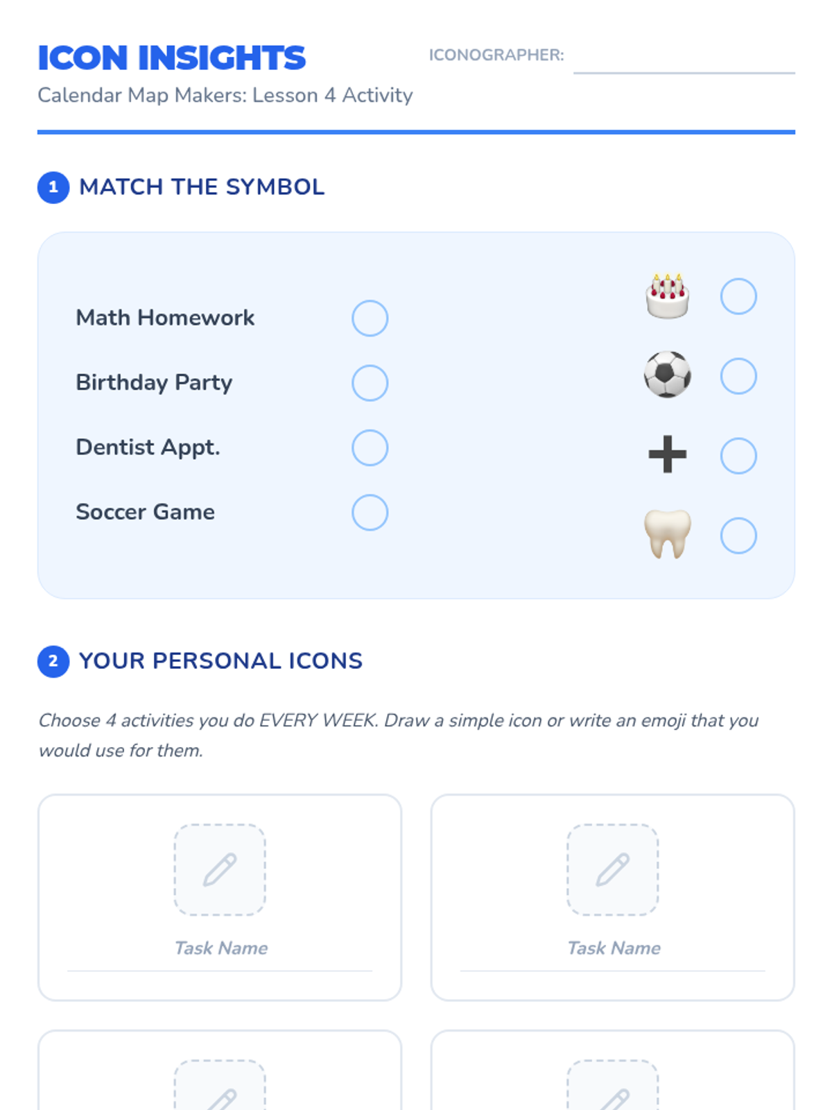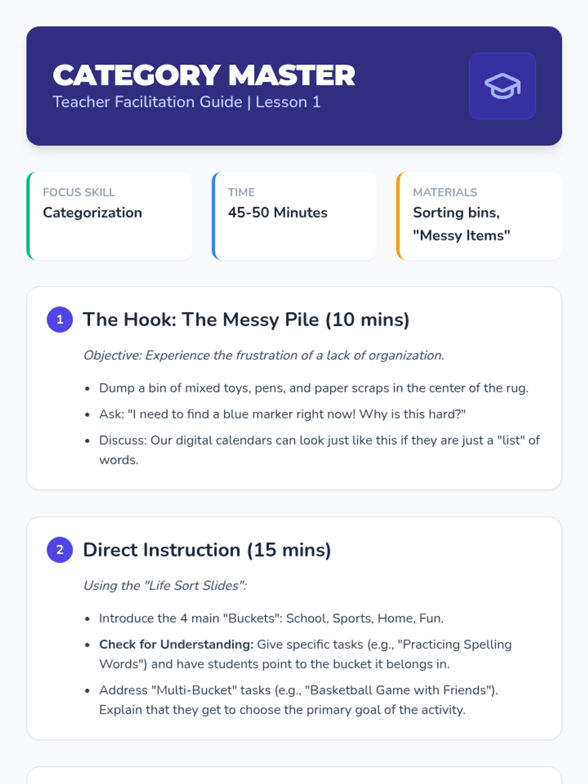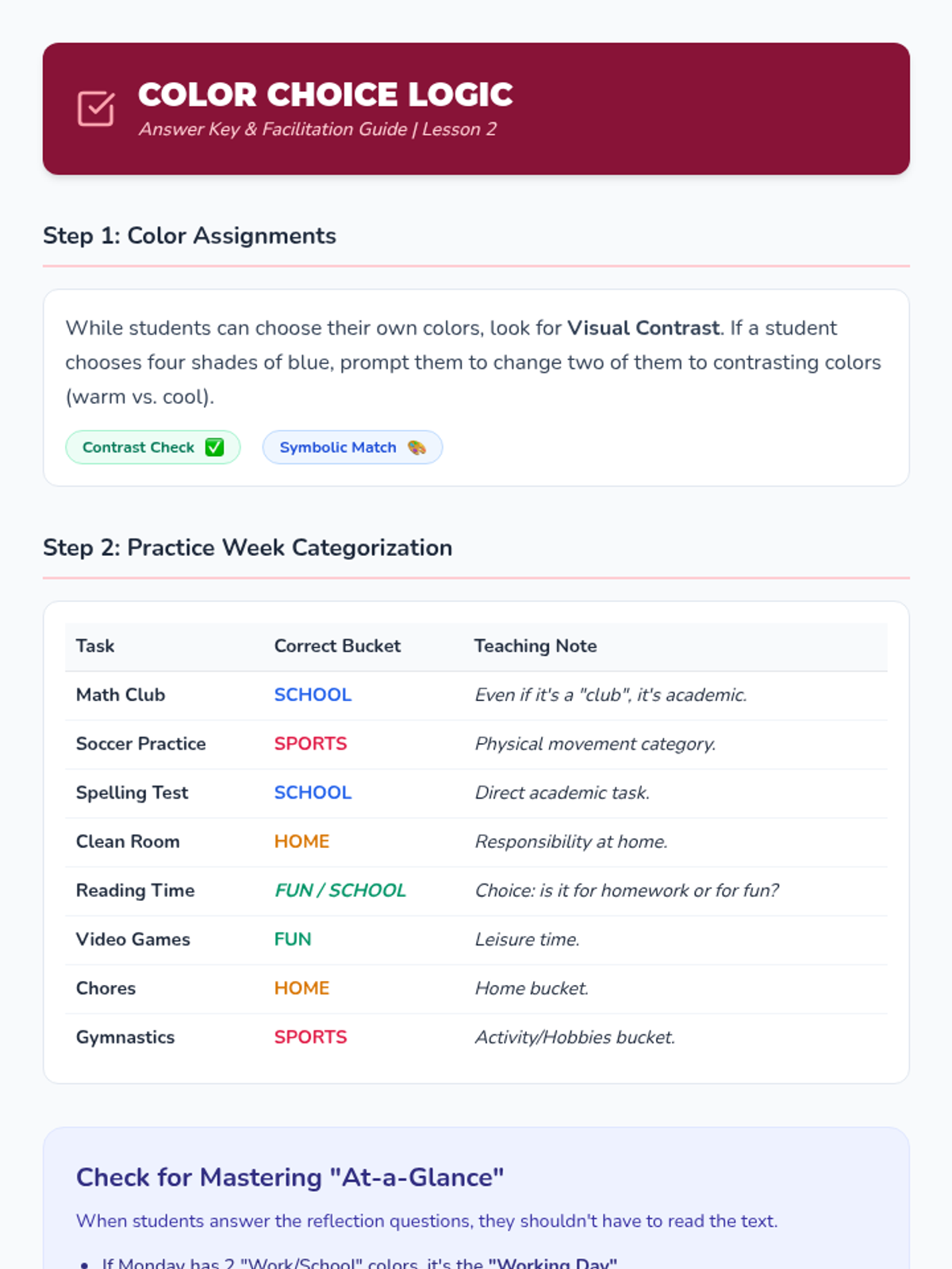 A 5-lesson sequence for 4th-grade students focusing on visual organization through color-coding, categorization, and icons within a digital calendar to support executive functioning and reduce cognitive load.