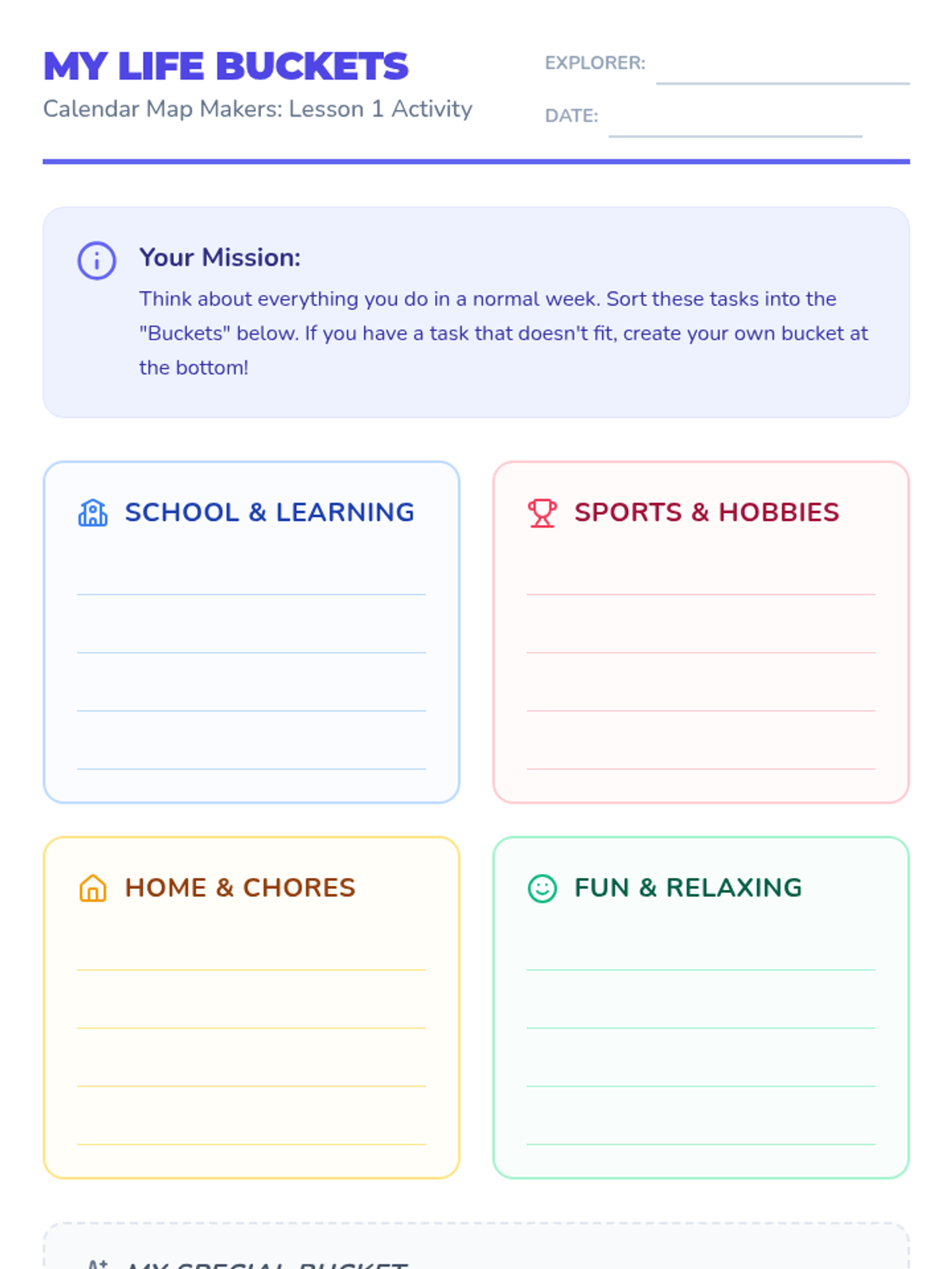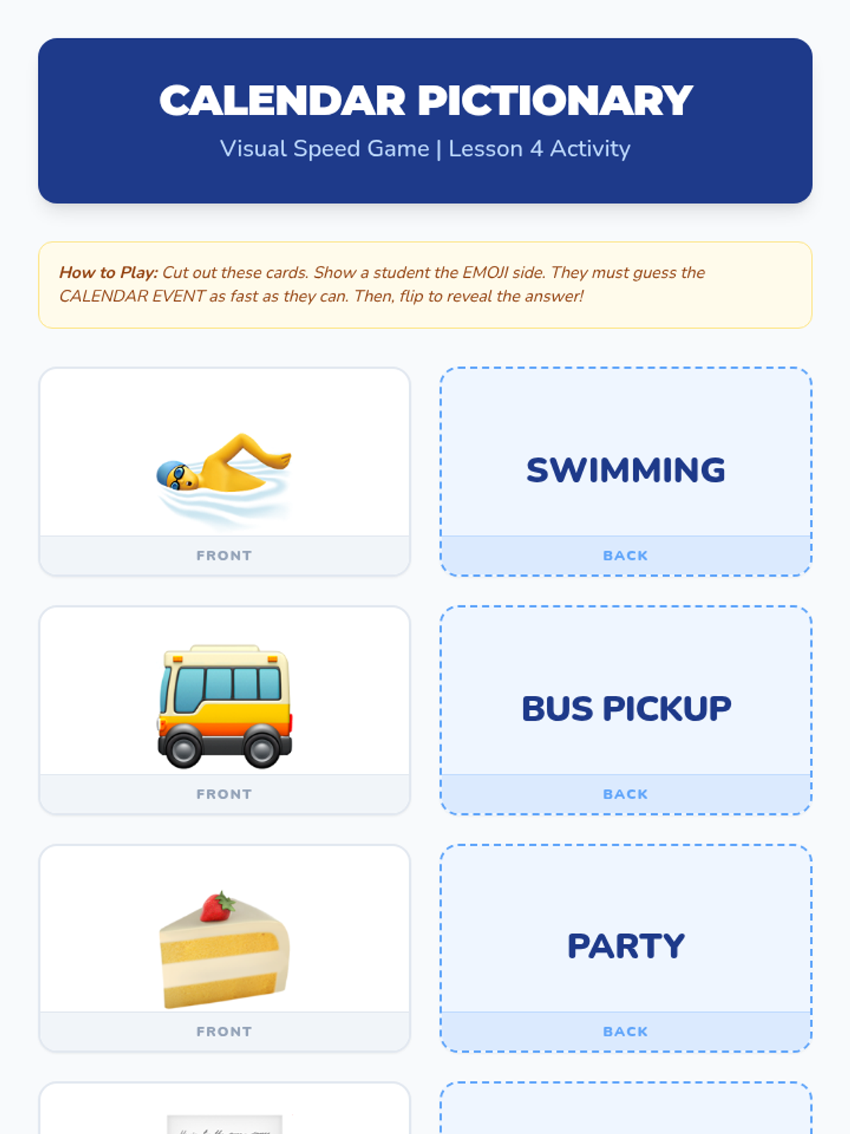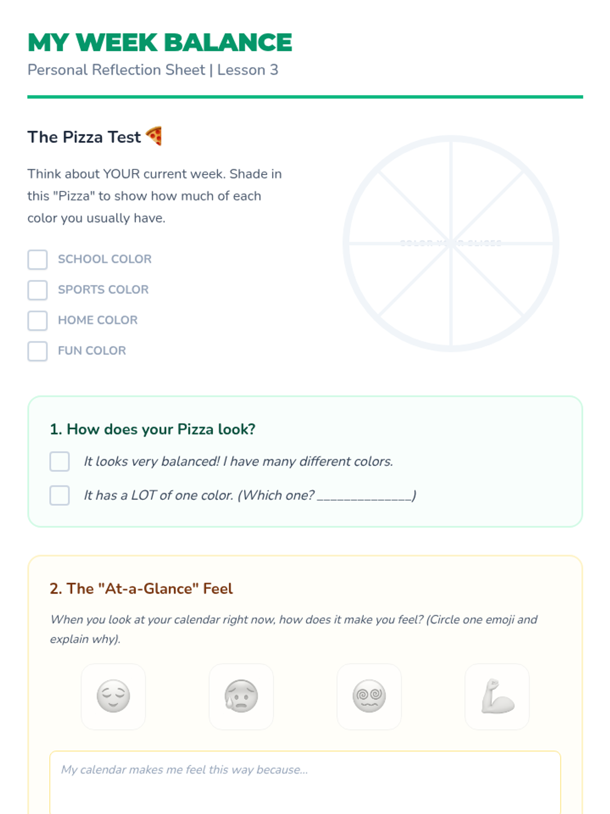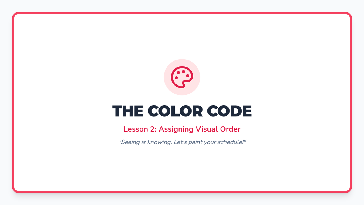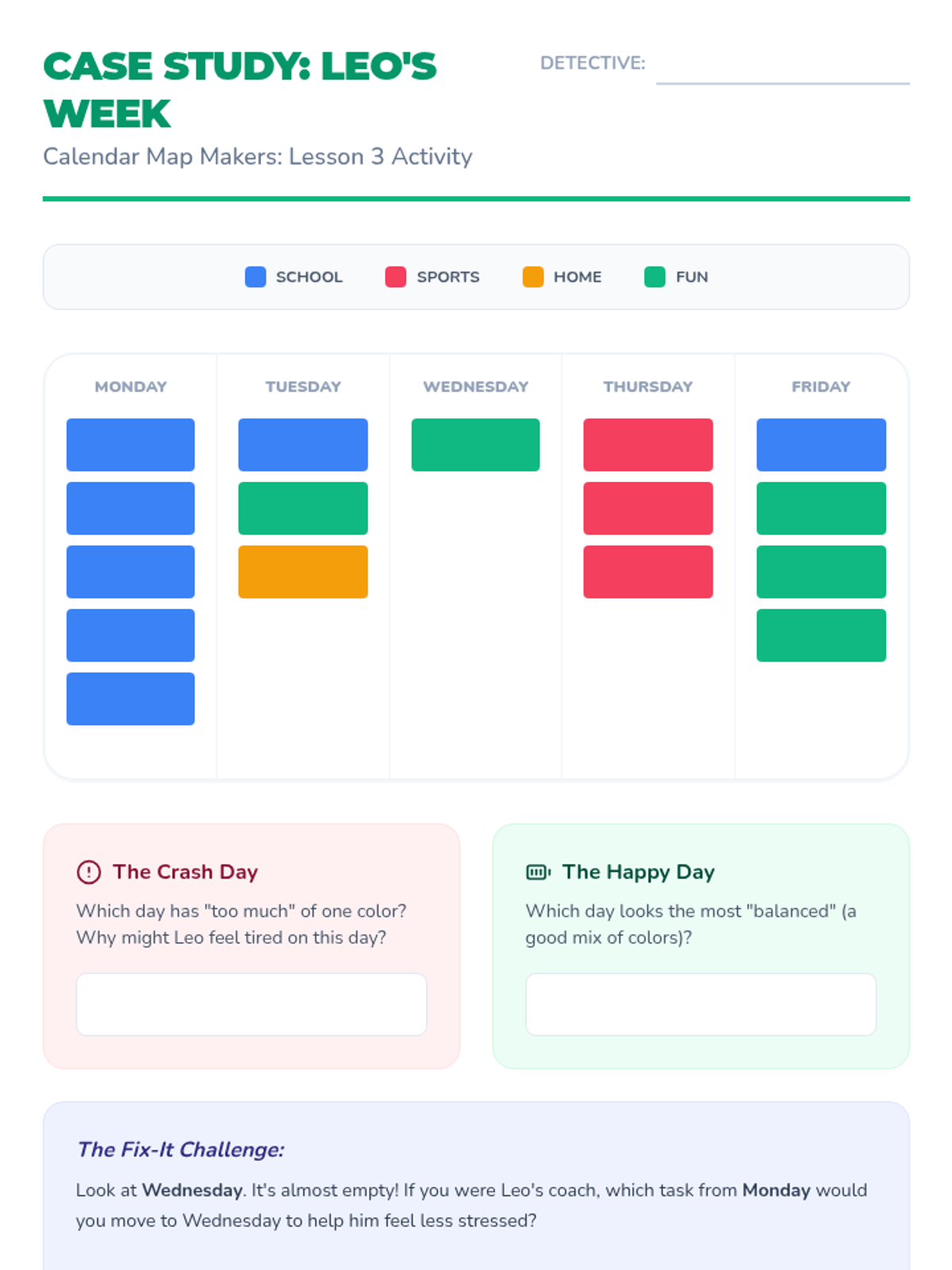 A 5-lesson sequence for 4th-grade students focusing on visual organization through color-coding, categorization, and icons within a digital calendar to support executive functioning and reduce cognitive load.