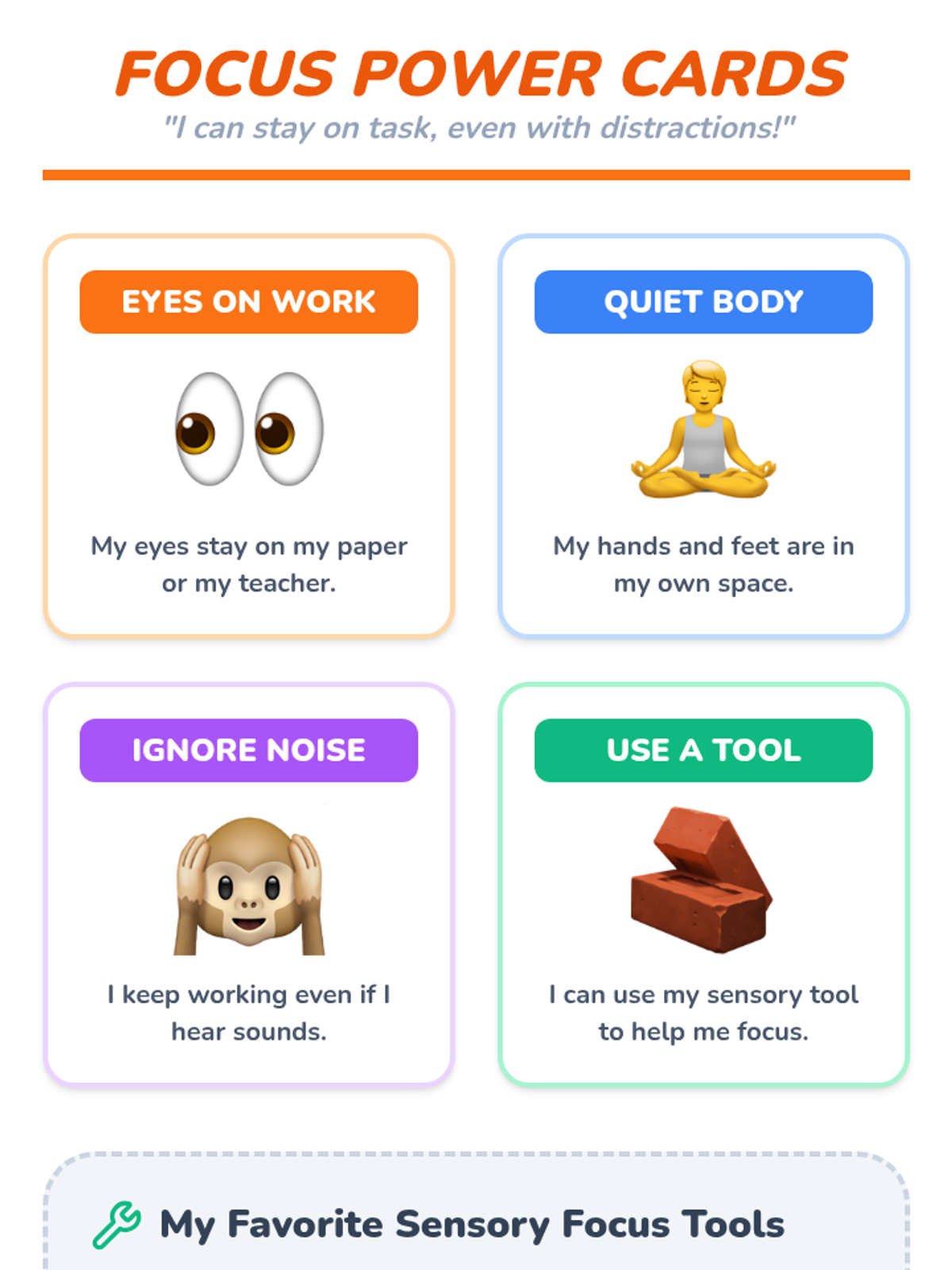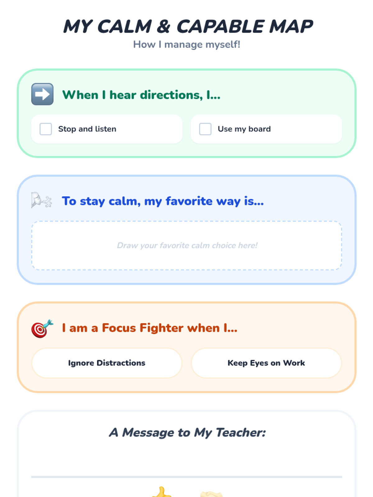 A 7-week MTSS self-management series for 1st grade multilingual learners, focusing on following directions, calming down, and staying focused using visual tools and sensory strategies.