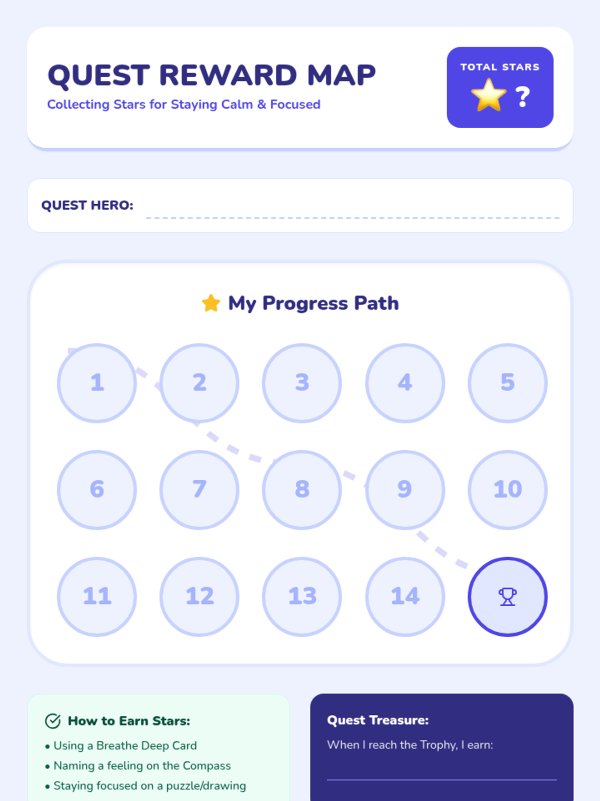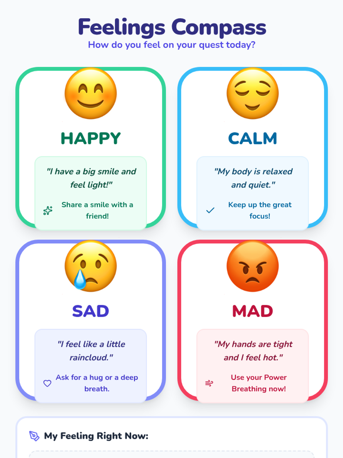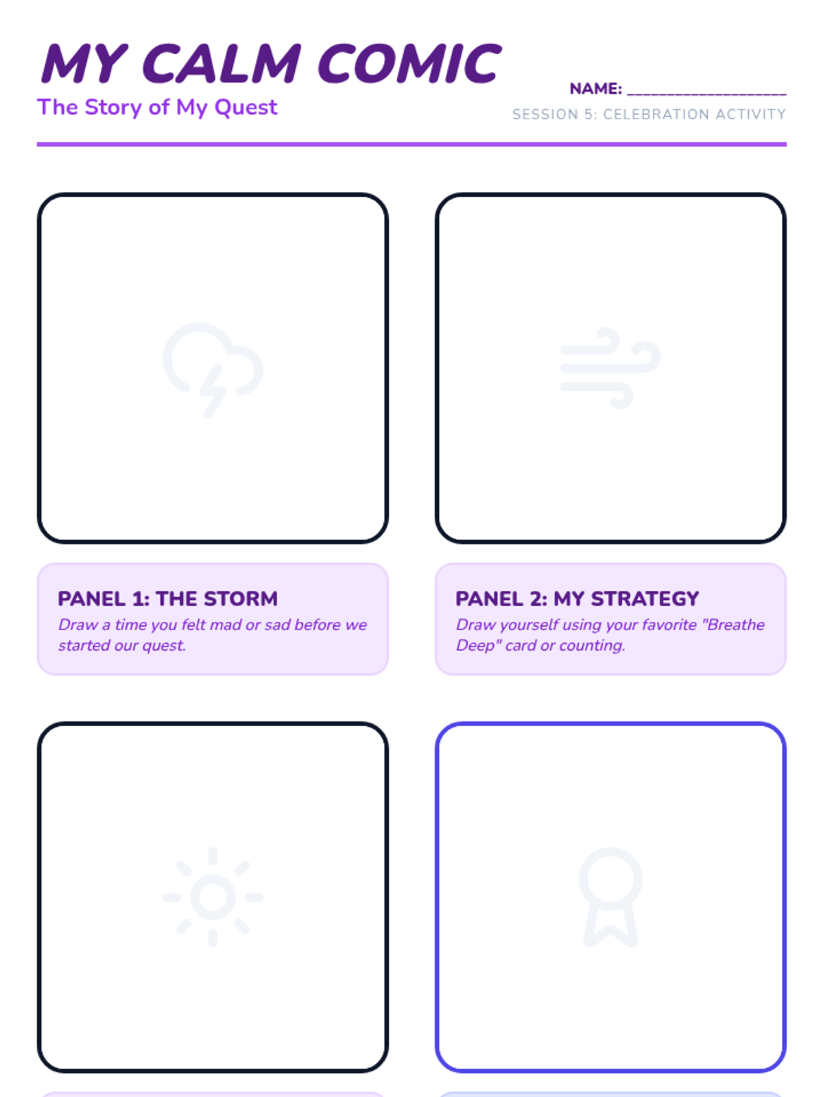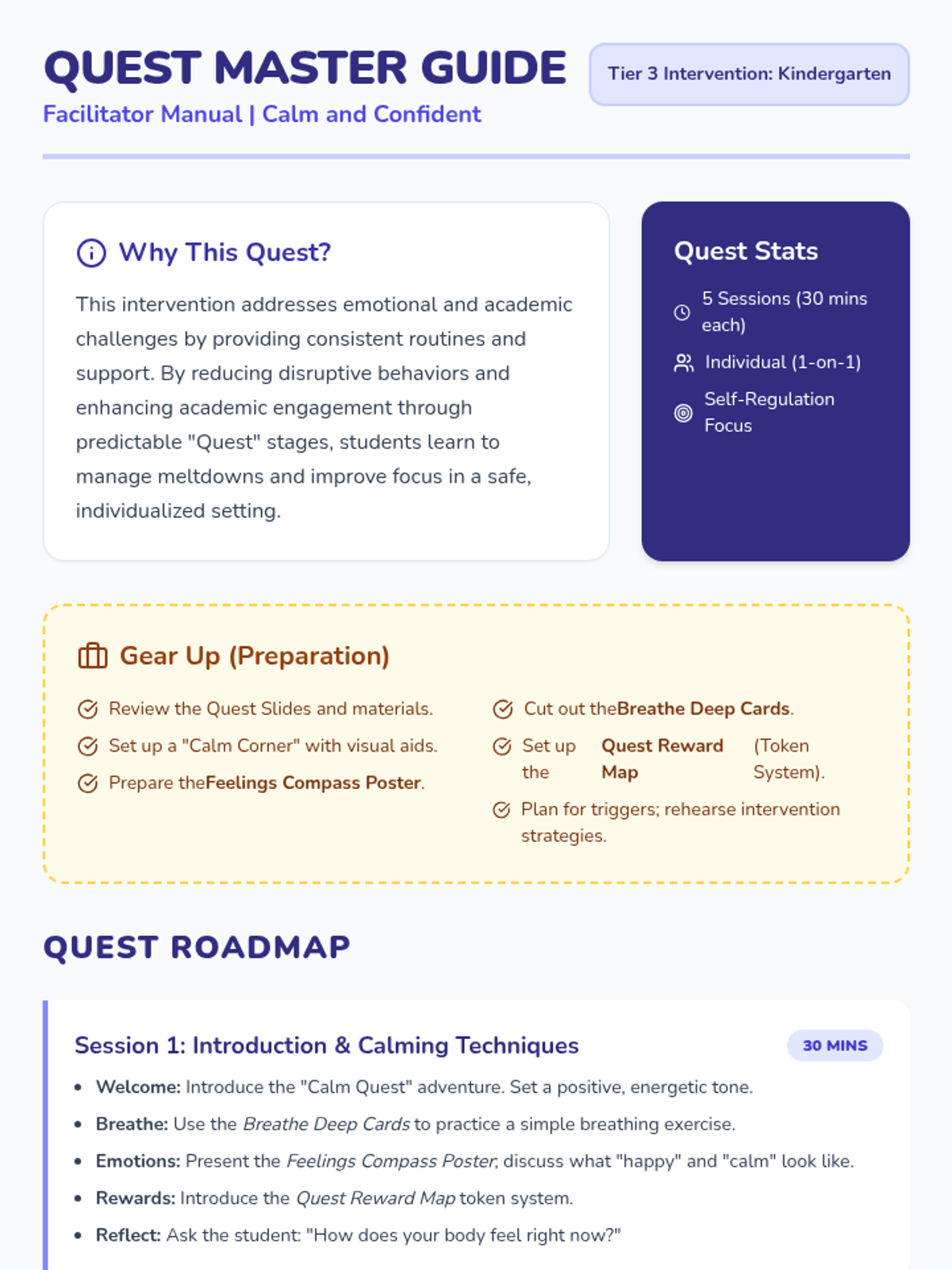 A 5-session Tier 3 intervention for kindergarteners focusing on emotional awareness, self-regulation, and positive behavior reinforcement through a quest-themed journey.