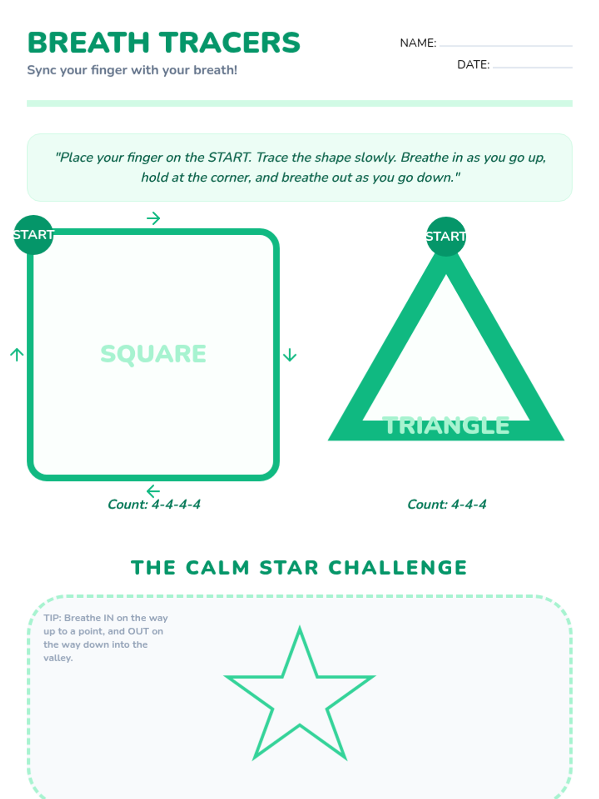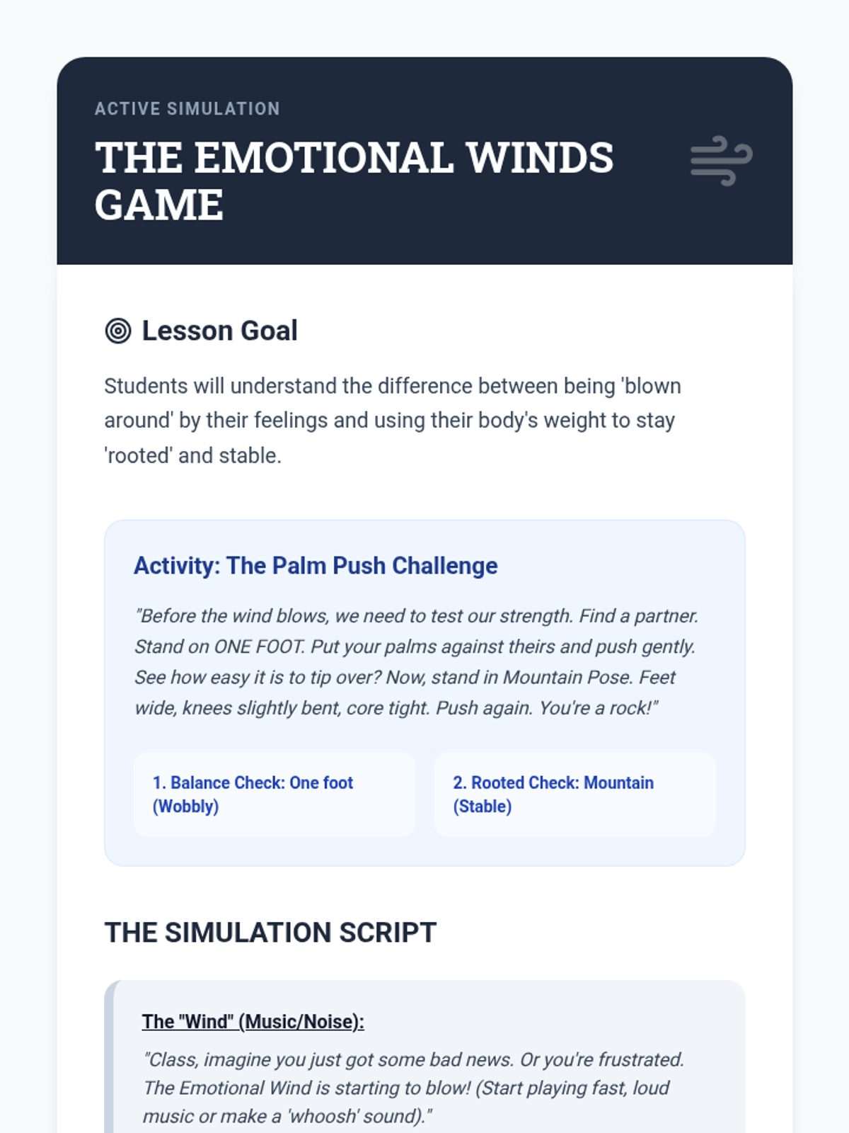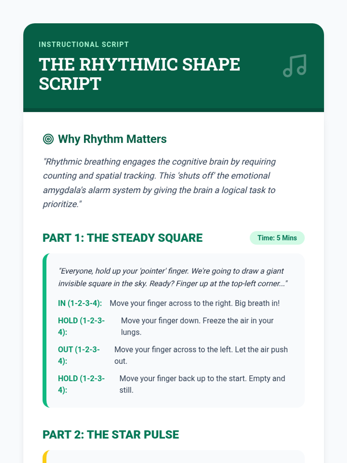 A 5-lesson sequence for 3rd grade students on physical regulation and breathing techniques to manage acute distress. Students learn belly breathing, rhythmic patterns, muscle relaxation, and postural grounding to create a personal toolkit for emotional stability.