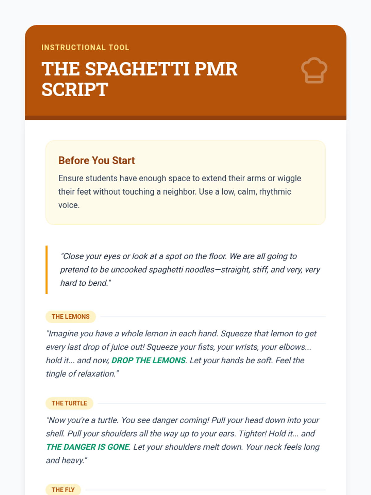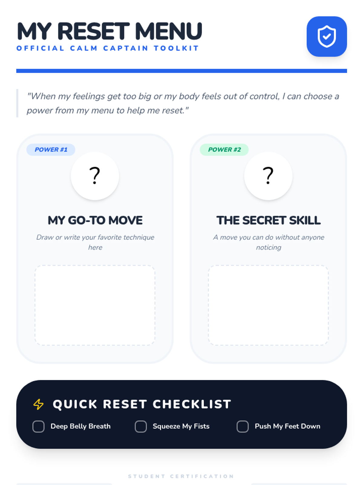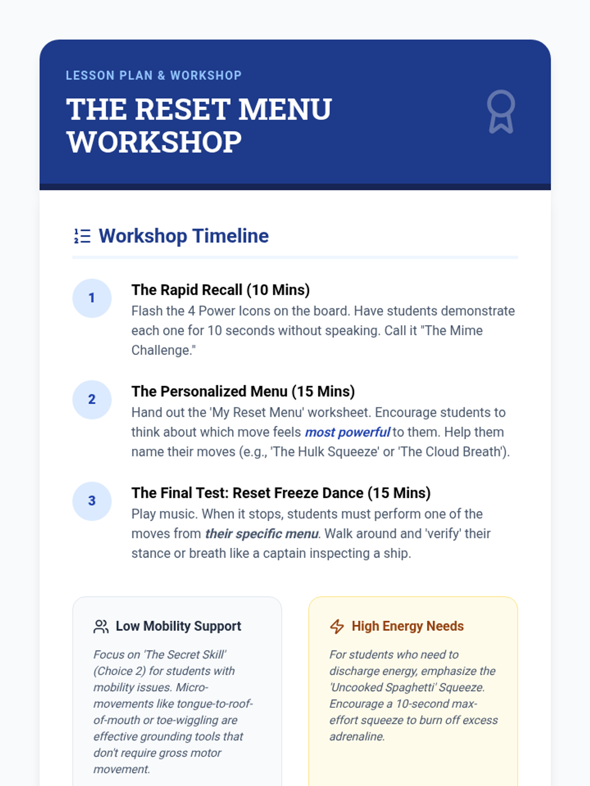 A 5-lesson sequence for 3rd grade students on physical regulation and breathing techniques to manage acute distress. Students learn belly breathing, rhythmic patterns, muscle relaxation, and postural grounding to create a personal toolkit for emotional stability.