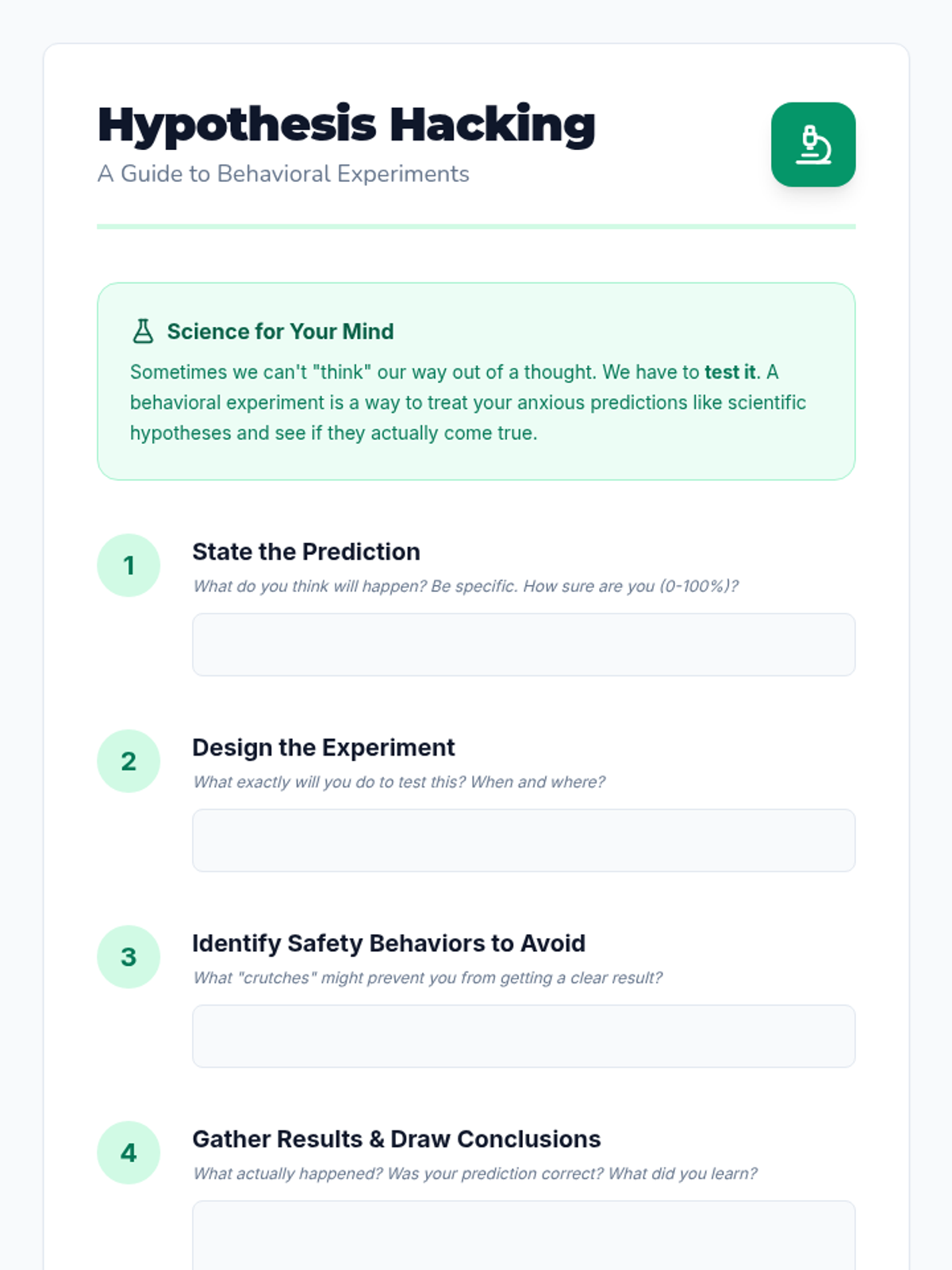 A comprehensive CBT toolkit for treating anxiety, covering cognitive restructuring, exposure therapy, behavioral experiments, and mindfulness. This sequence provides clinicians and clients with structured guides, tracking tools, and practical scenarios to build resilience and manage anxiety symptoms effectively.