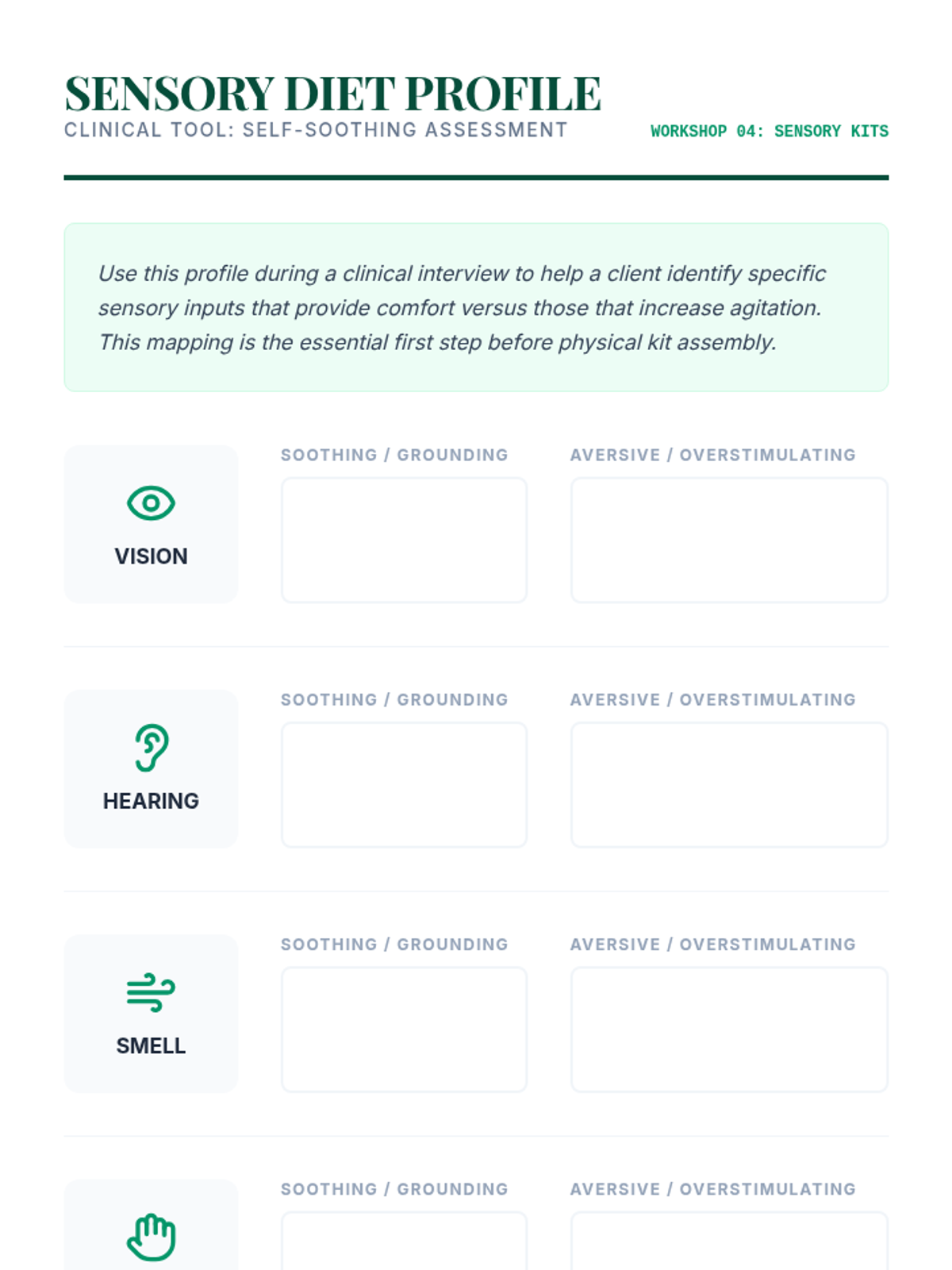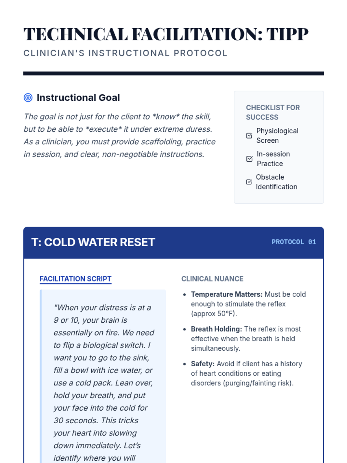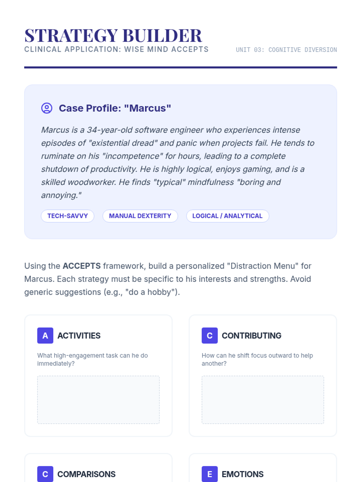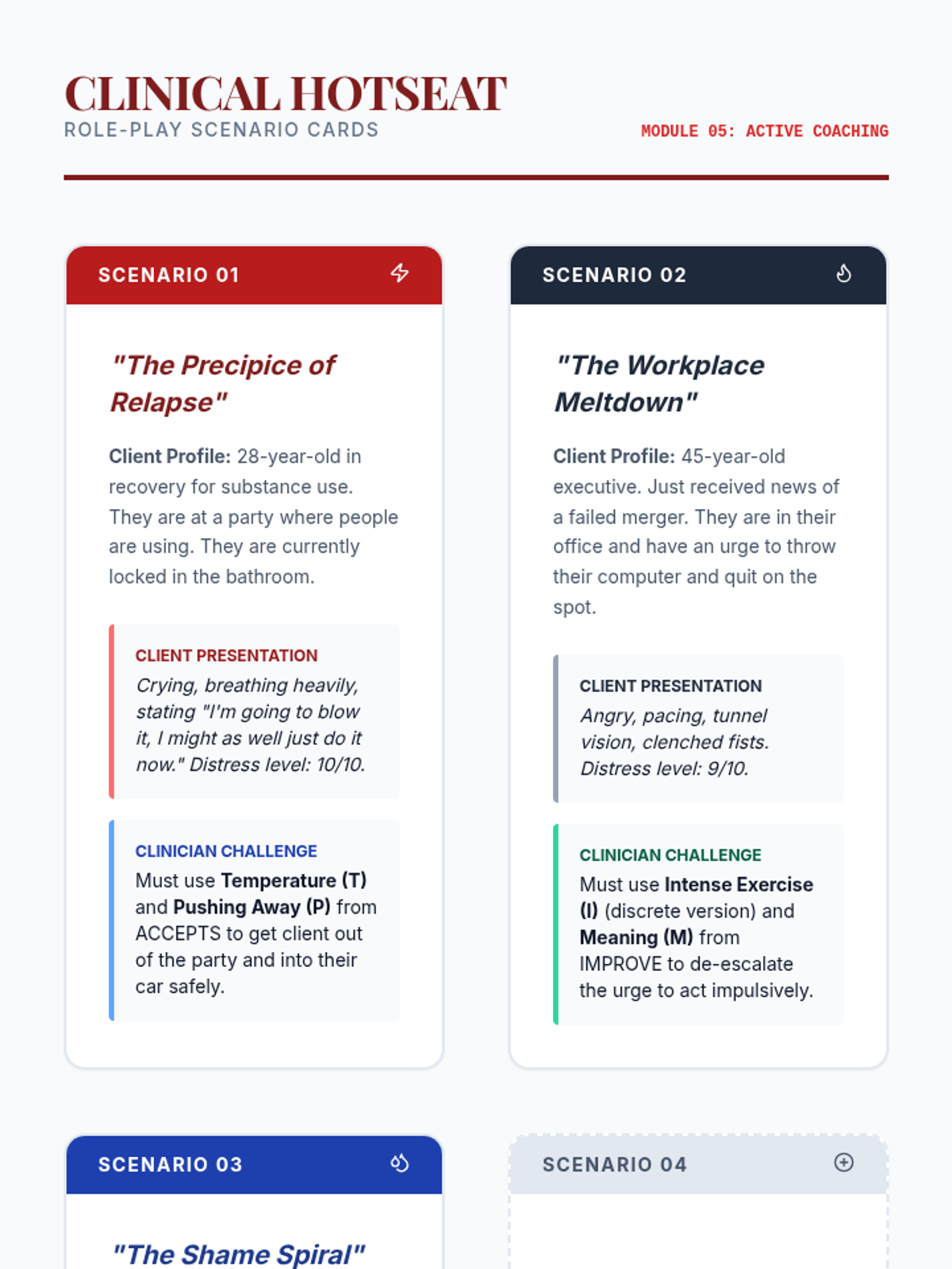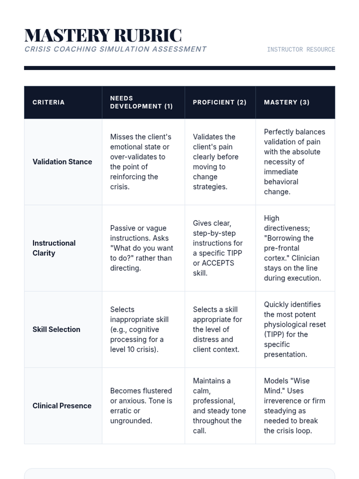 A graduate-level clinical workshop sequence focused on mastering Dialectical Behavior Therapy (DBT) distress tolerance skills. Students move from theory to practical application, learning to coach clients through crisis survival using TIPP, ACCEPTS, IMPROVE, and Self-Soothing techniques.