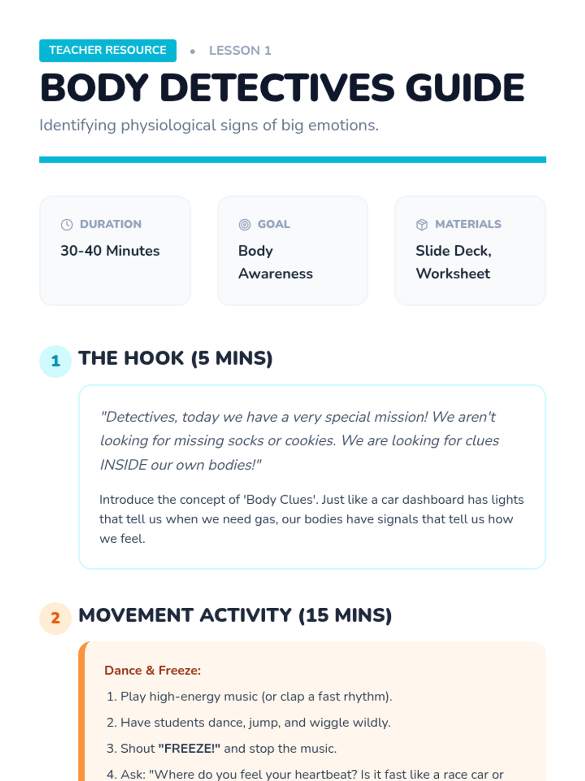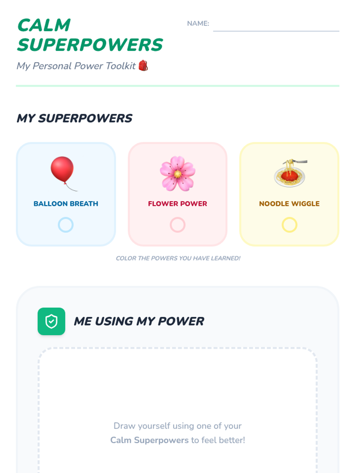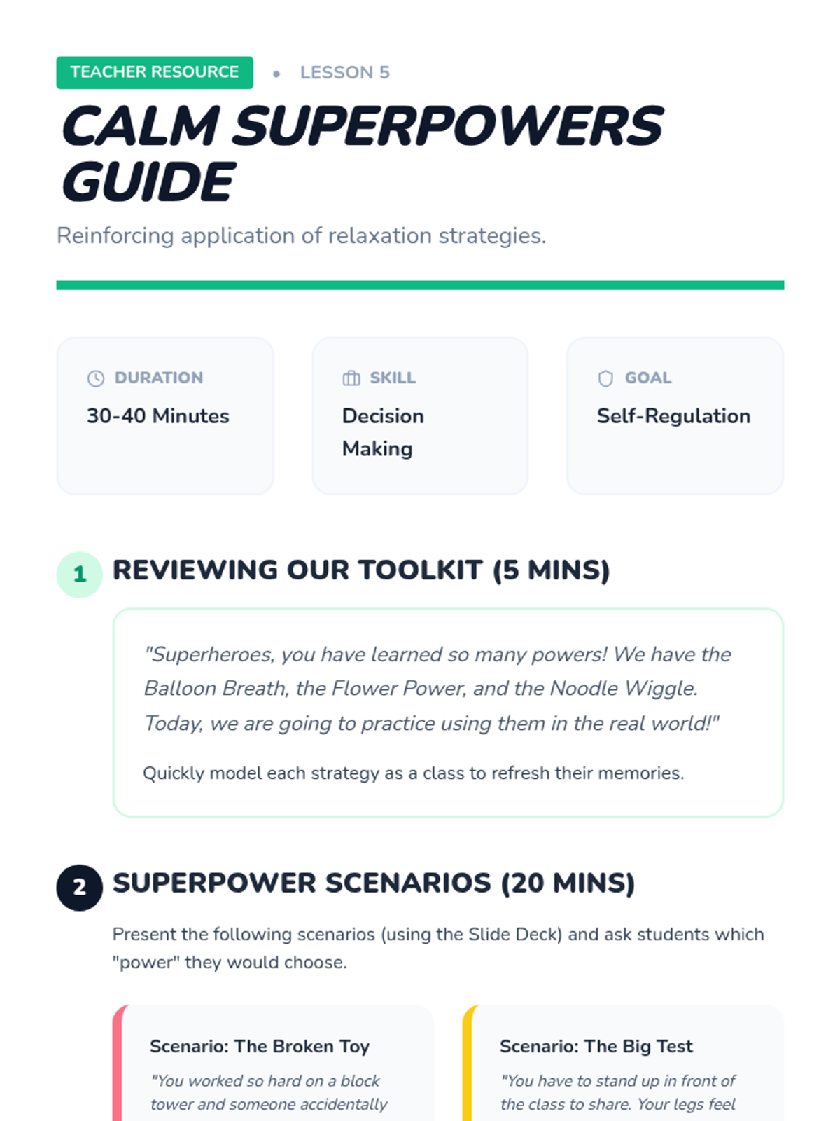A Kindergarten sequence focused on teaching children to recognize physiological signs of big emotions and use breathing and muscle relaxation techniques to self-regulate. Through playful metaphors like balloons and spaghetti, students build a toolkit of 'calm superpowers' for daily use.