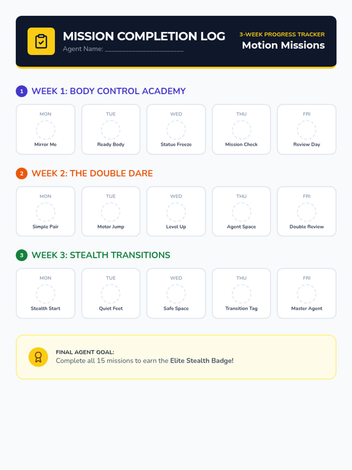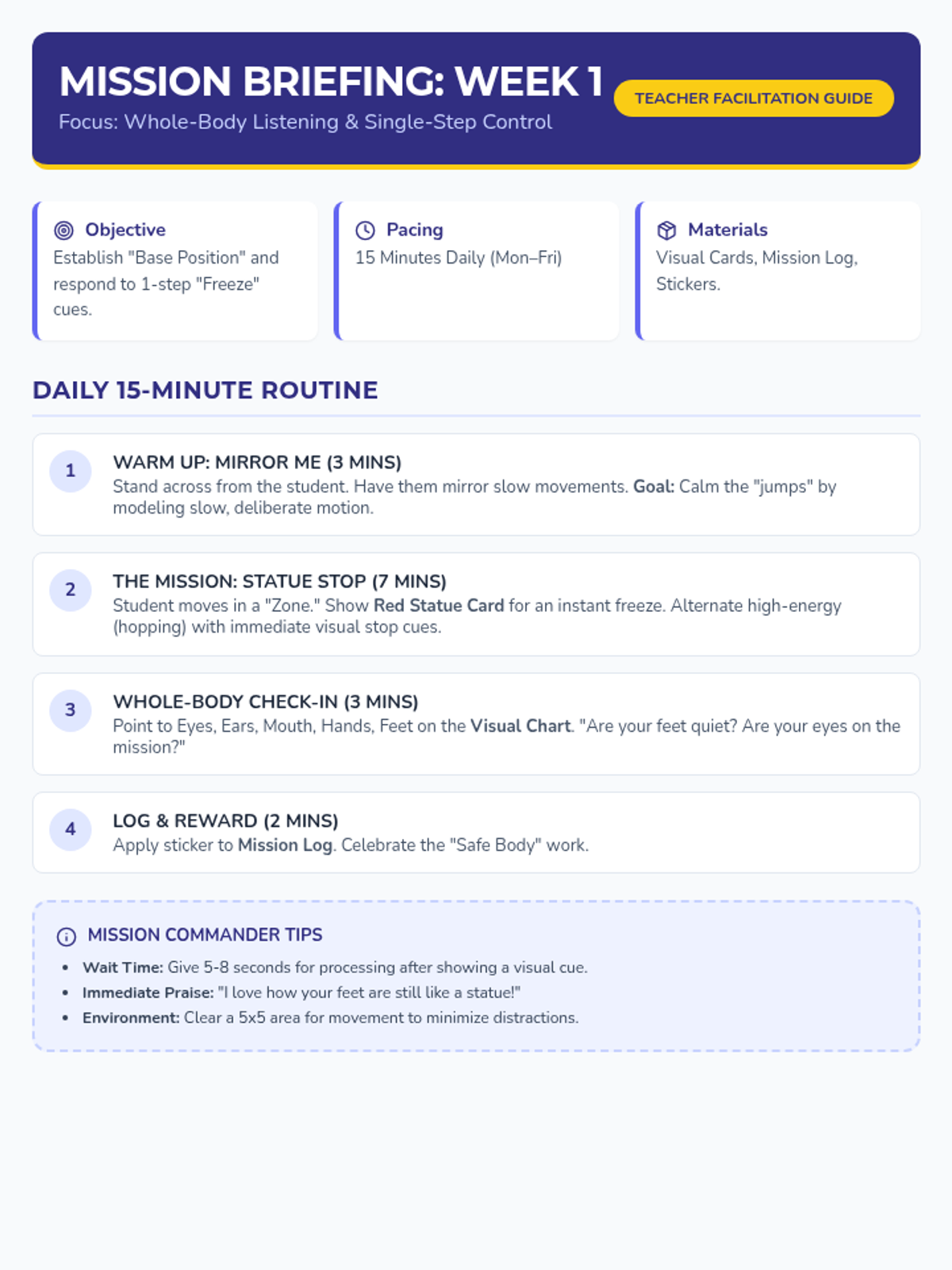 A 3-week intensive program designed for active 1st-grade students with autism to improve whole-body listening, motor direction following, and safe transitions through structured 'Motion Missions'. Each week builds on physical self-regulation skills using visual cues and play-based movement.