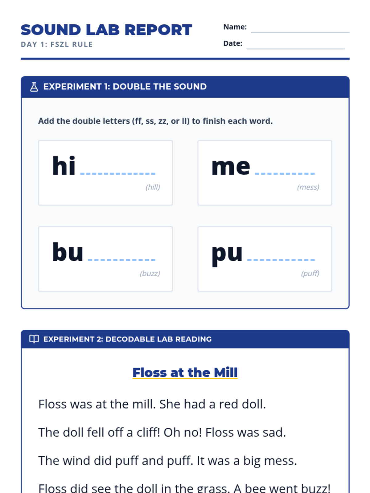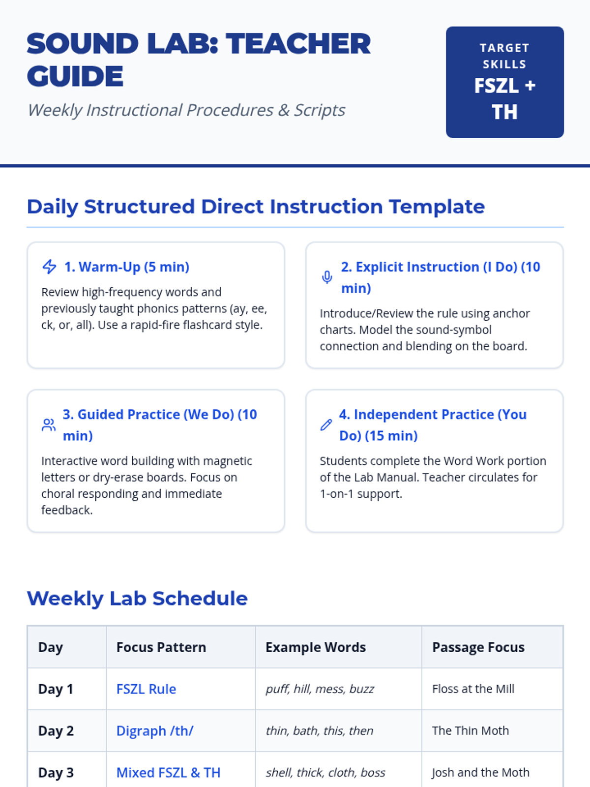 A five-day intensive review unit for second-grade students focusing on the FSZL (Floss) rule and the /th/ consonant digraph. Designed for structured direct instruction in a special education setting, utilizing a 'Sound Lab' theme to engage students in decoding and word-building experiments.