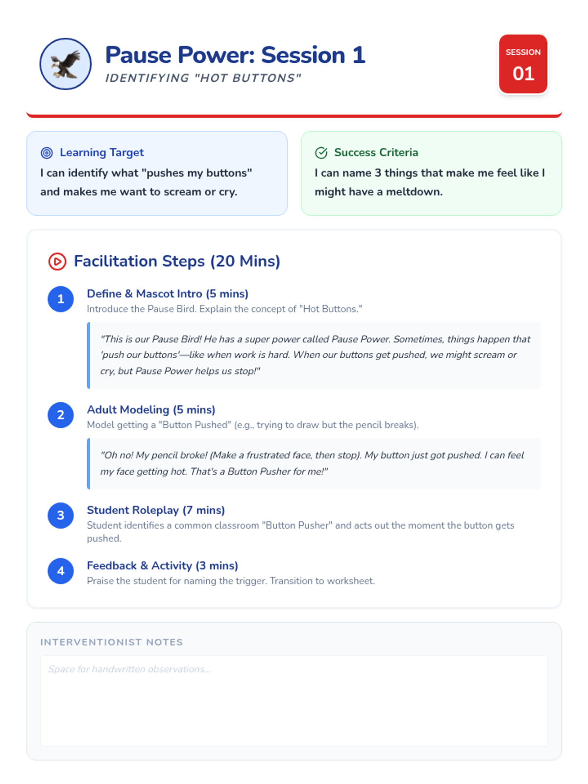 An intensive 10-session behavior intervention for K-2 students focused on emotional regulation and using the Pause Power framework to replace meltdowns with functional break-taking skills.