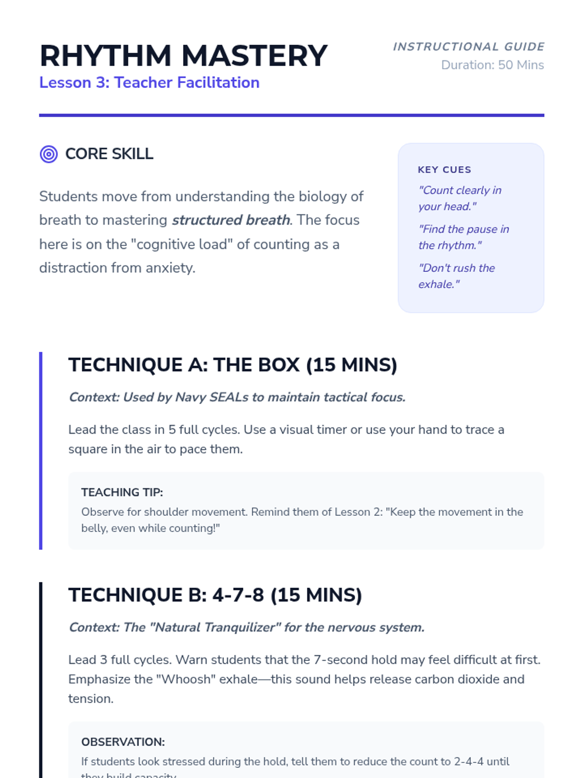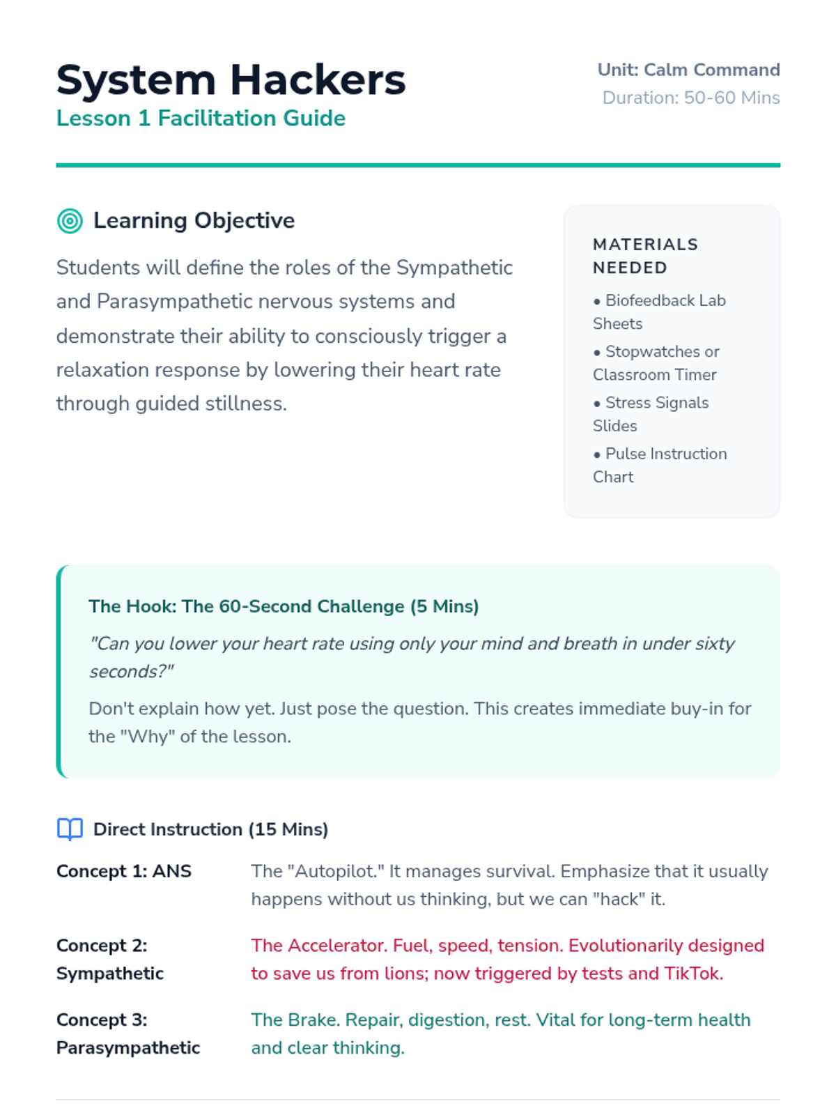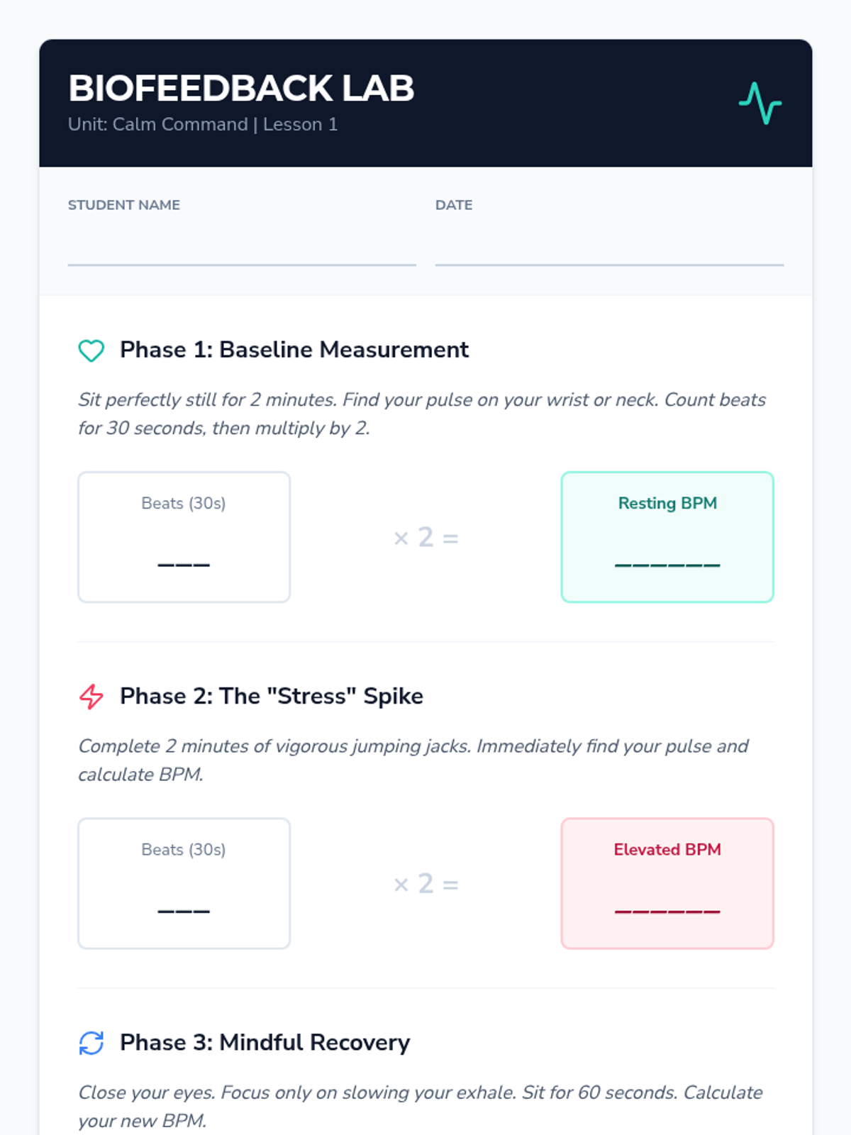 A comprehensive 7th-grade unit on physiological self-regulation, focusing on the biology of stress, diaphragmatic breathing, rhythmic patterns, and progressive muscle relaxation. Students learn to 'hack' their nervous systems to manage academic and social pressure.