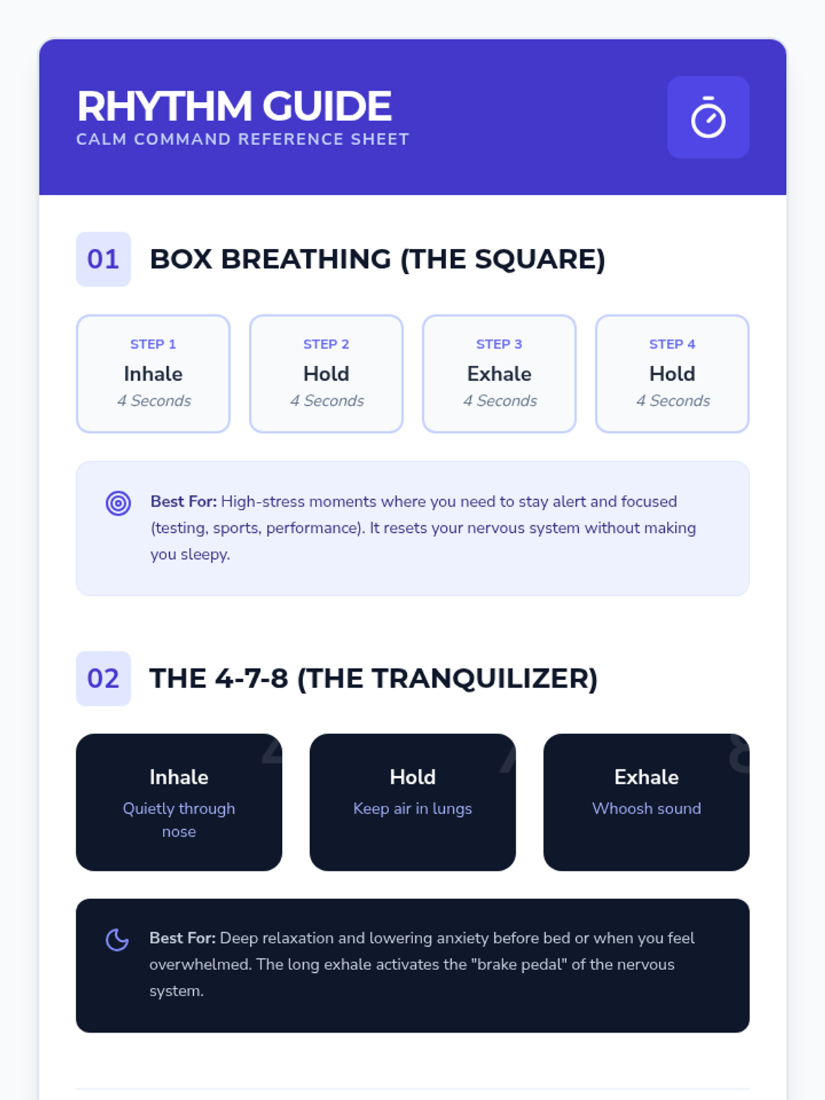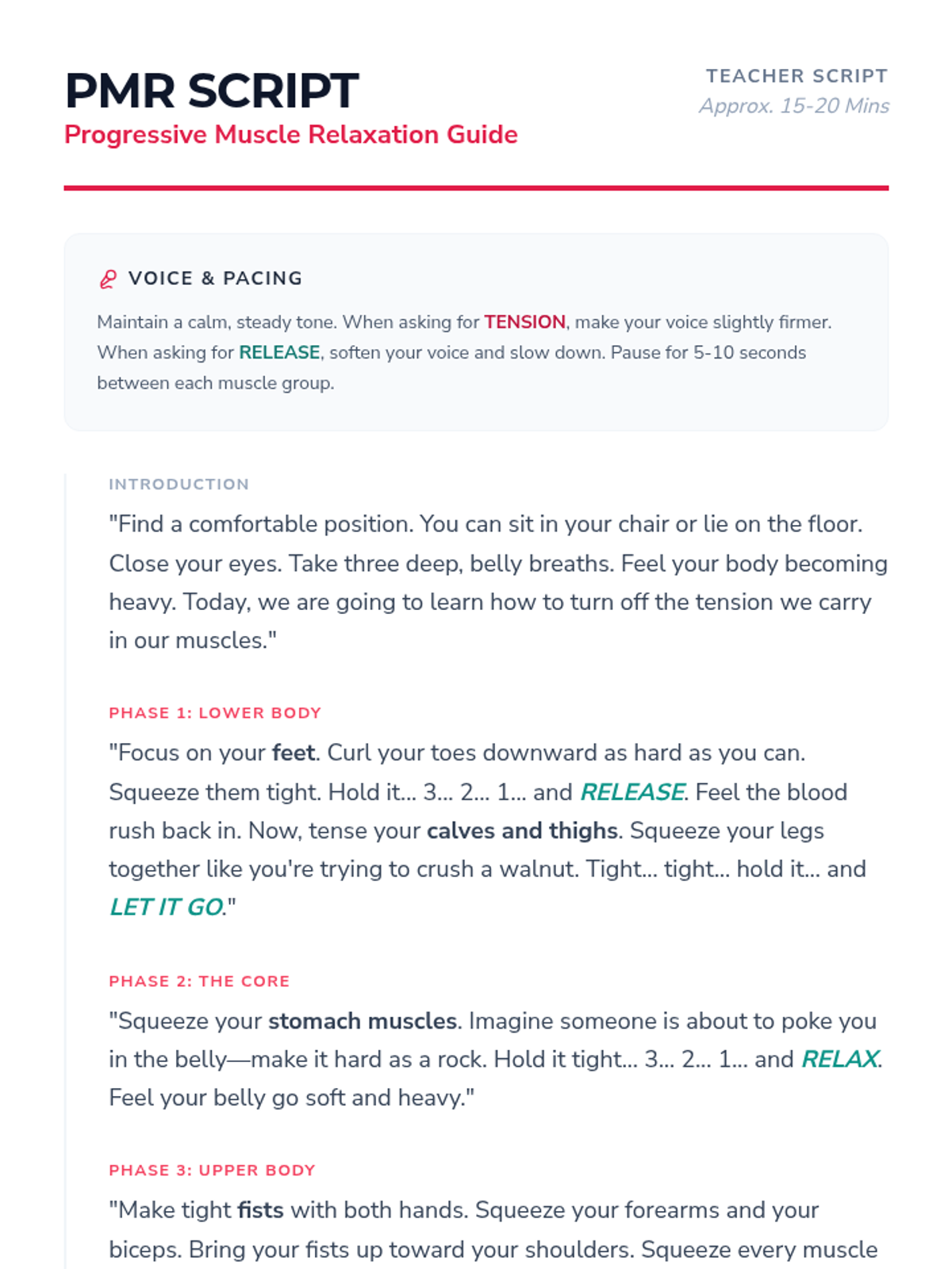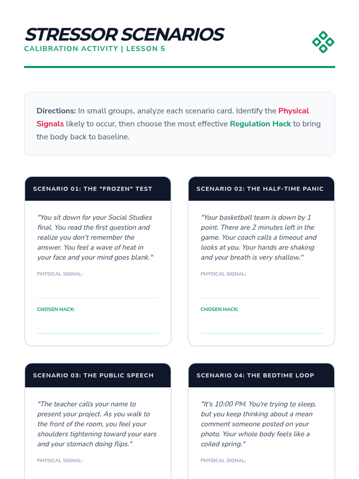 A comprehensive 7th-grade unit on physiological self-regulation, focusing on the biology of stress, diaphragmatic breathing, rhythmic patterns, and progressive muscle relaxation. Students learn to 'hack' their nervous systems to manage academic and social pressure.