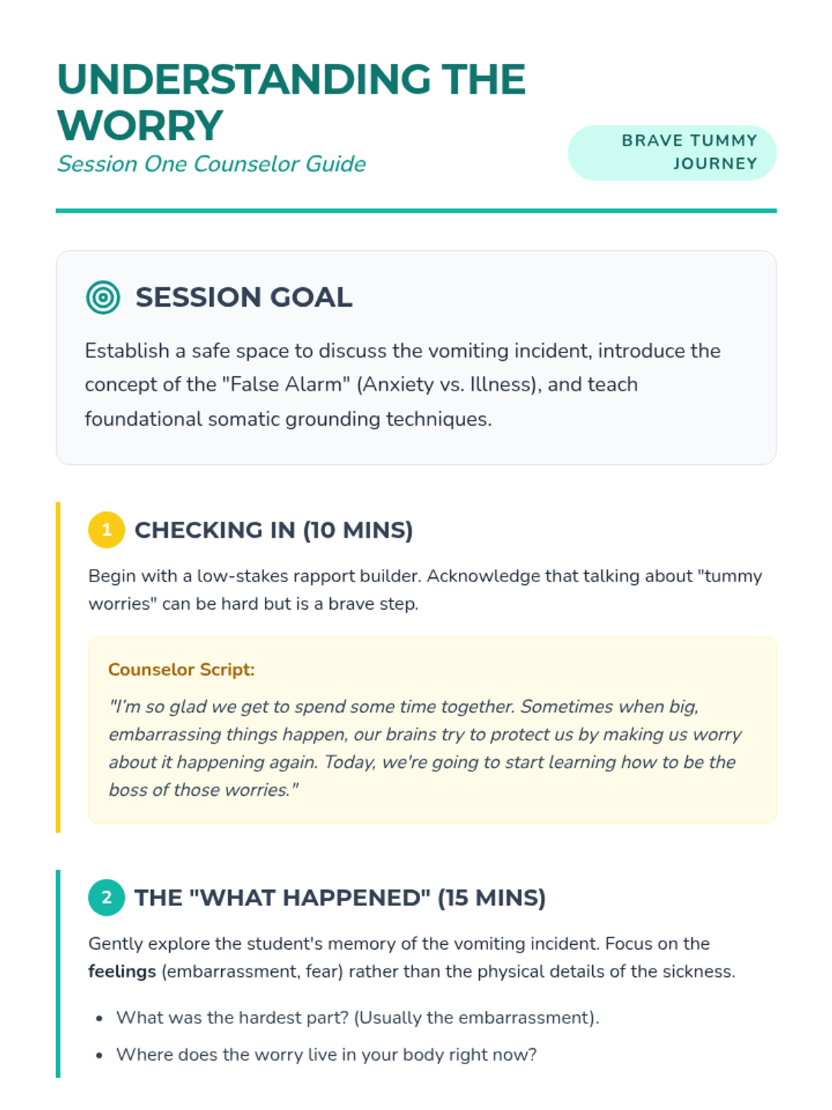 A 3-session individual counseling intervention designed for a 5th-grade girl struggling with emetophobia (fear of vomiting) following an embarrassing incident. The sequence uses cognitive-behavioral strategies, somatic grounding, and cognitive reframing to build resilience and reduce avoidance.