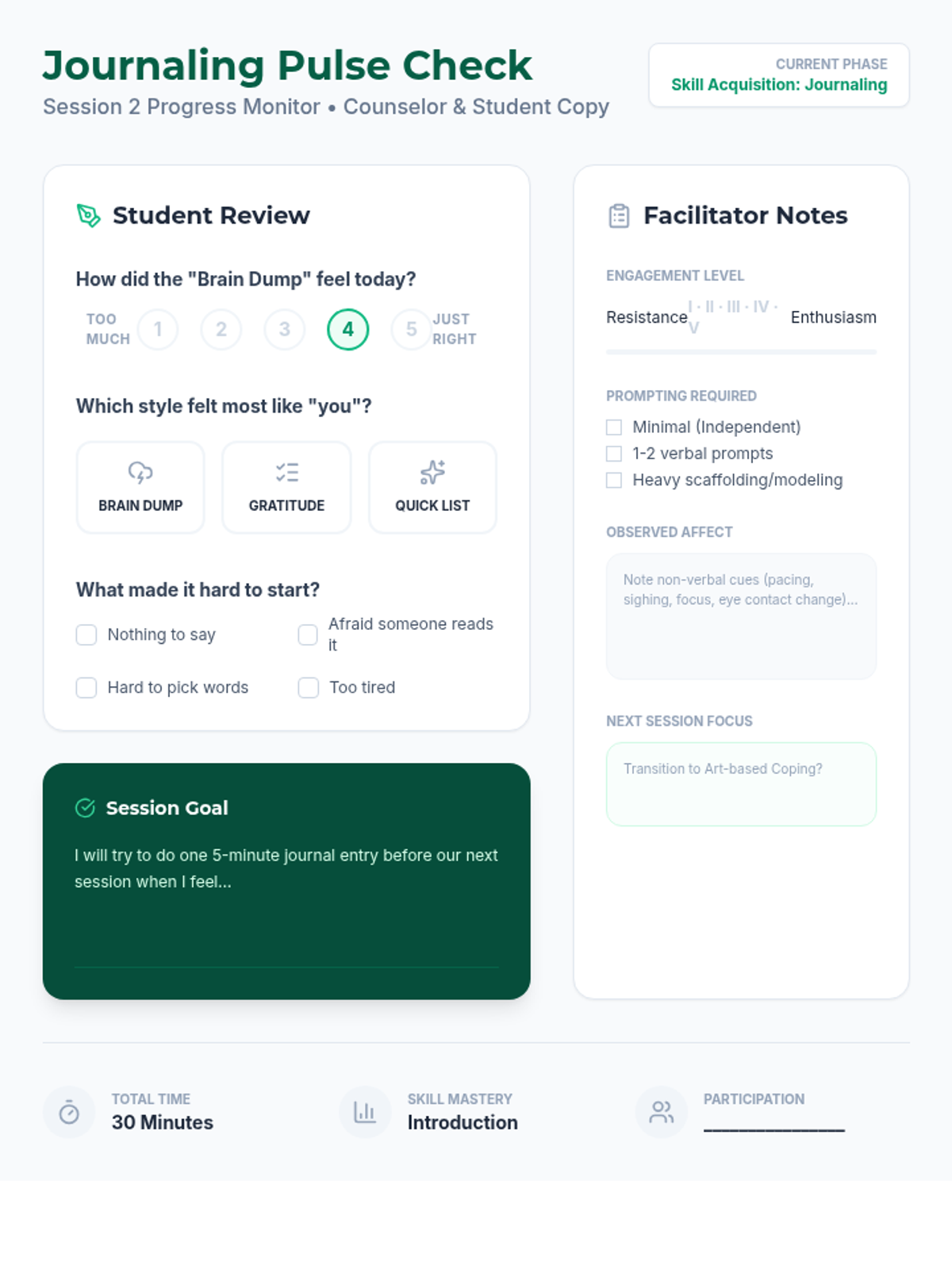 A four-part therapeutic sequence designed to help quiet students develop and implement coping skills for anxiety and depression, focusing on seeking support, journaling, and creative expression.