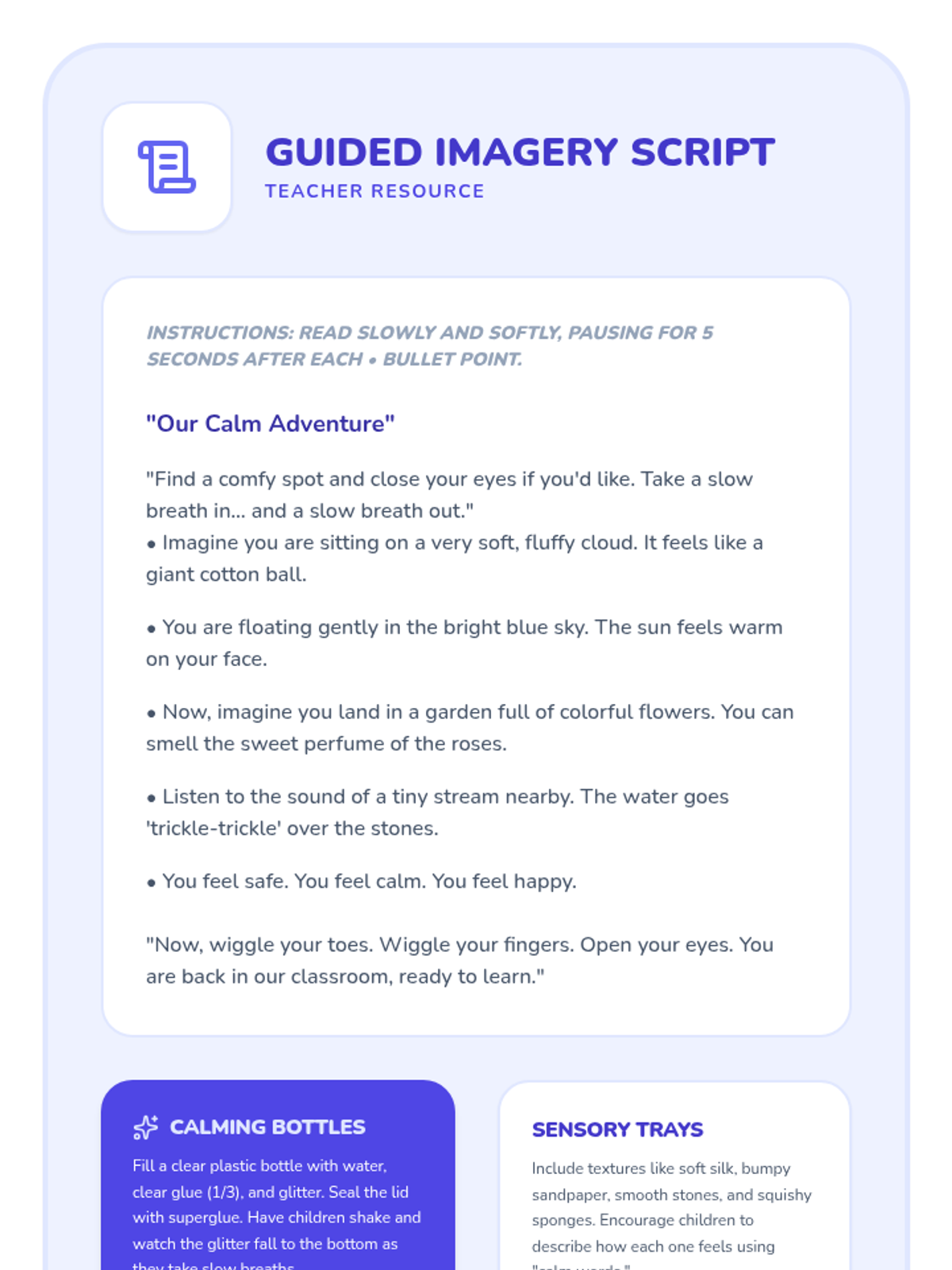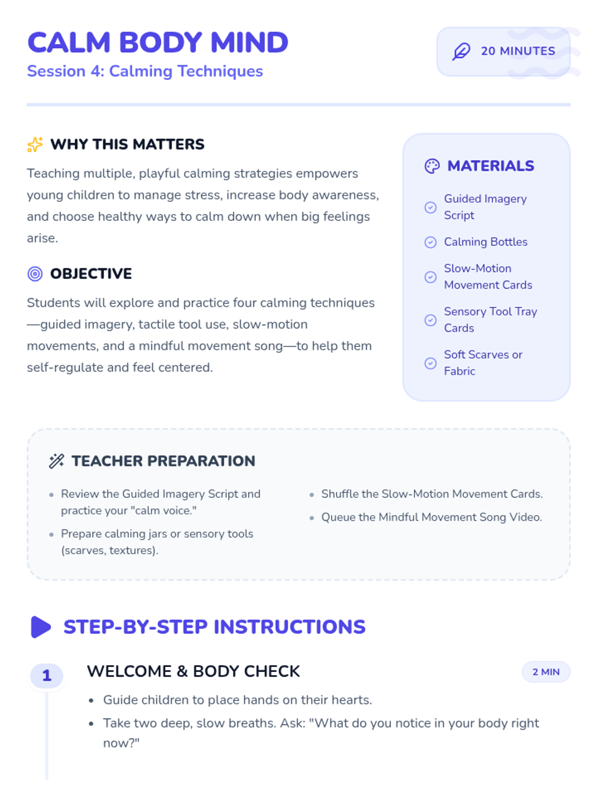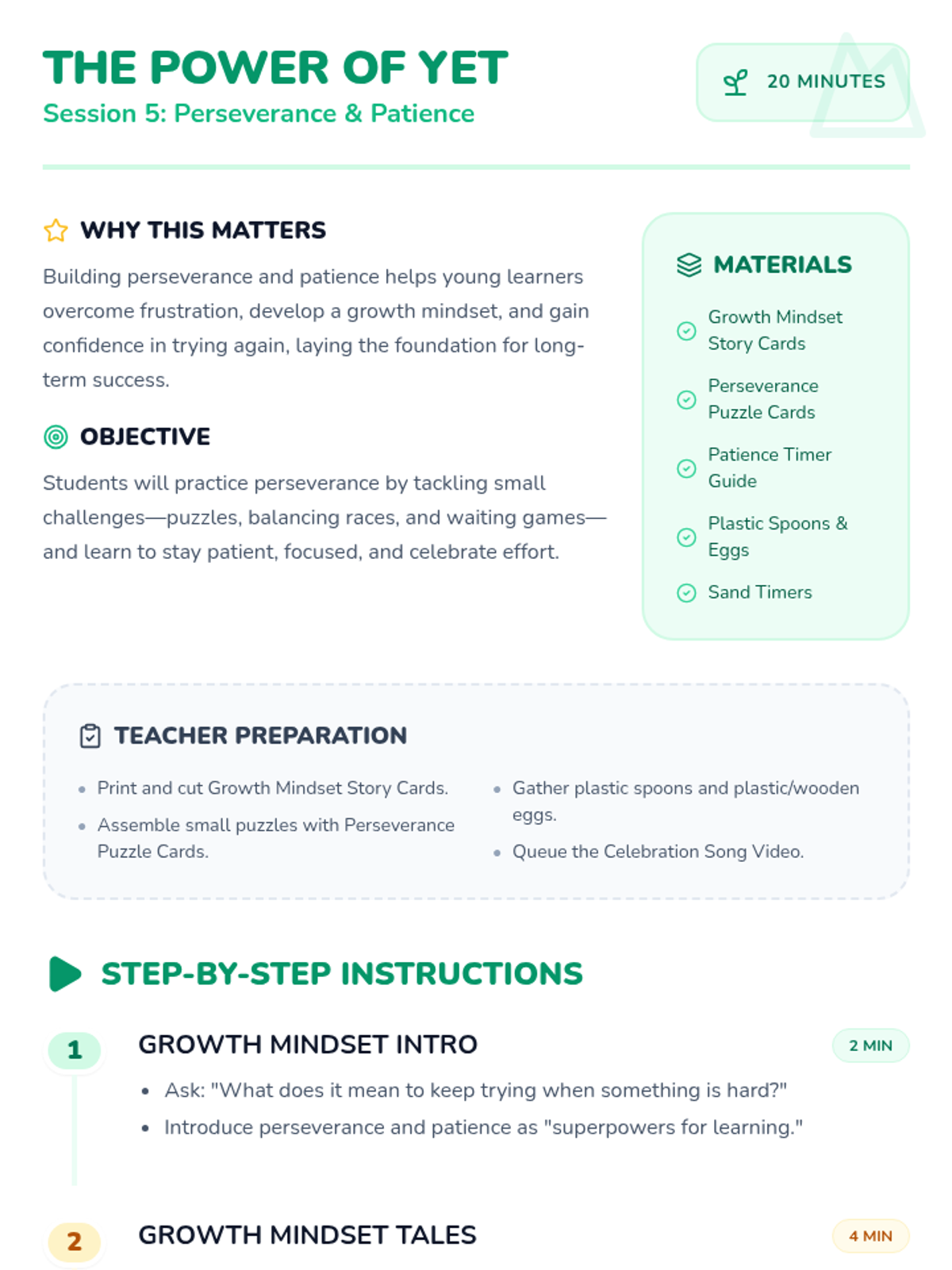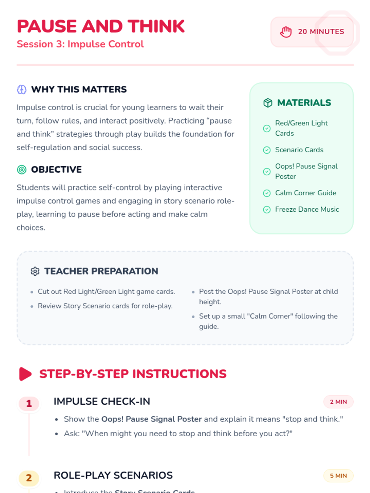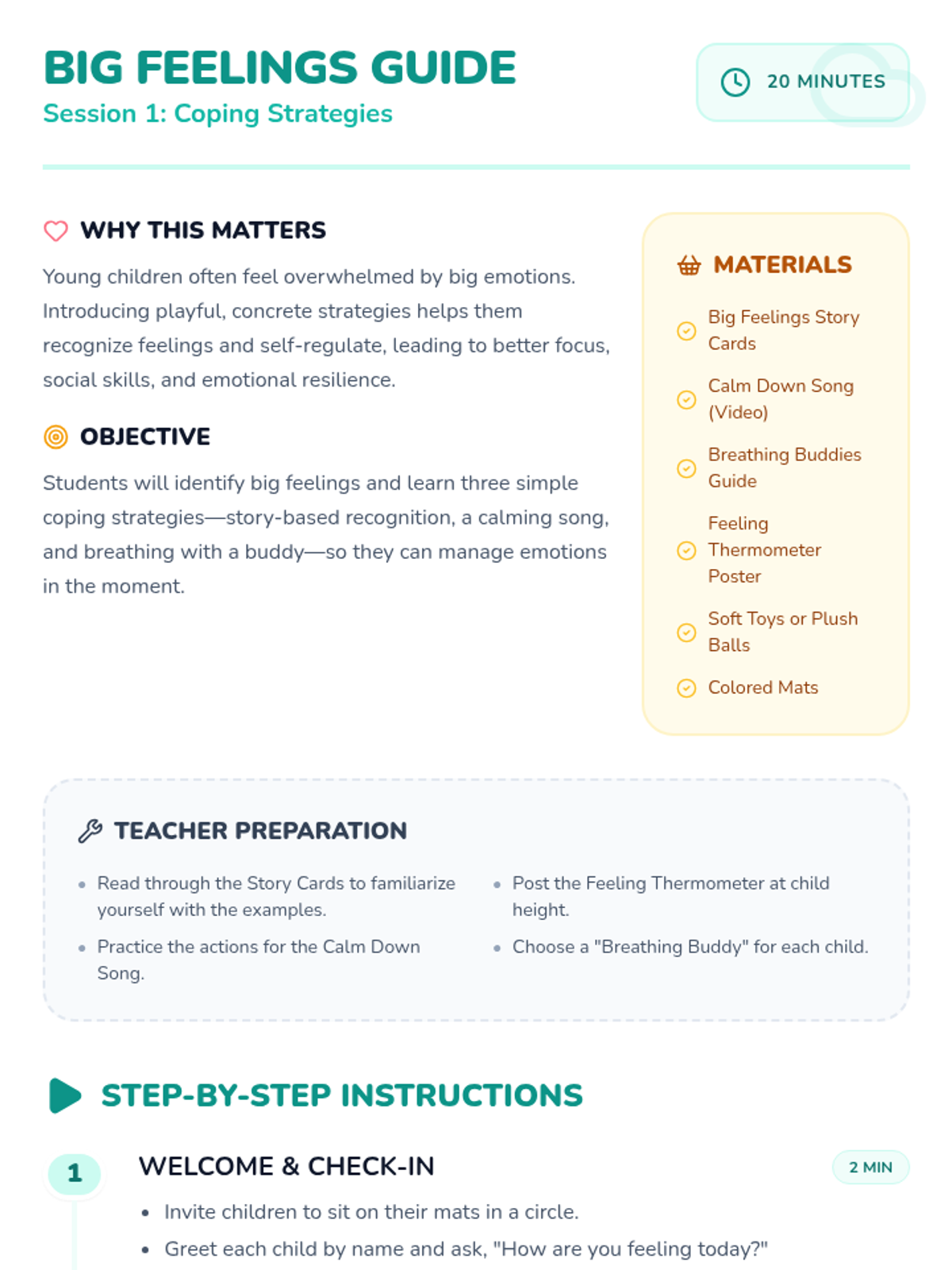 A five-session social-emotional learning series for PreK–Kindergarten focusing on self-management. Students learn coping strategies, routines, impulse control, calming techniques, and perseverance through interactive activities.