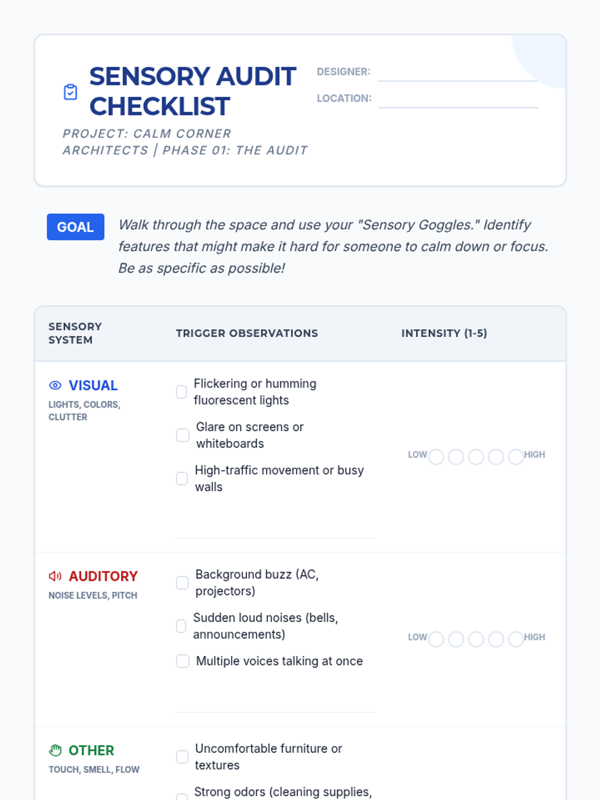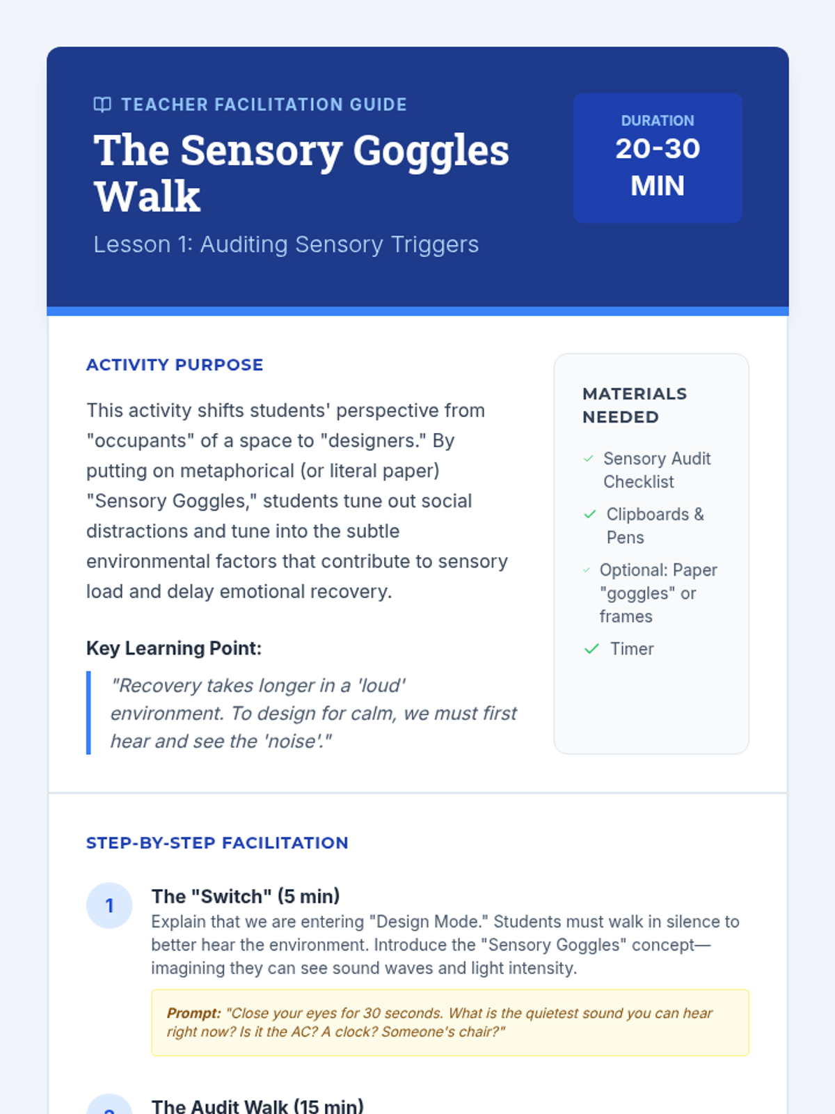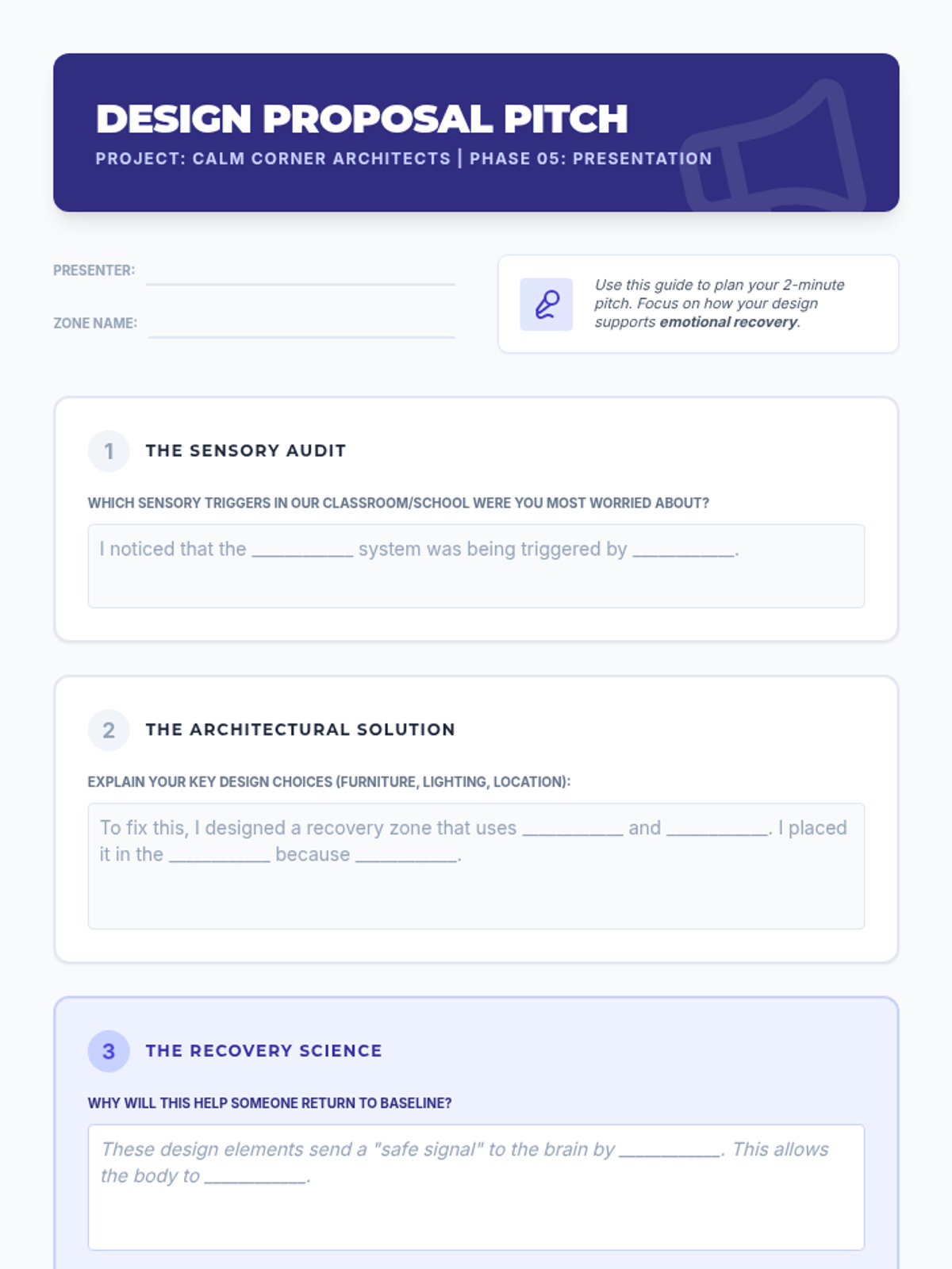 This project-based sequence empowers 5th-grade students to act as environmental designers, auditing their surroundings for sensory triggers and designing personal 'recovery zones' or 'calm corners' to support faster emotional regulation. Students learn the principles of calming design and how physical environments impact the physiological process of returning to baseline.