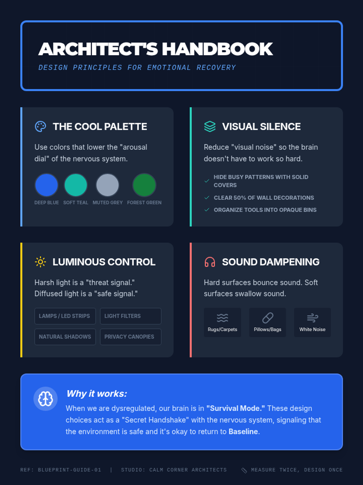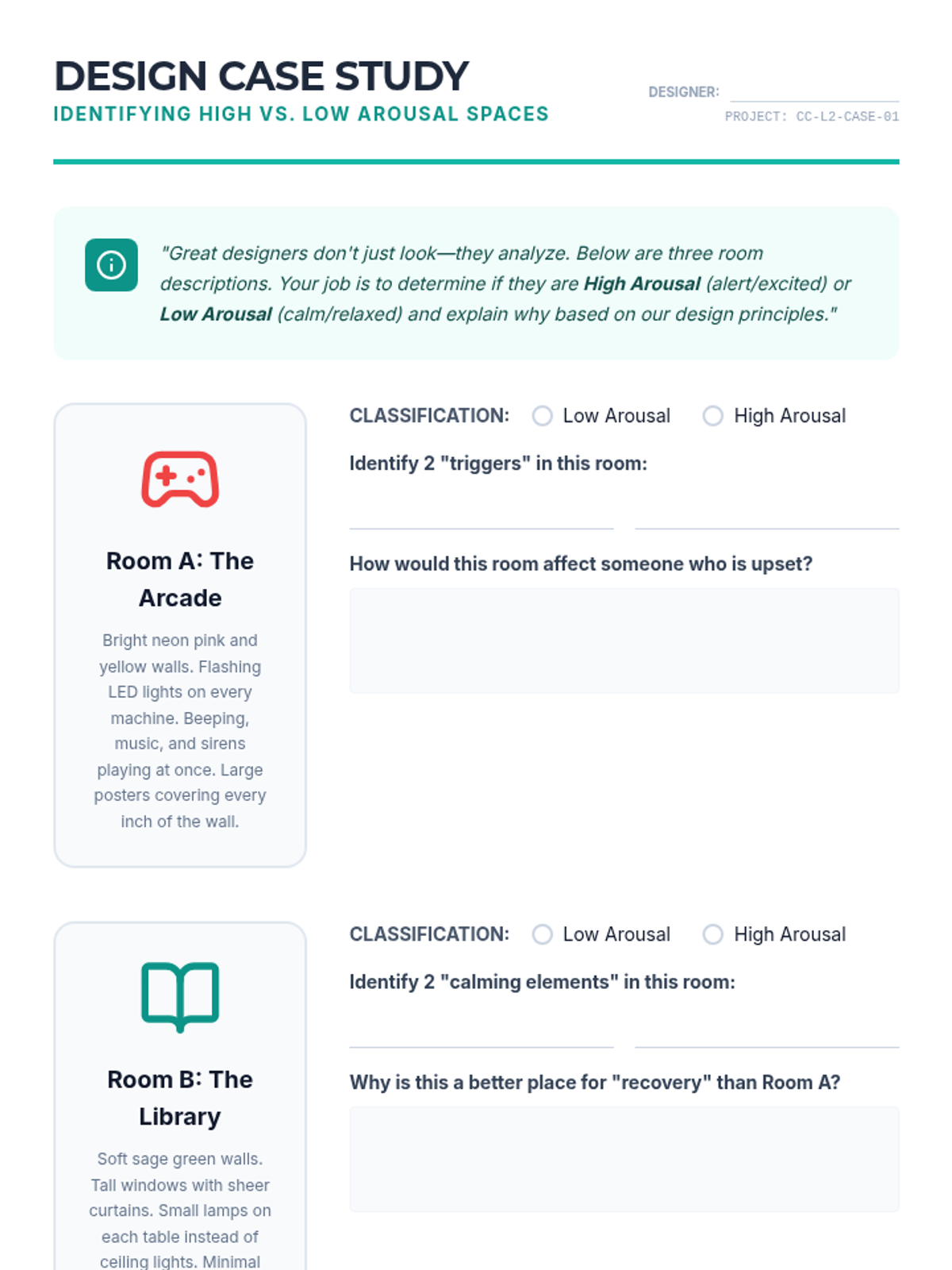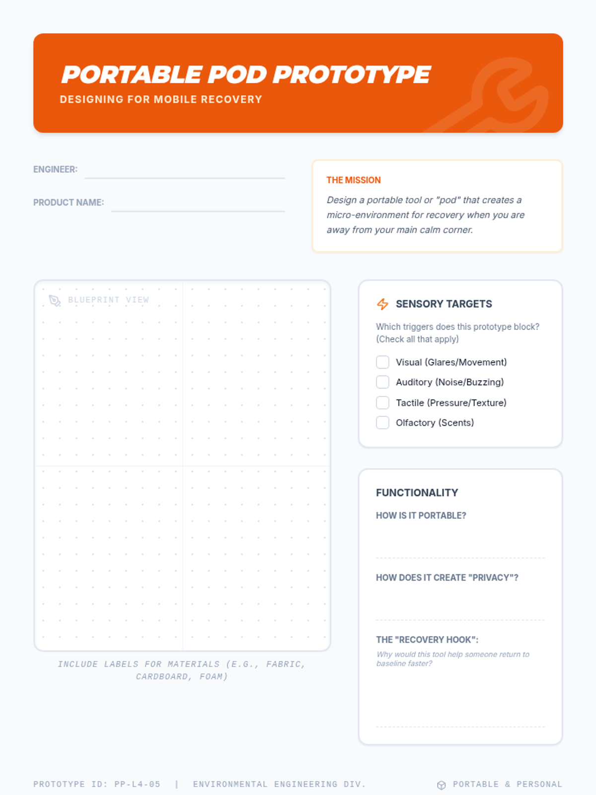 This project-based sequence empowers 5th-grade students to act as environmental designers, auditing their surroundings for sensory triggers and designing personal 'recovery zones' or 'calm corners' to support faster emotional regulation. Students learn the principles of calming design and how physical environments impact the physiological process of returning to baseline.