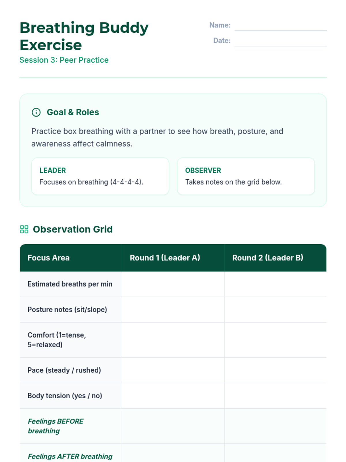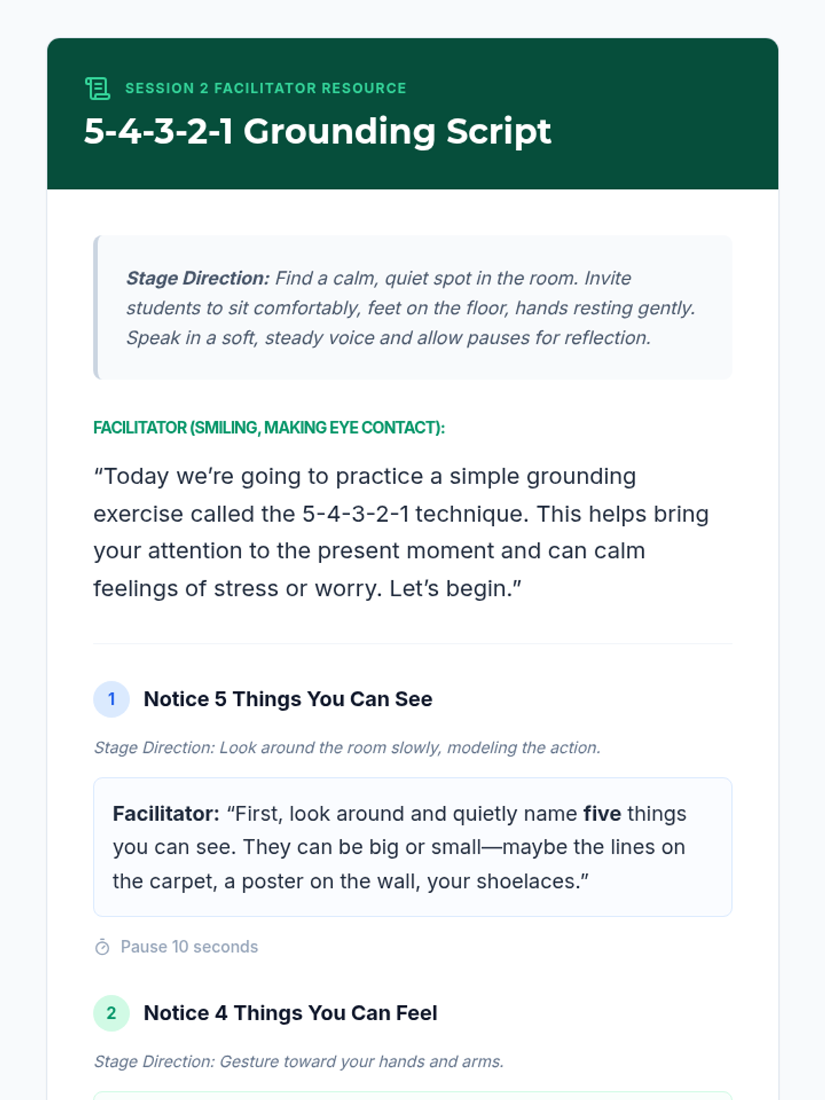 A four-session small-group intervention for 7th graders teaching breathing and grounding techniques to manage stress and anxiety. Students develop self-regulation skills to build emotional resilience and focus.