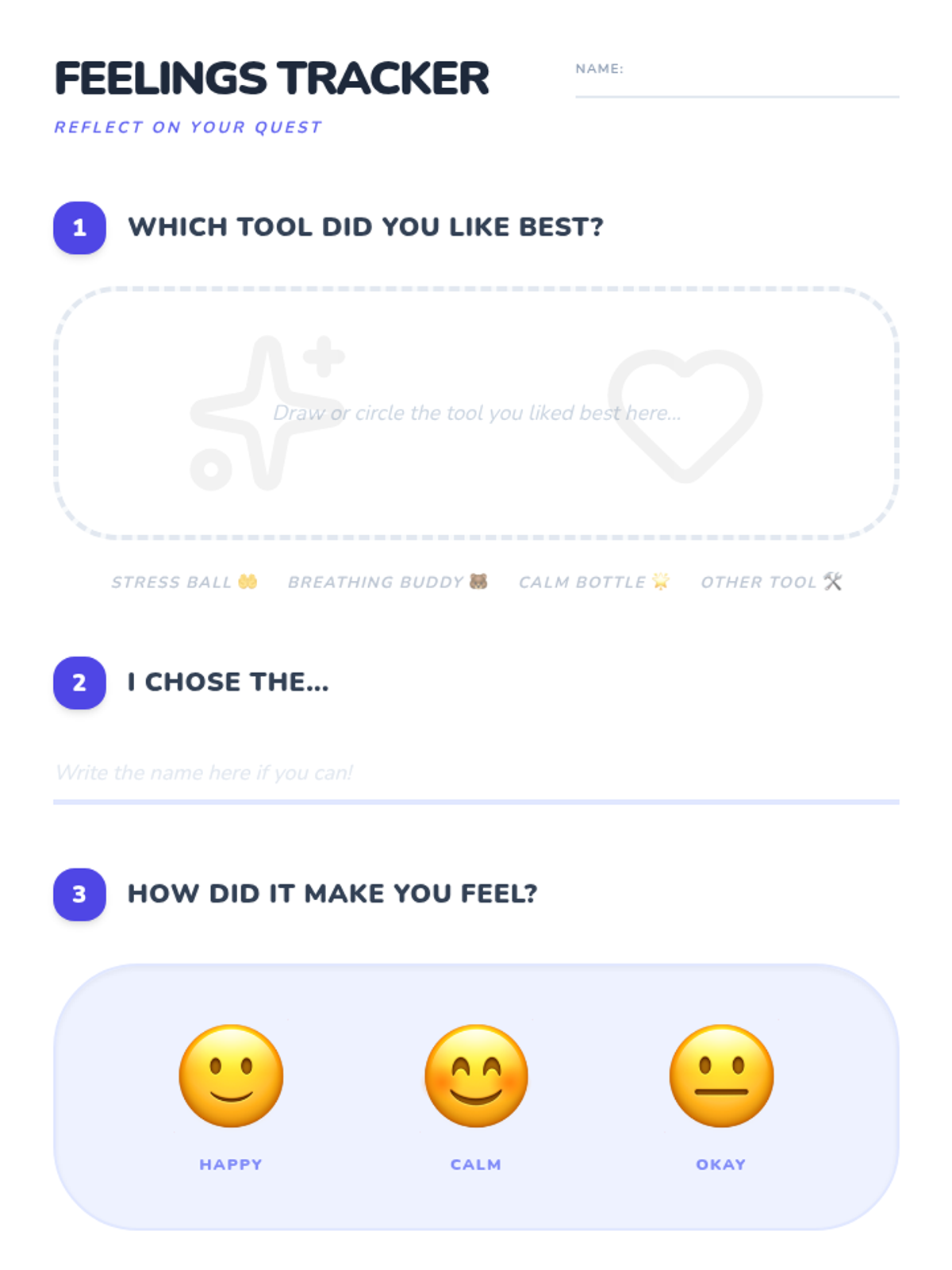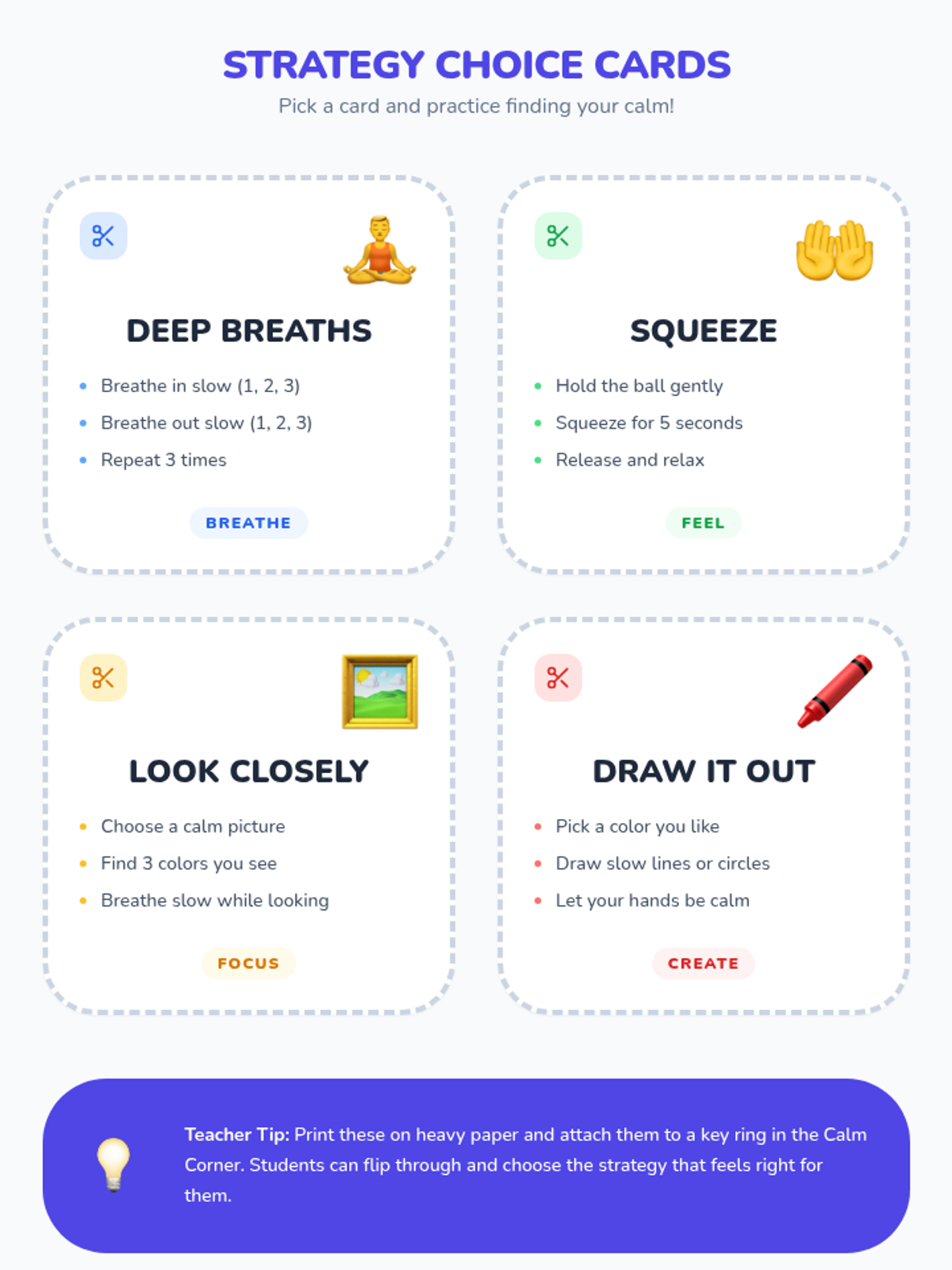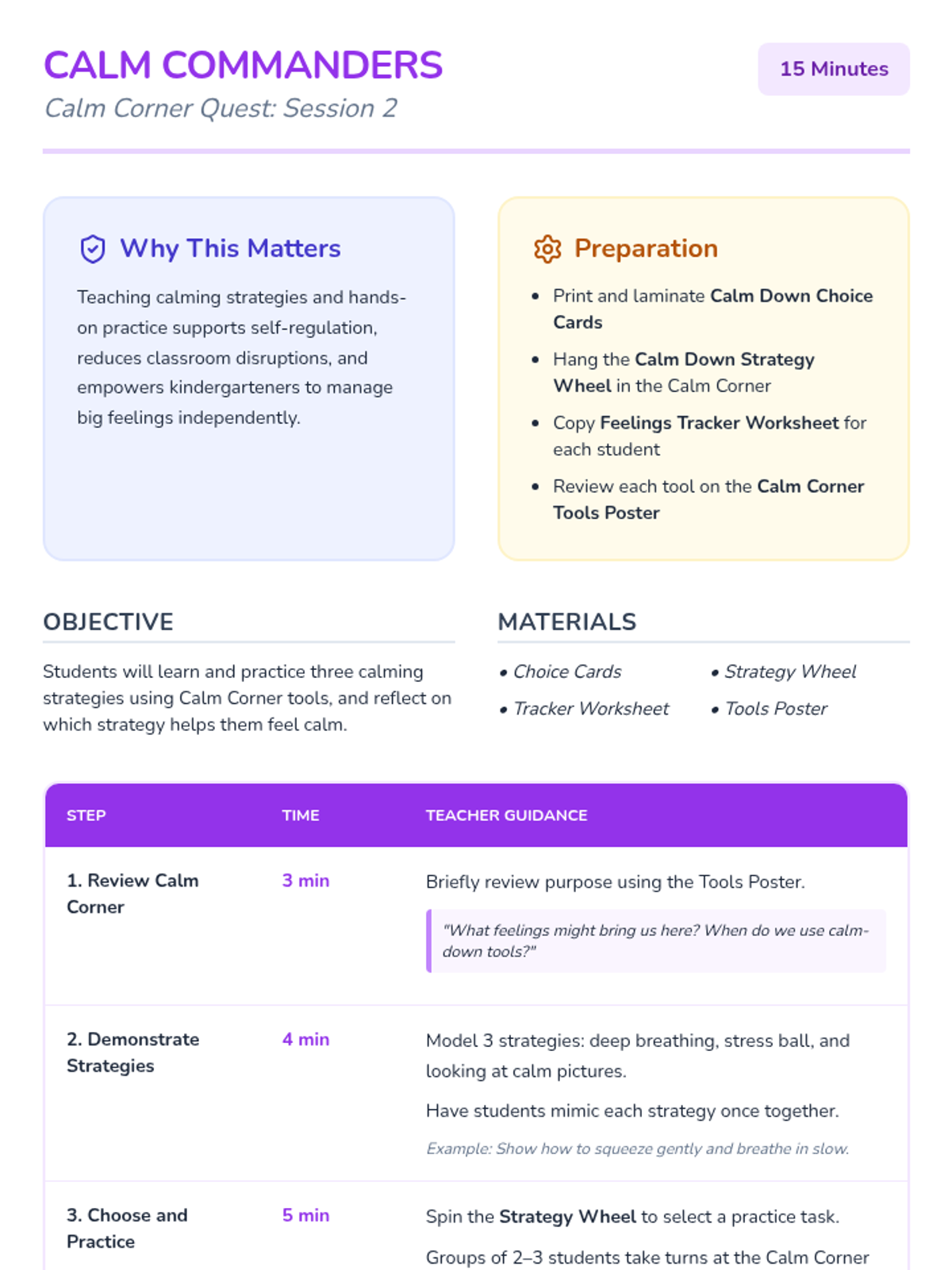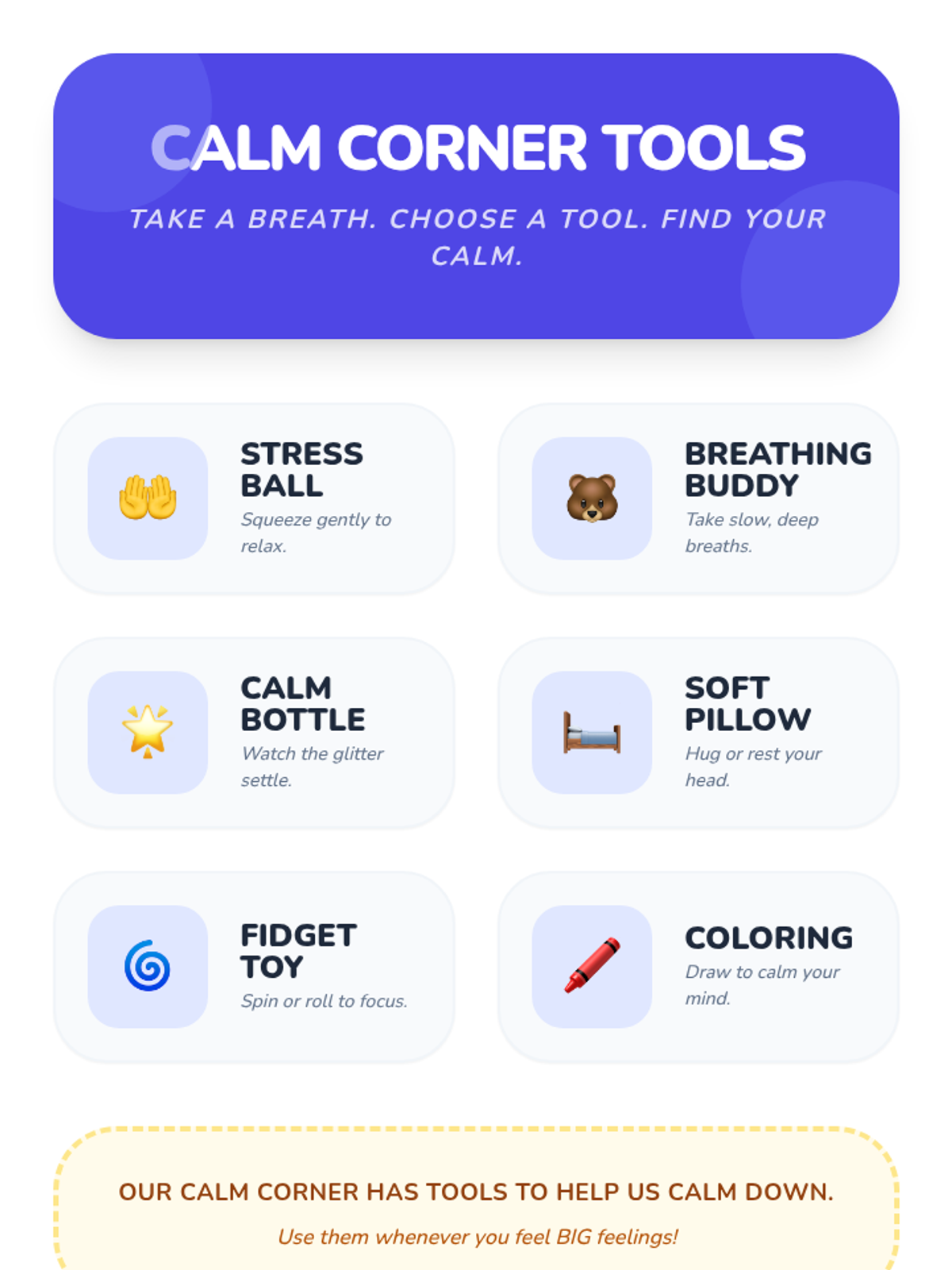 A two-session Kindergarten sequence designed to help students identify emotions and learn self-regulation strategies through the use of a classroom Calm Corner. Students will explore basic feelings and practice using specific tools to manage big emotions independently.