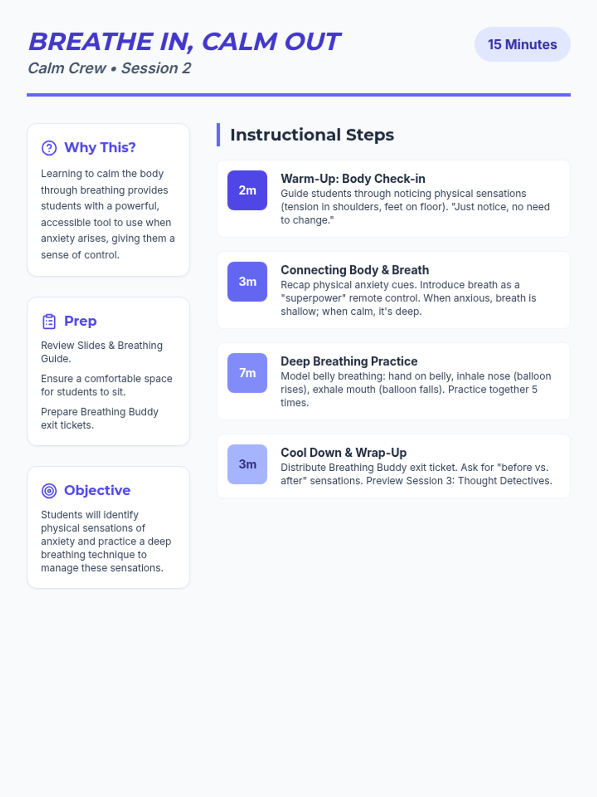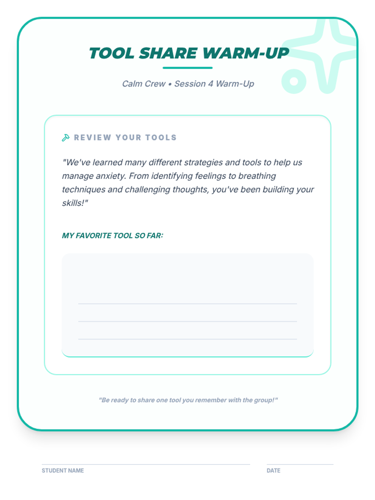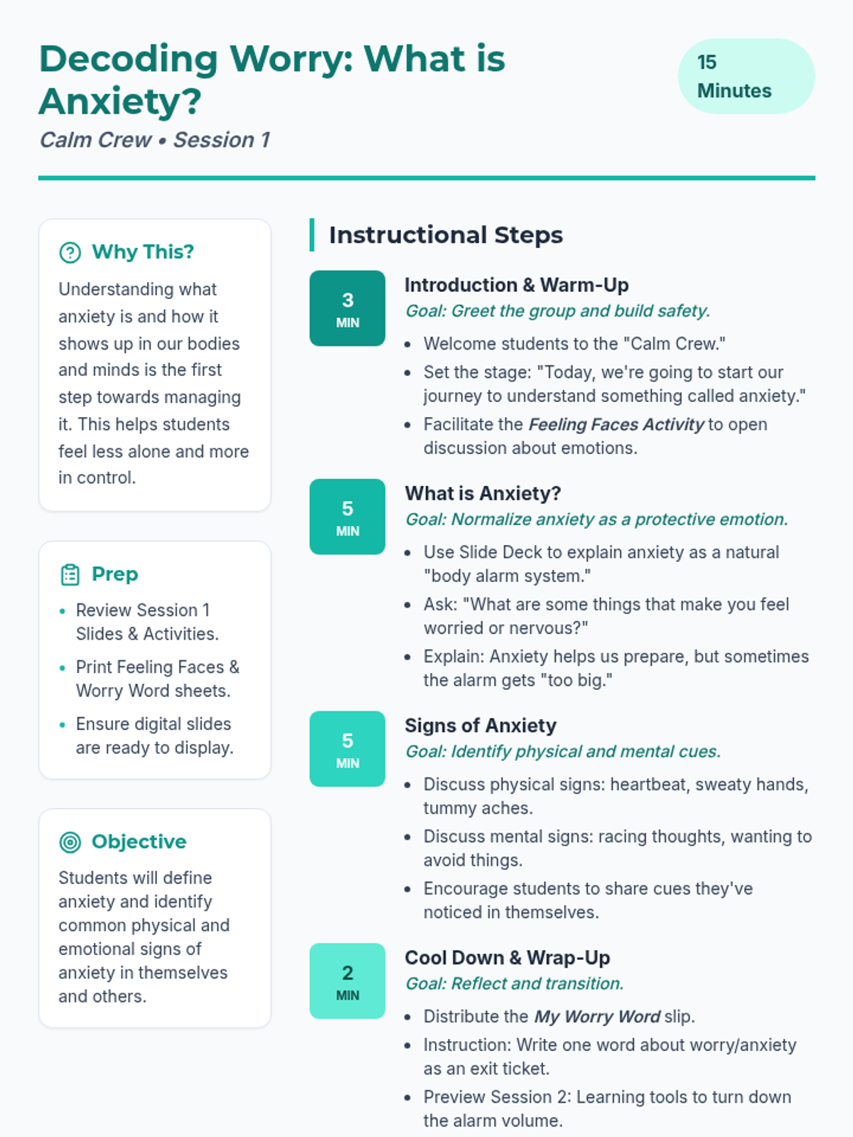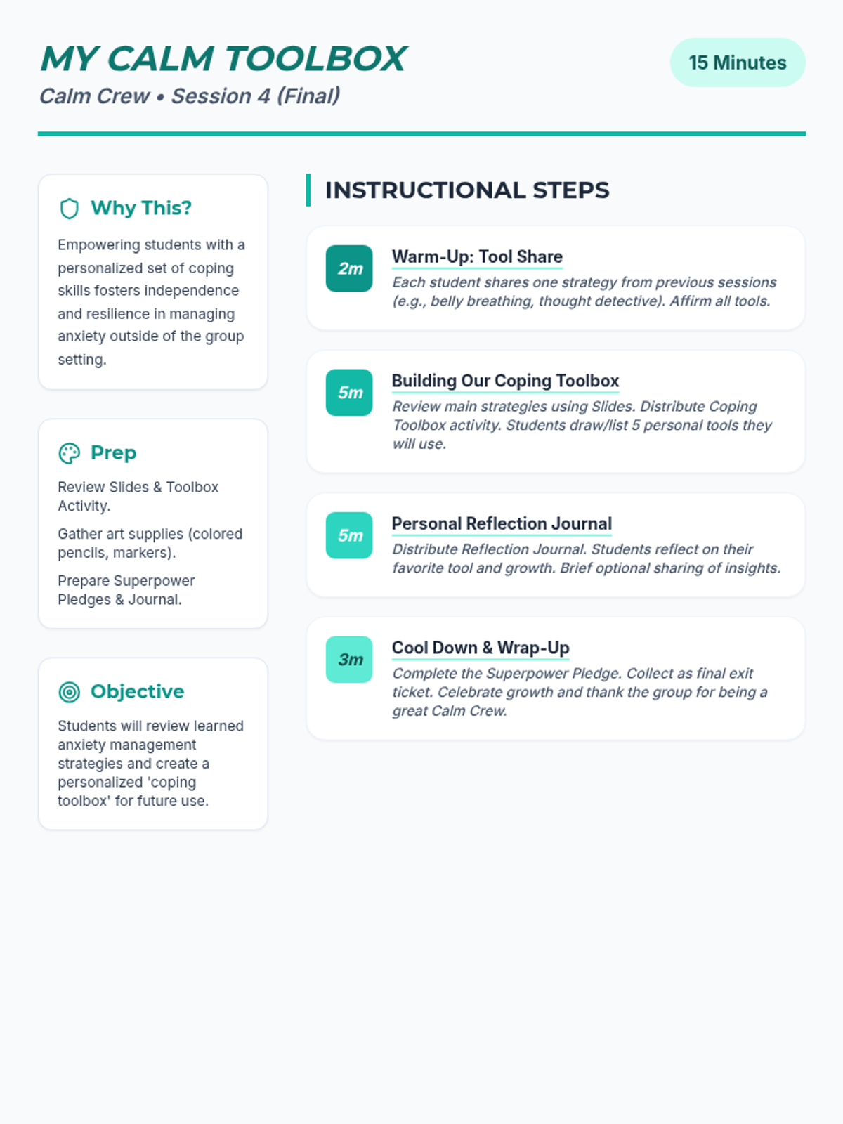 A 4-week Tier 2 group program for 6th-grade students to understand and manage anxiety using a personal 'toolkit' of coping strategies. Each 15-minute session provides practical, evidence-based skills through discussion, breathing exercises, and cognitive reframing.