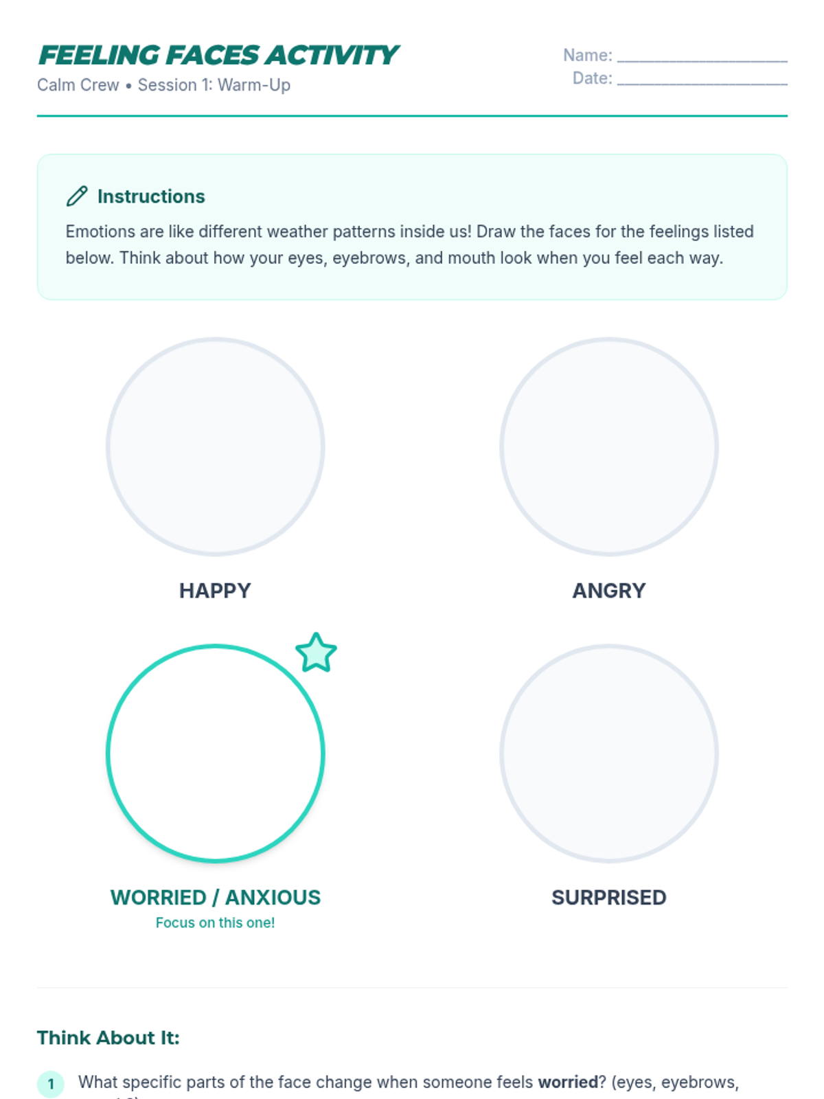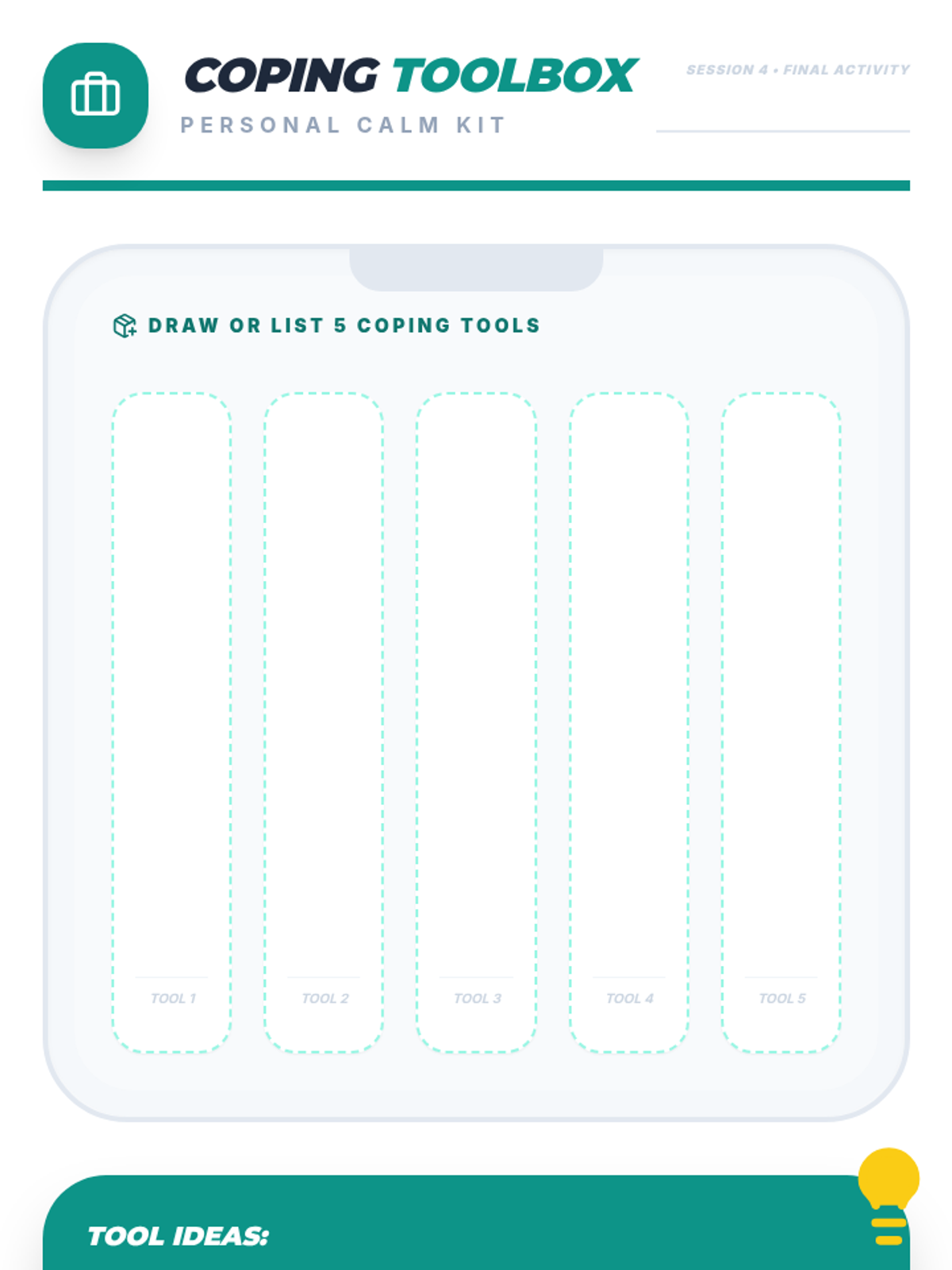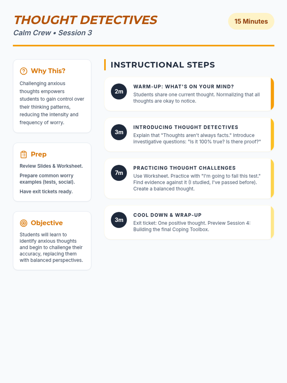 A 4-week Tier 2 group program for 6th-grade students to understand and manage anxiety using a personal 'toolkit' of coping strategies. Each 15-minute session provides practical, evidence-based skills through discussion, breathing exercises, and cognitive reframing.