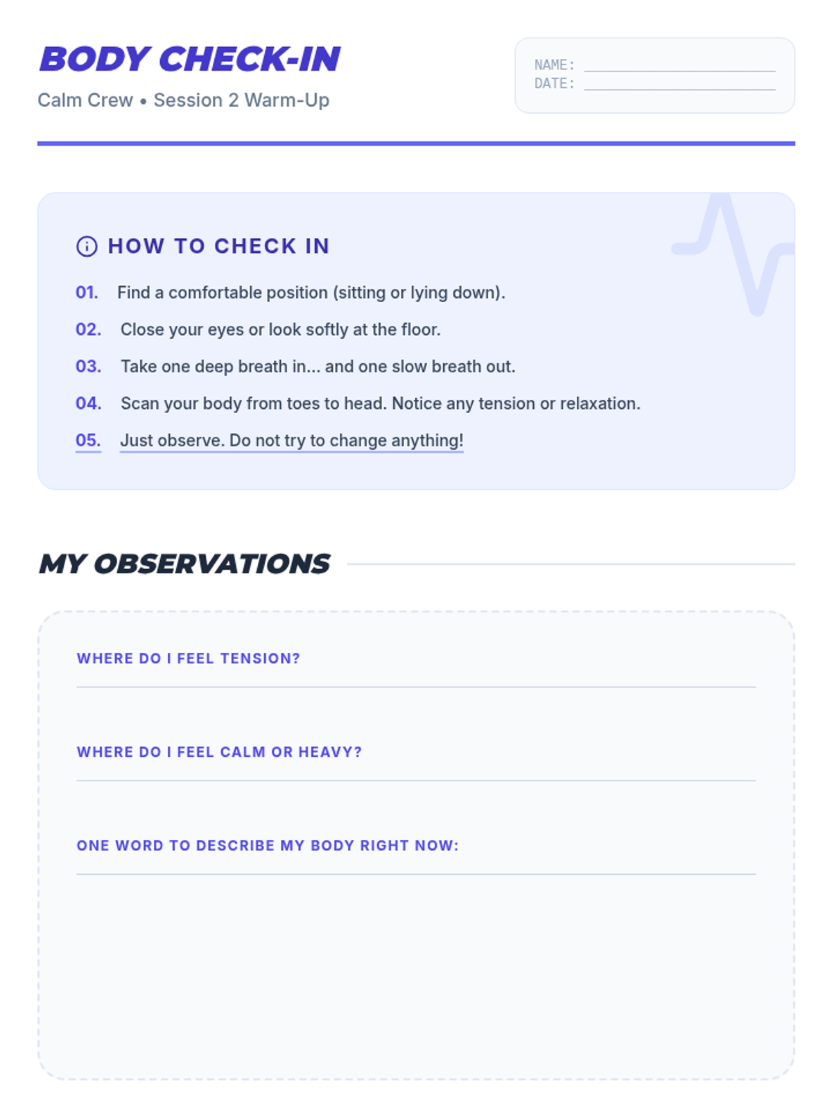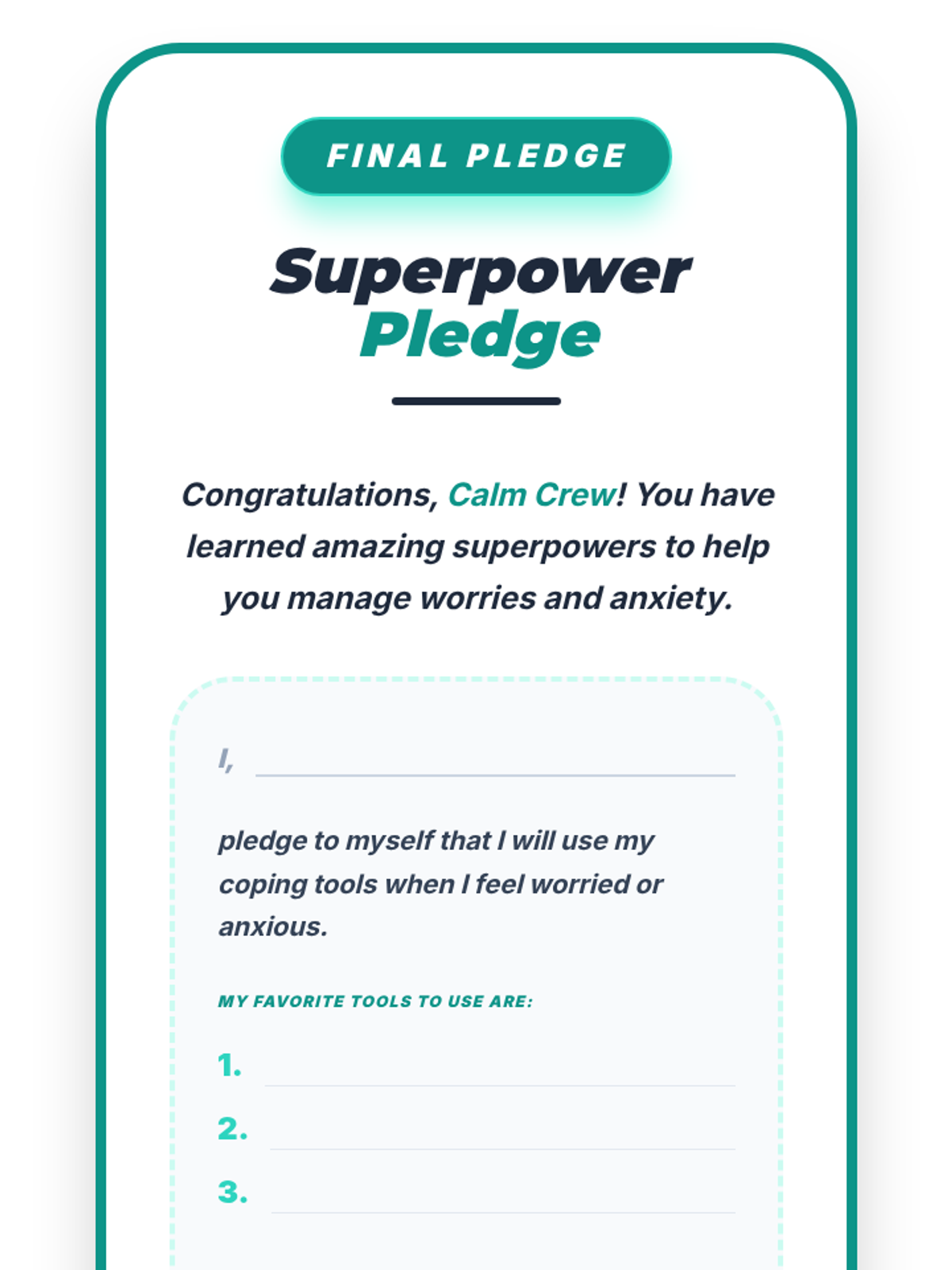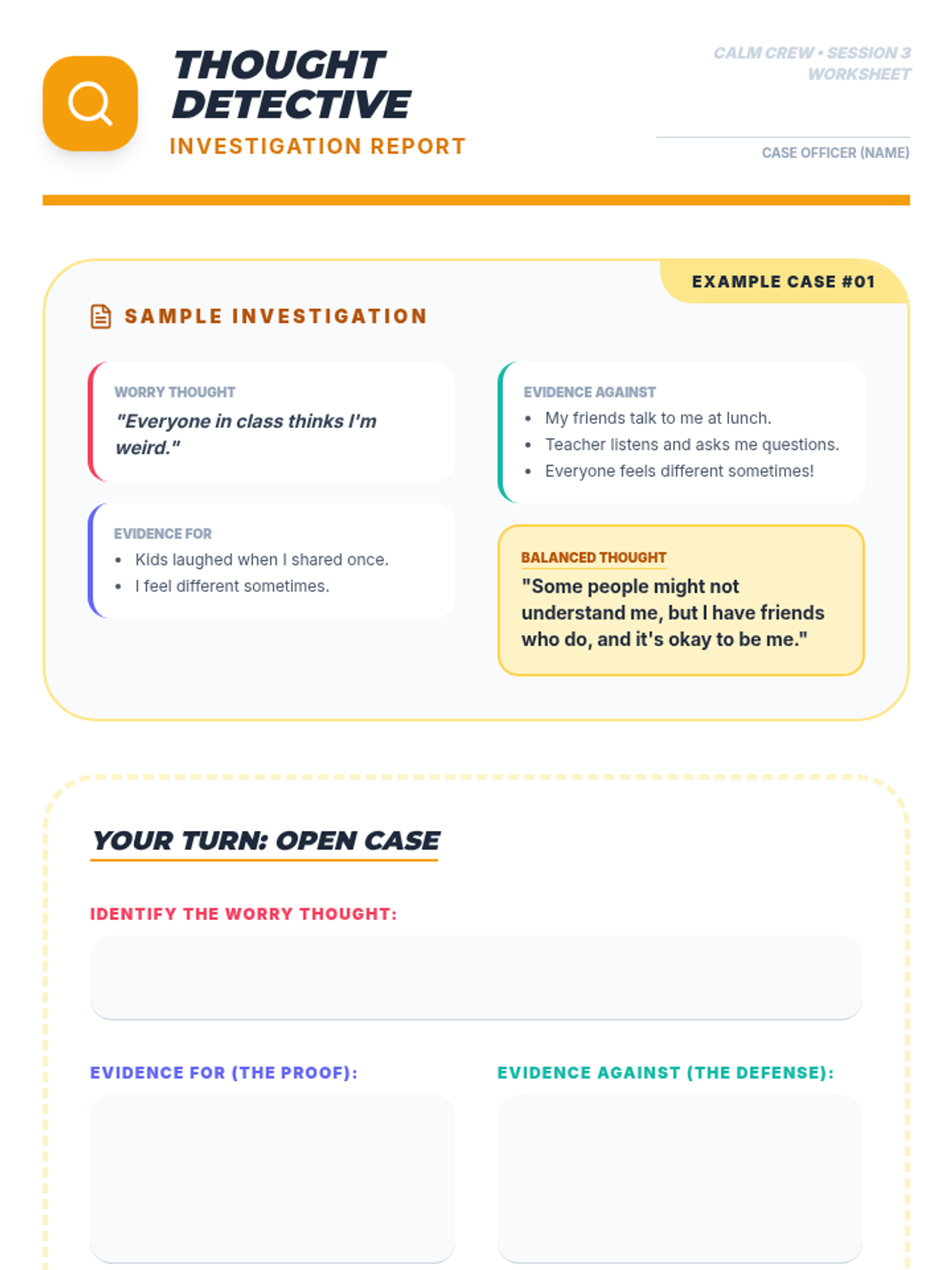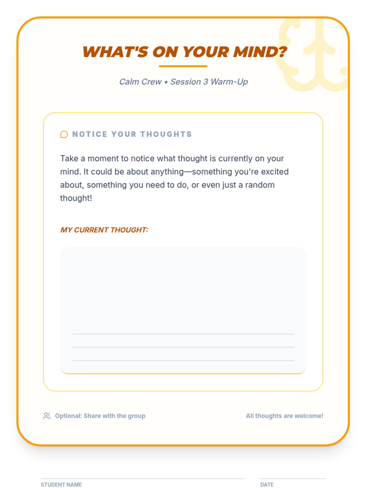 A 4-week Tier 2 group program for 6th-grade students to understand and manage anxiety using a personal 'toolkit' of coping strategies. Each 15-minute session provides practical, evidence-based skills through discussion, breathing exercises, and cognitive reframing.