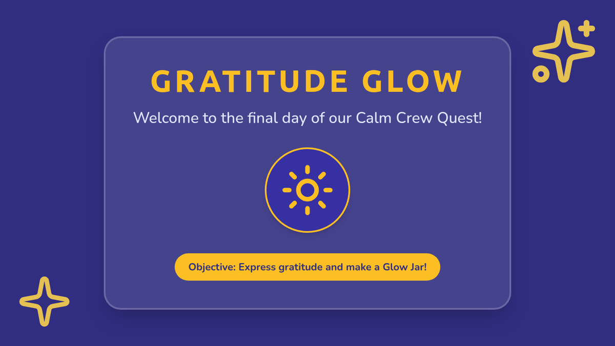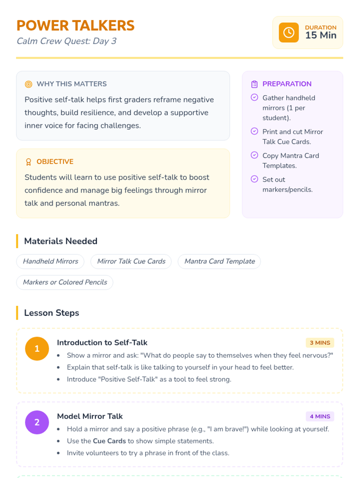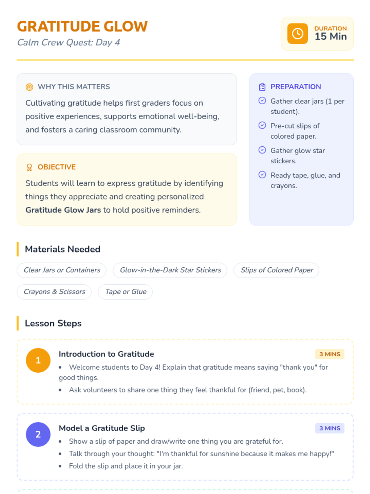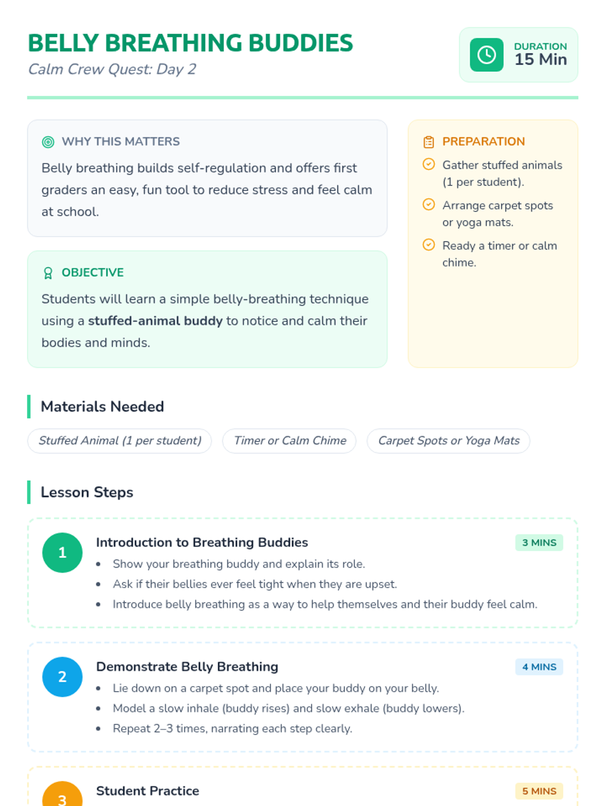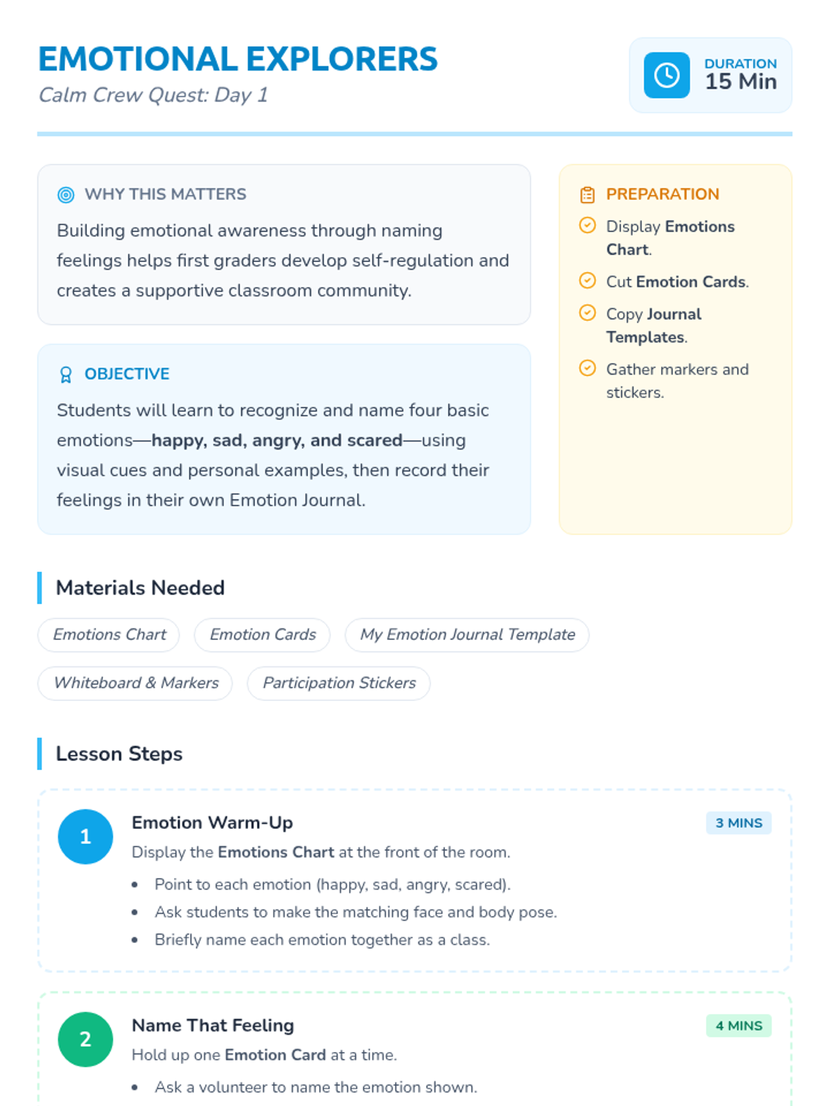 A four-day mini-session for 1st graders to develop coping skills, emotional awareness, breathing techniques, and gratitude. students embark on a 'quest' to build their own emotional toolkit for a calm and confident school year.