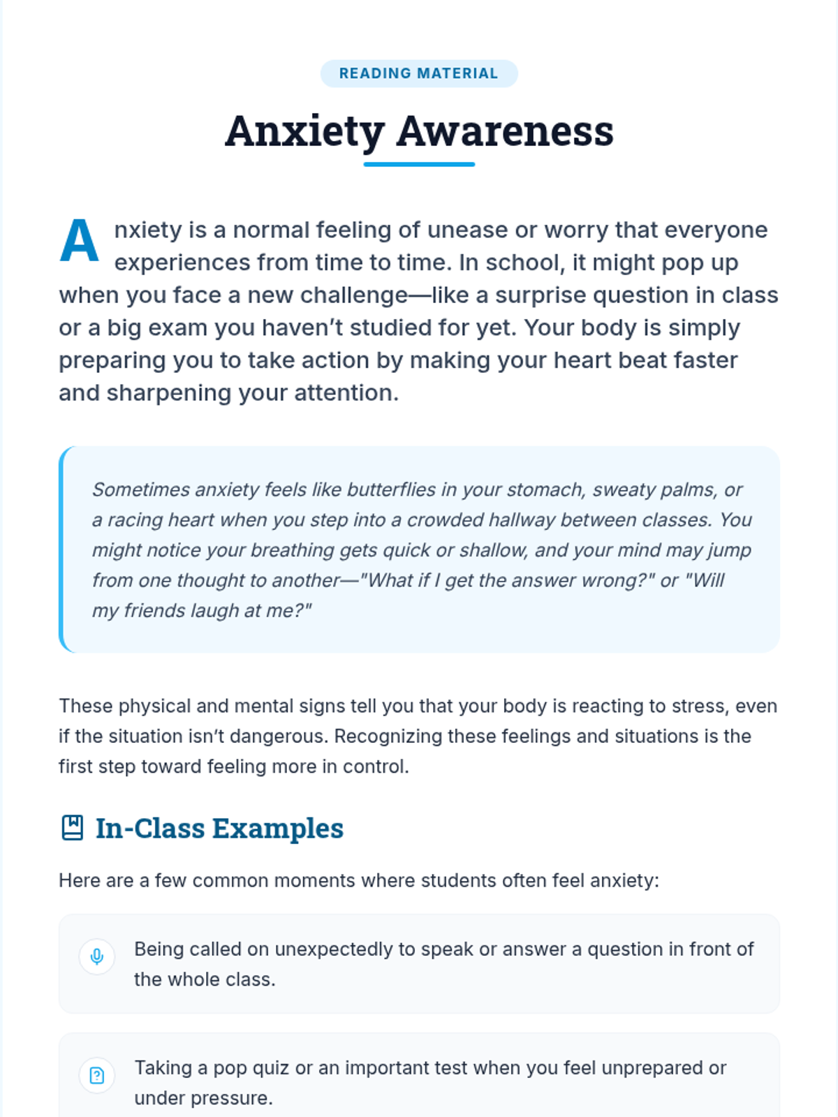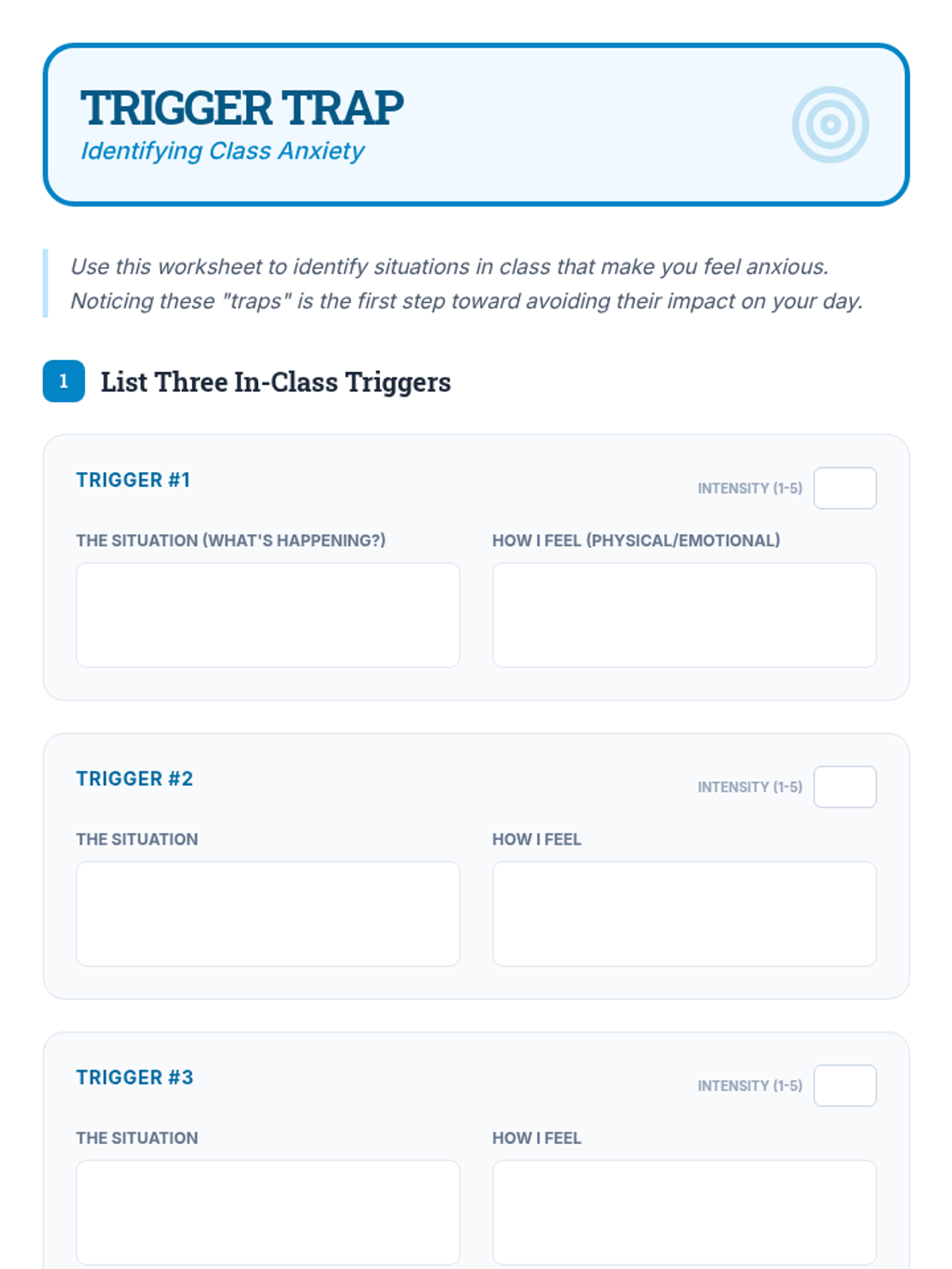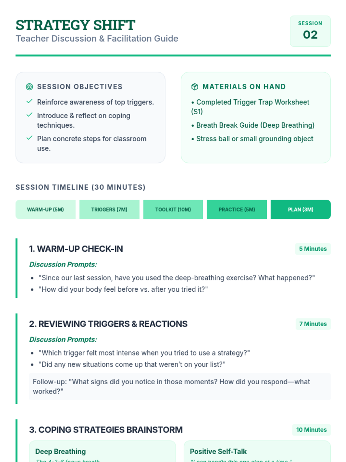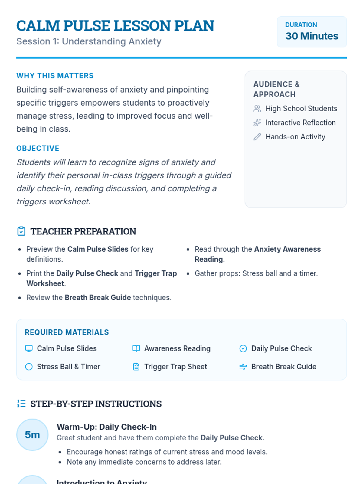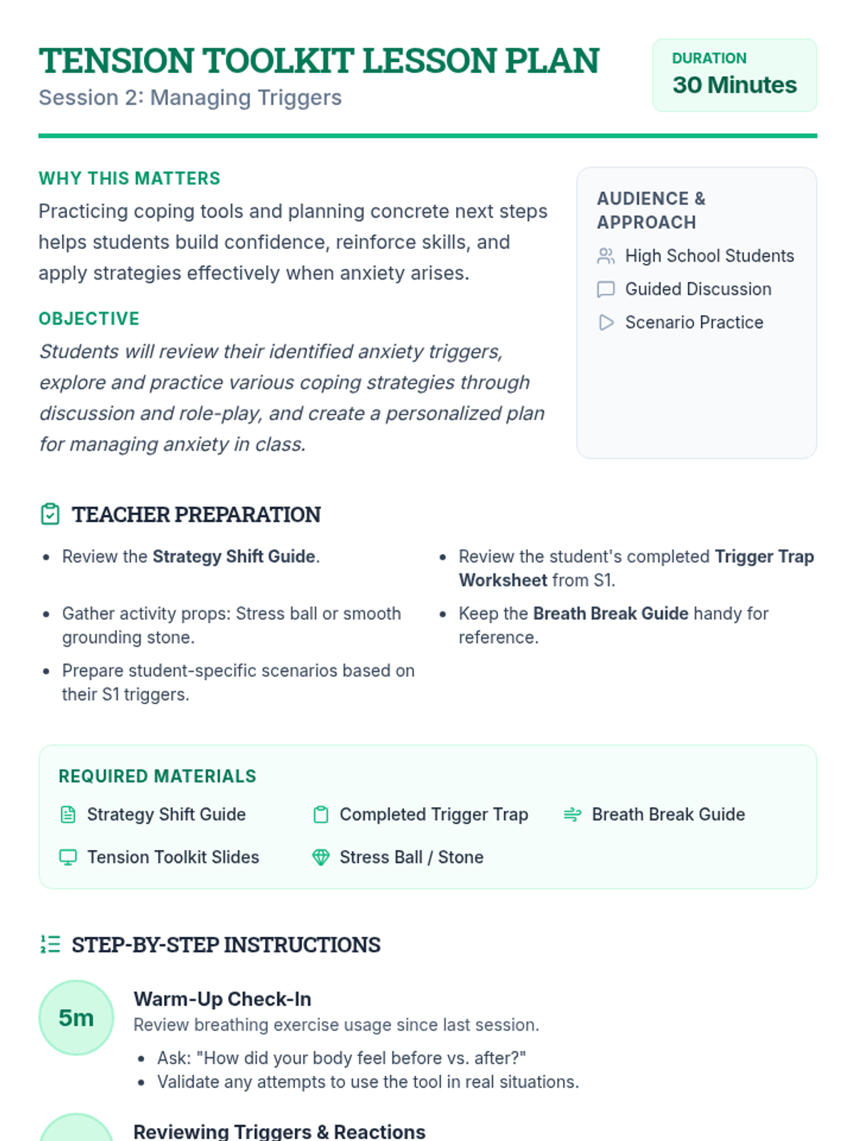 A two-session individual intervention sequence designed to help students identify anxiety triggers and implement practical coping strategies for the classroom.