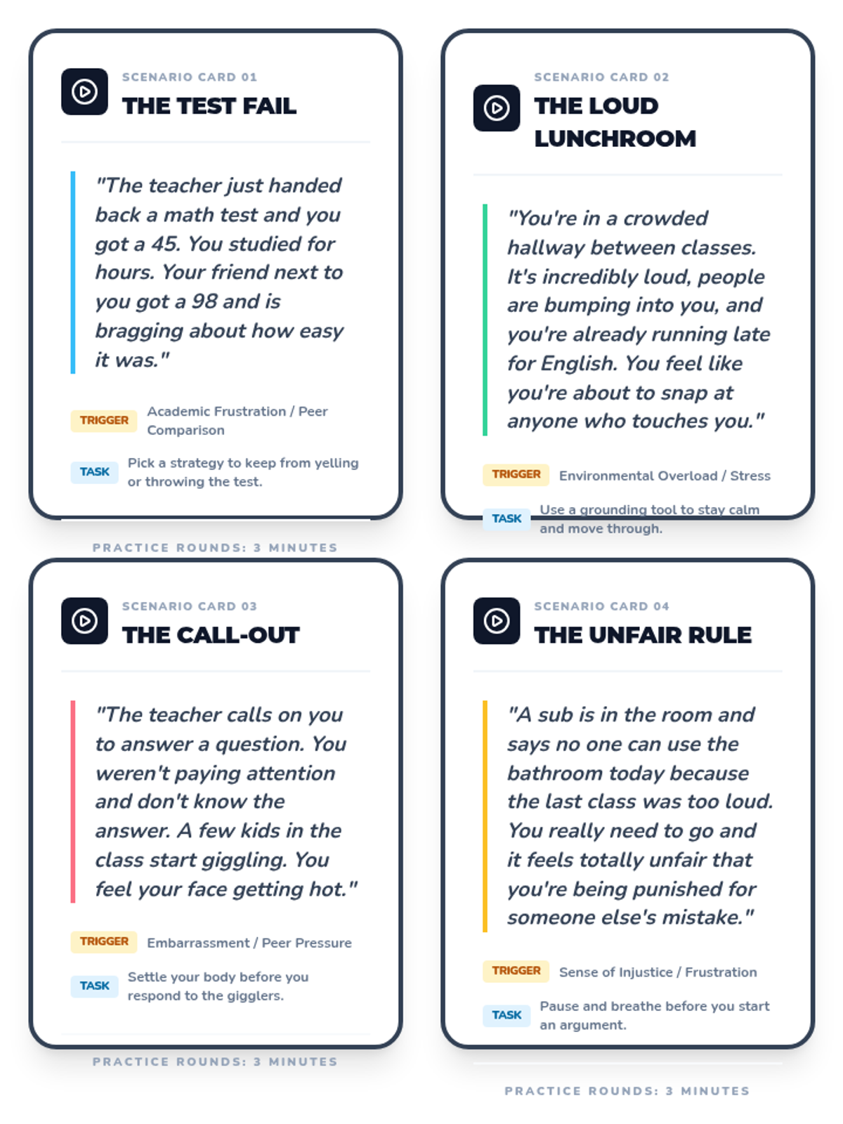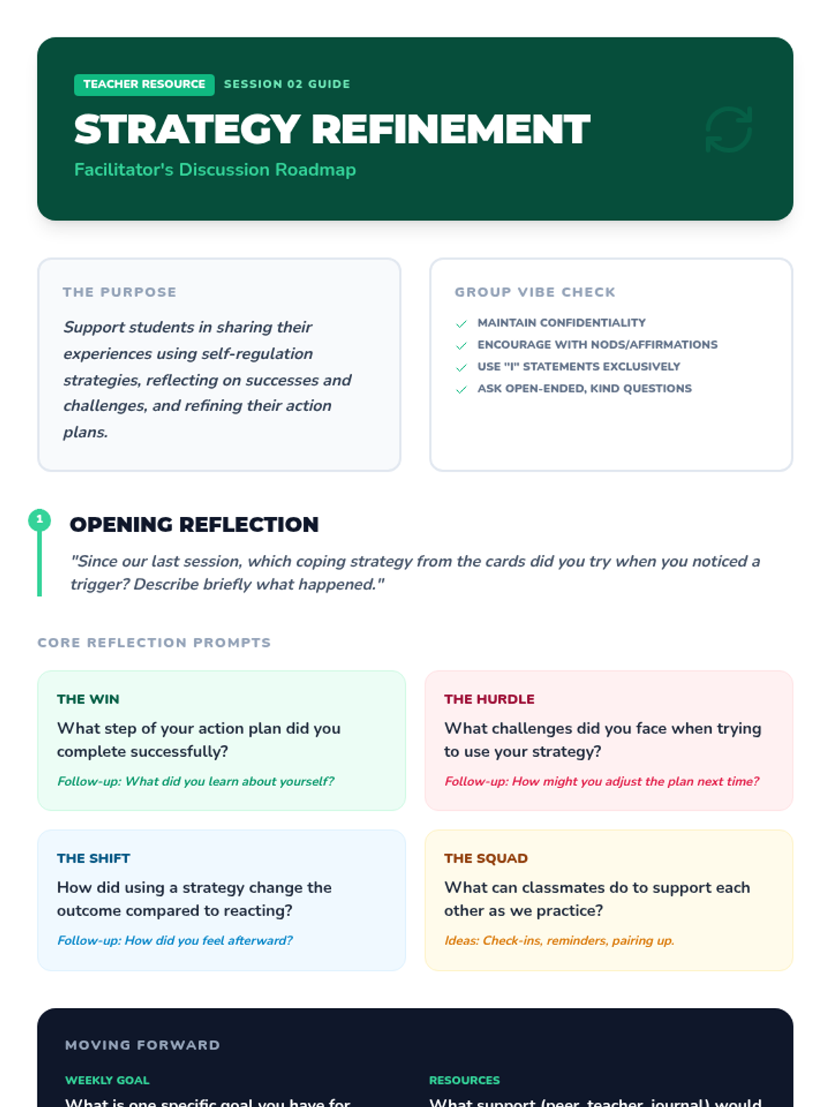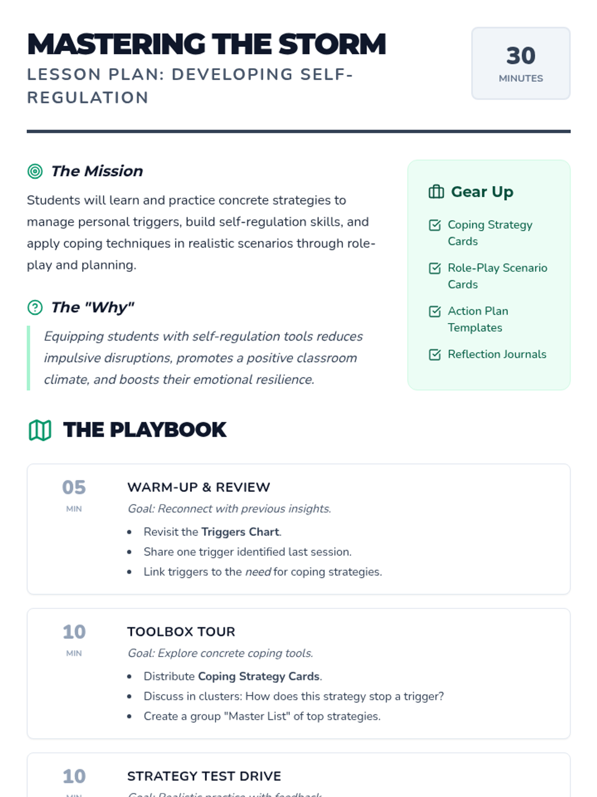 A two-session mini-unit for middle school small groups focused on understanding disruptive behaviors, identifying personal triggers, and developing concrete self-regulation strategies. Students move from awareness of external and internal pressures to practicing and planning constructive responses.