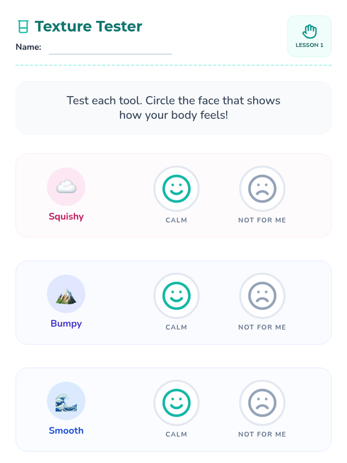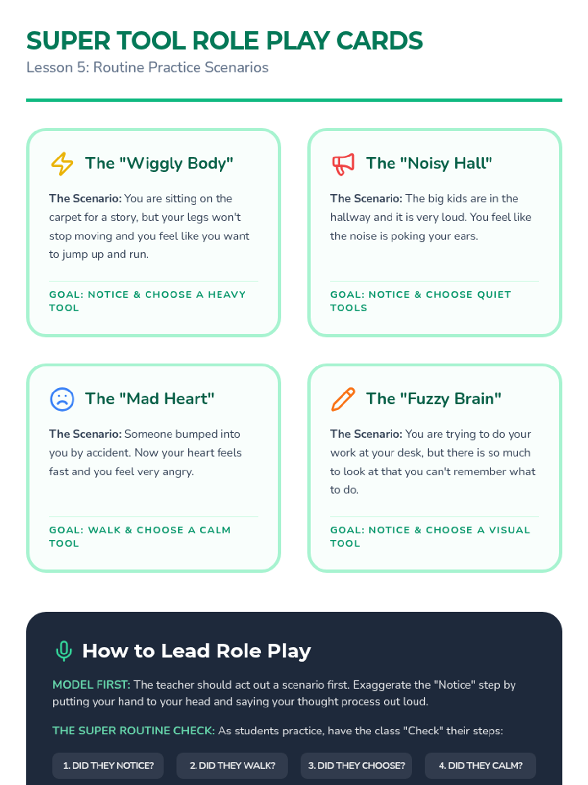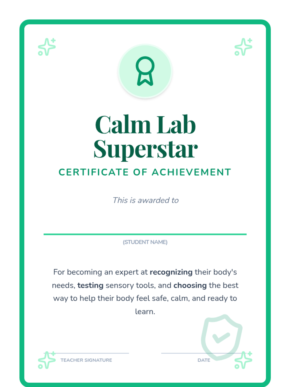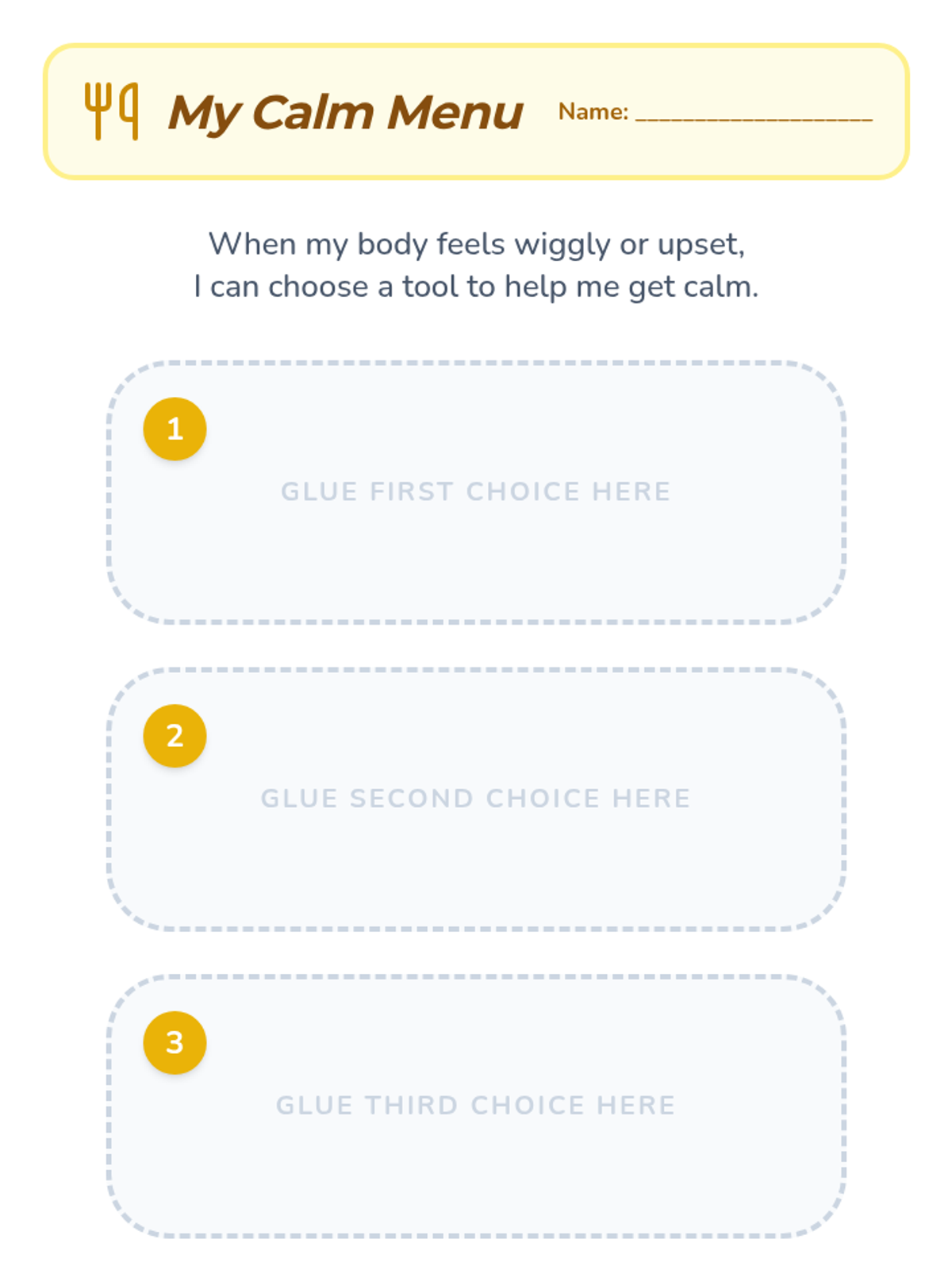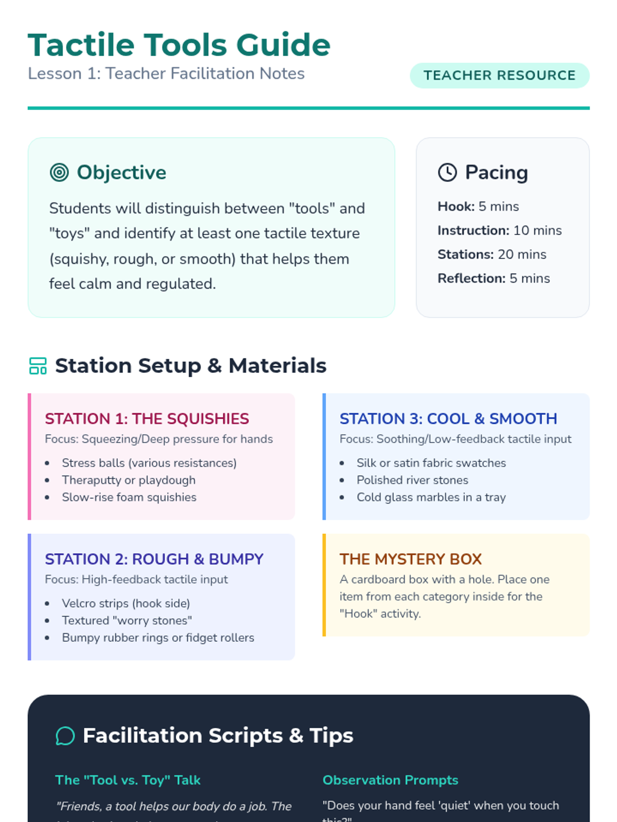 A Kindergarten sequence focused on sensory regulation recovery, empowering students to identify, test, and select tactile, proprioceptive, auditory, and visual tools to return to a calm state after dysregulation.
