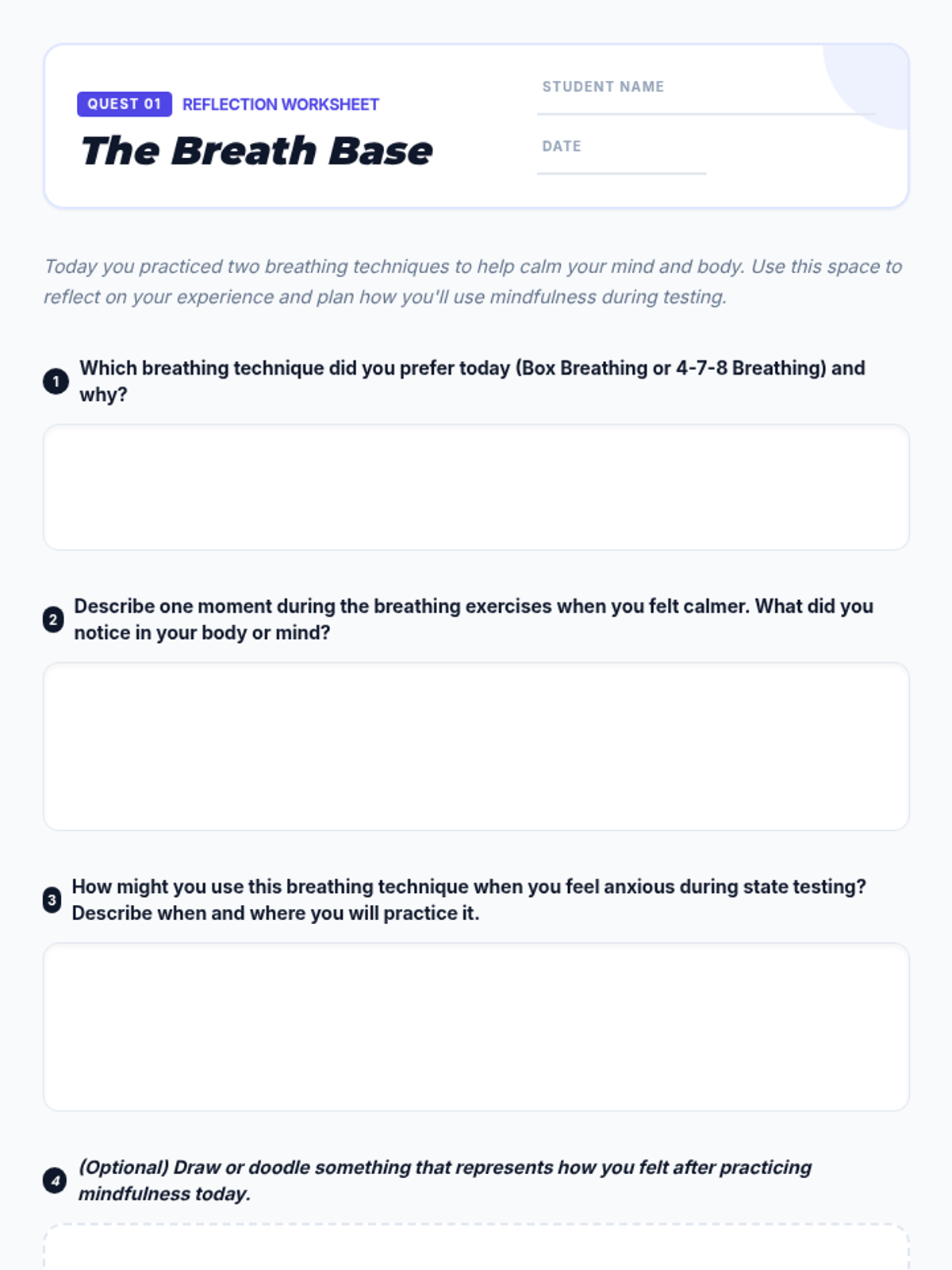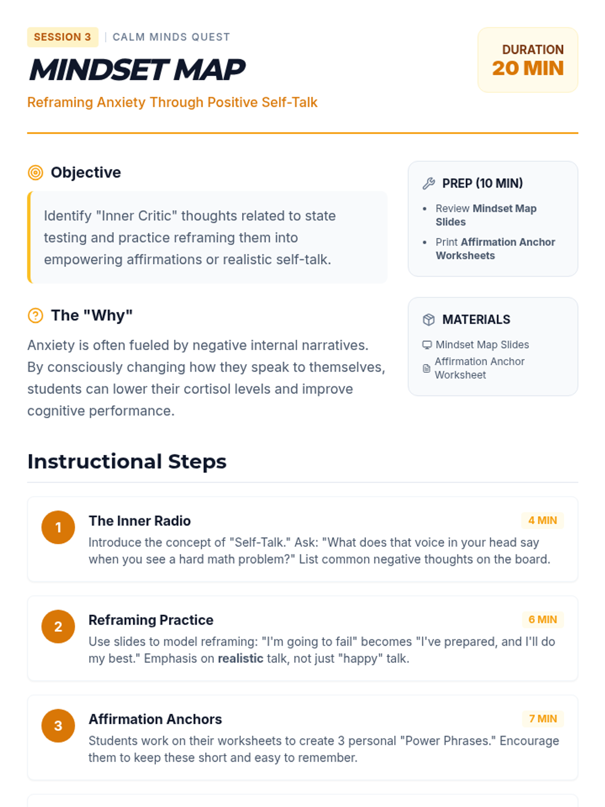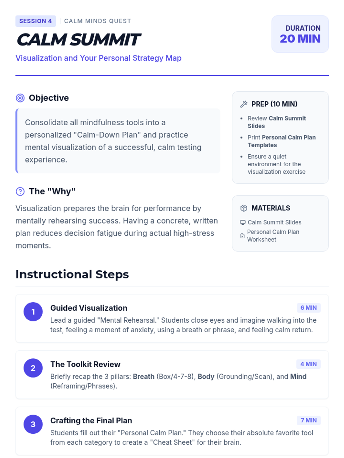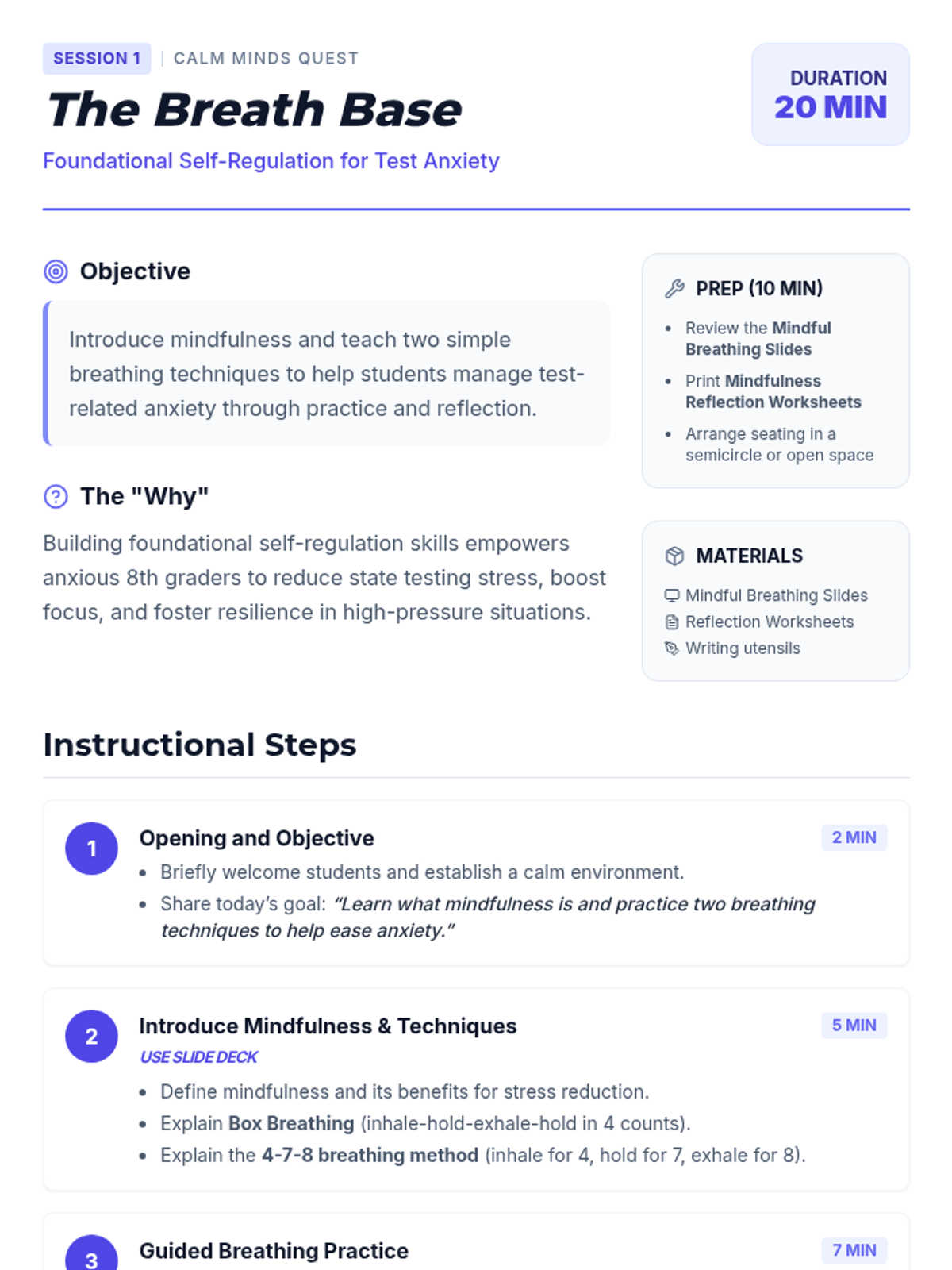 A 4-session mindfulness program designed for 8th graders to manage state testing anxiety through breathing techniques, grounding exercises, positive self-talk, and visualization.