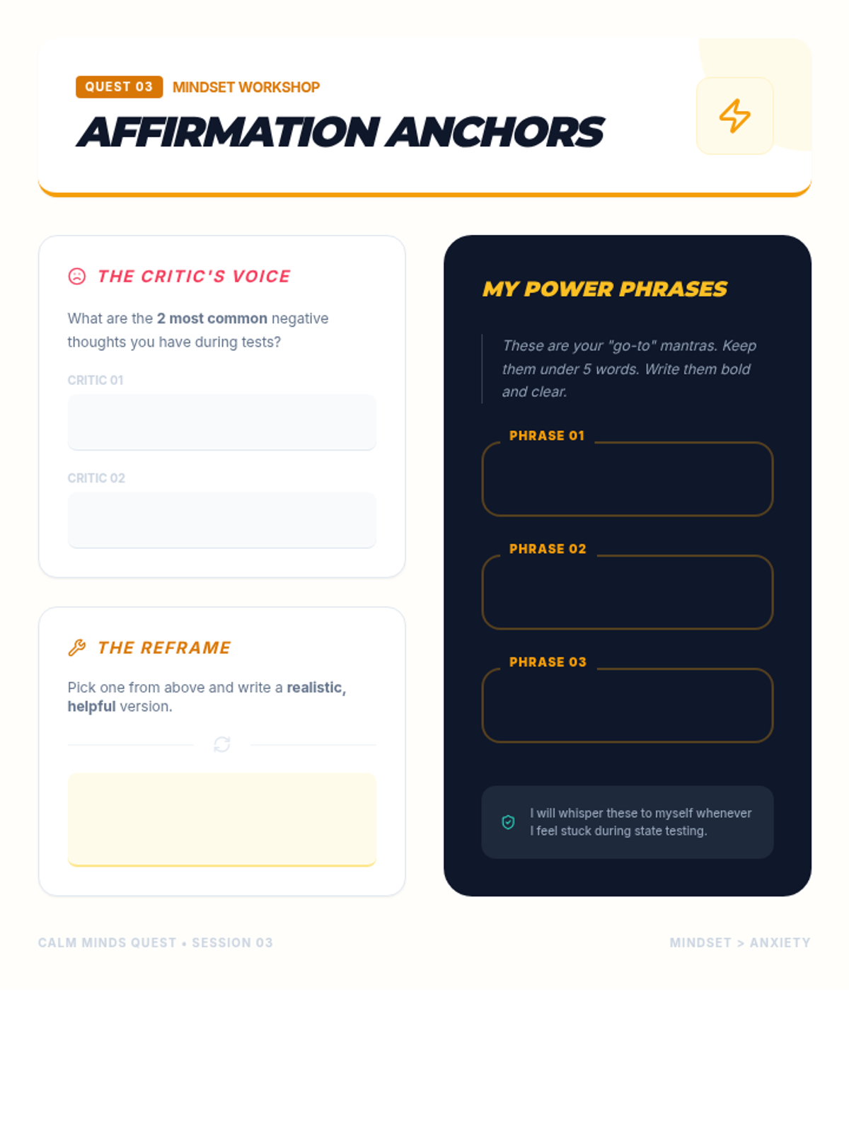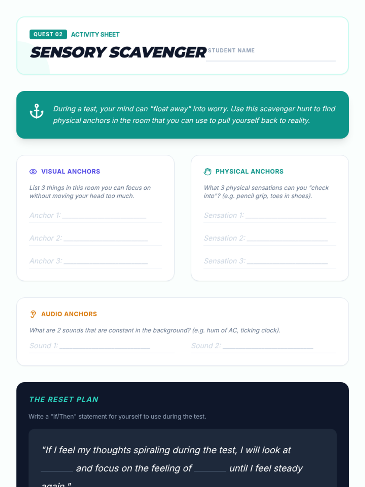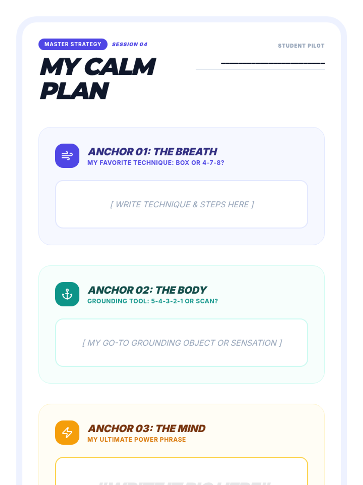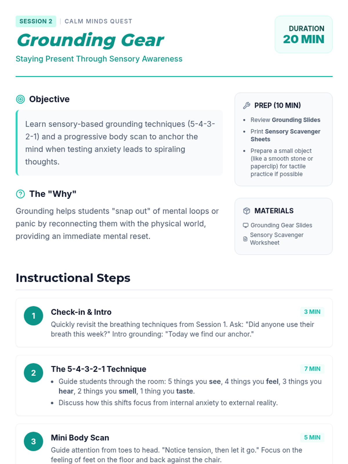 A 4-session mindfulness program designed for 8th graders to manage state testing anxiety through breathing techniques, grounding exercises, positive self-talk, and visualization.