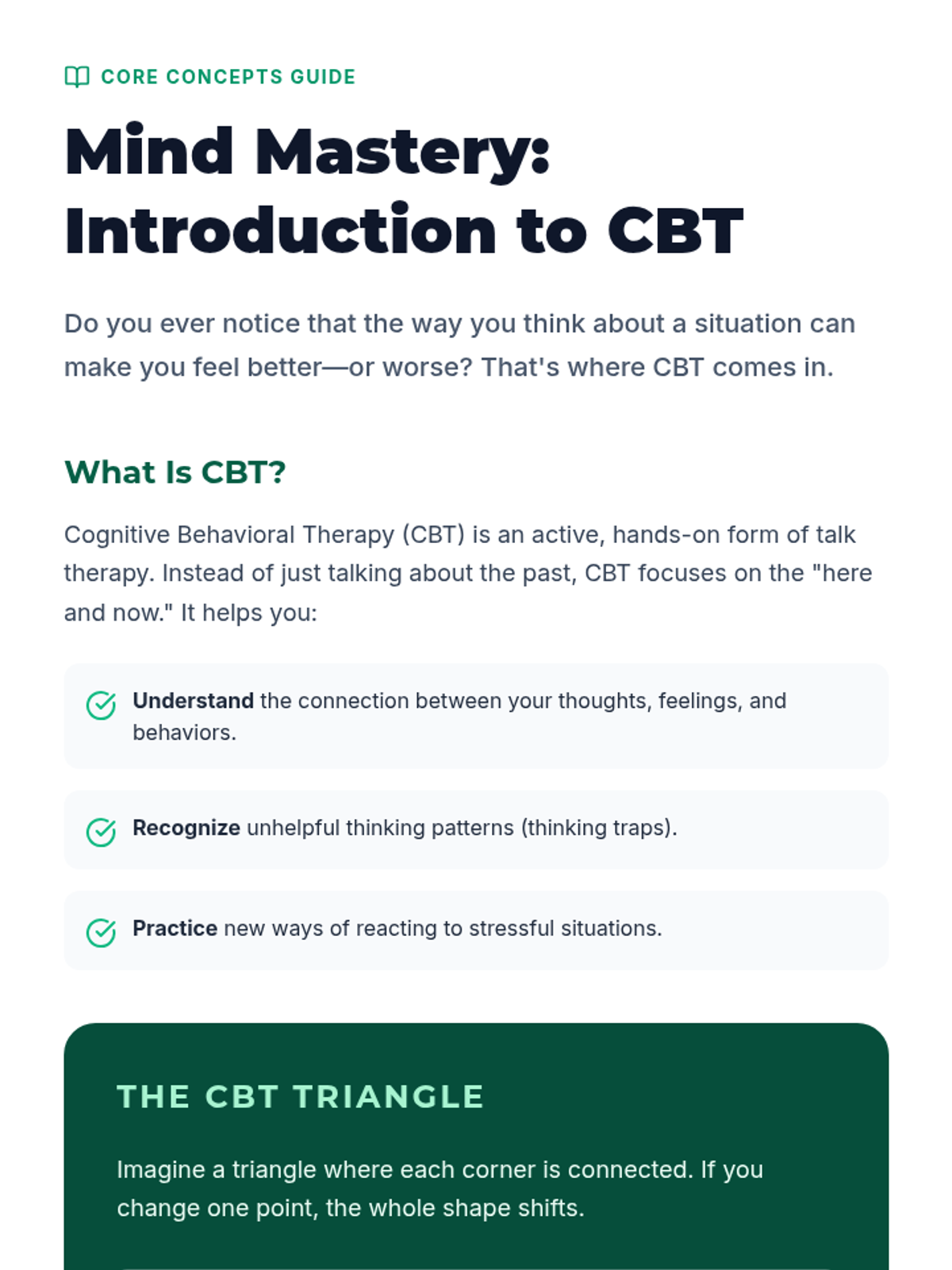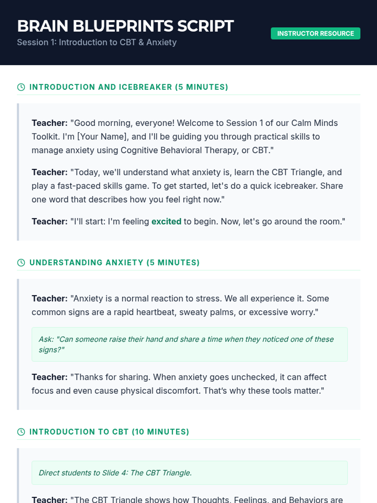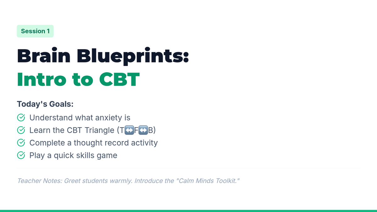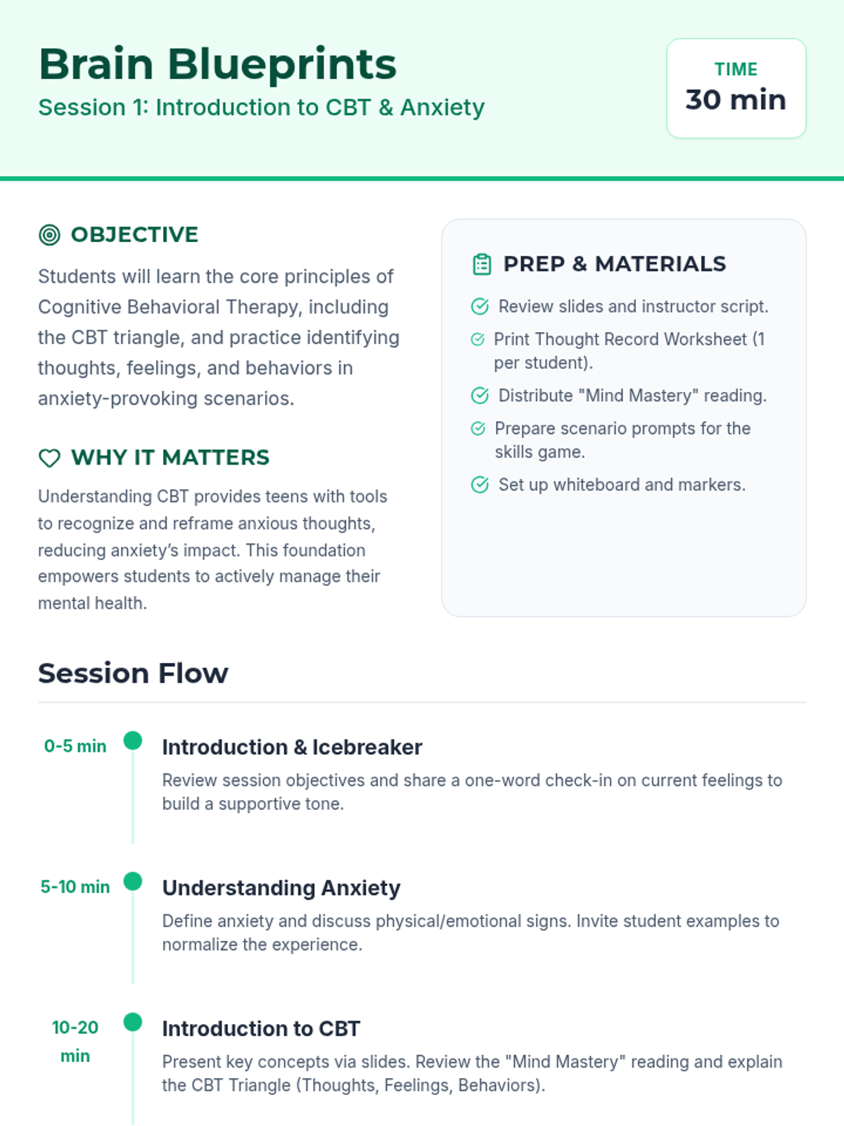 A comprehensive 16-week CBT curriculum for high school students designed to manage anxiety through practical tools and cognitive restructuring.