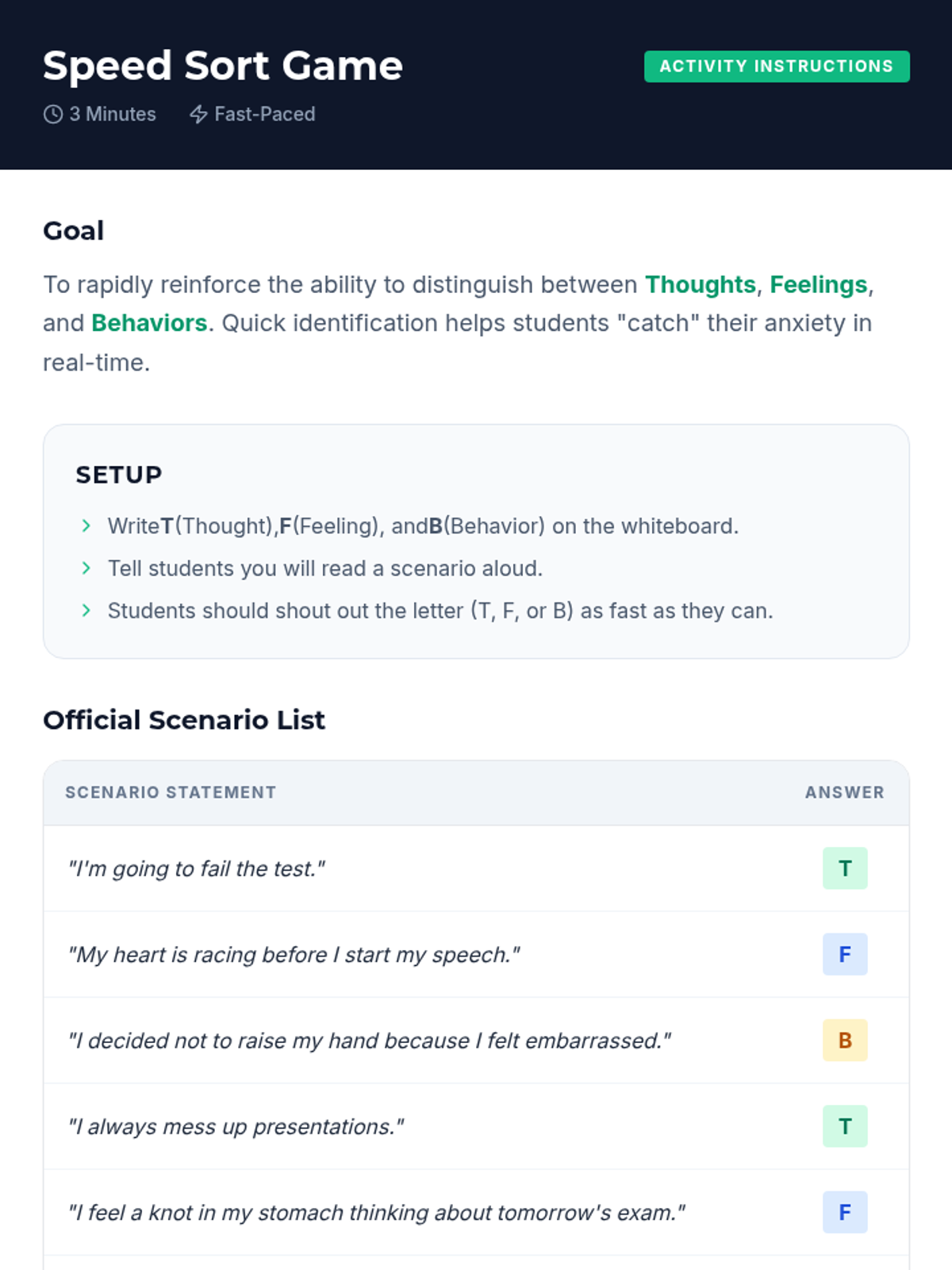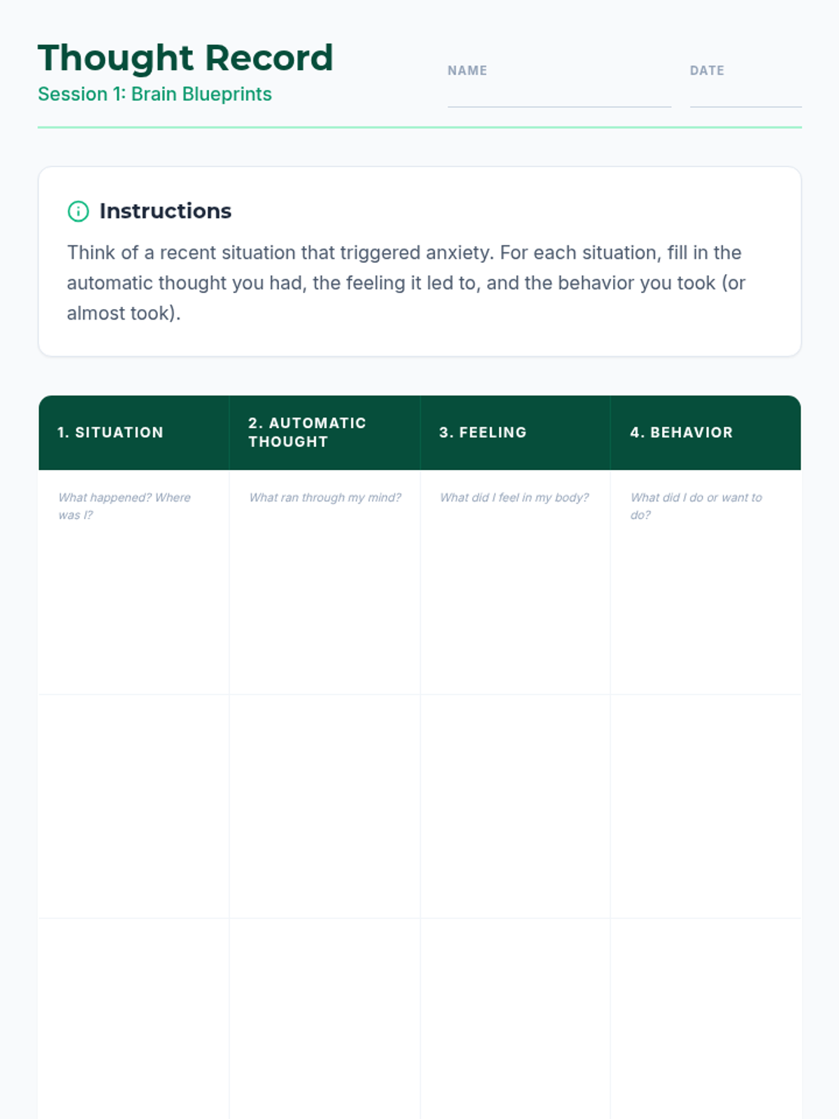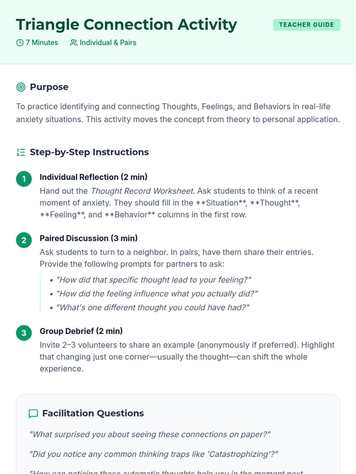 A comprehensive 16-week CBT curriculum for high school students designed to manage anxiety through practical tools and cognitive restructuring.