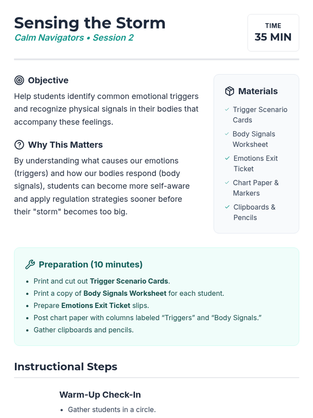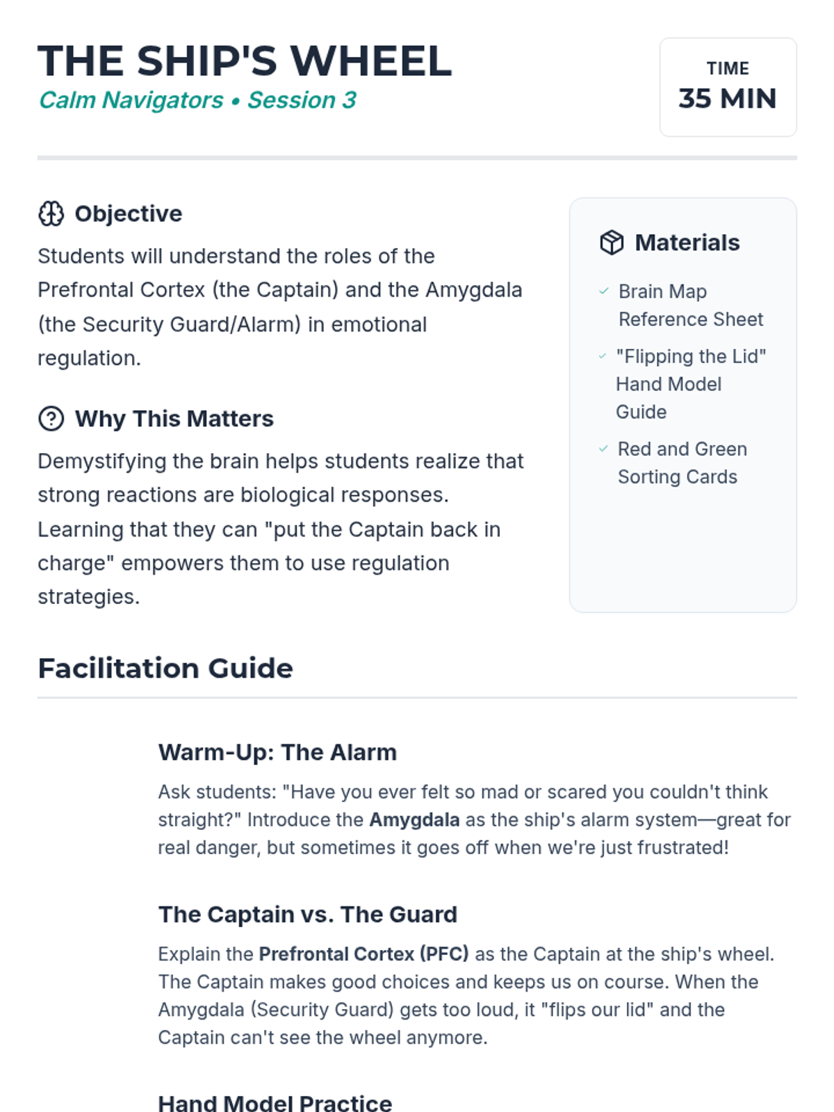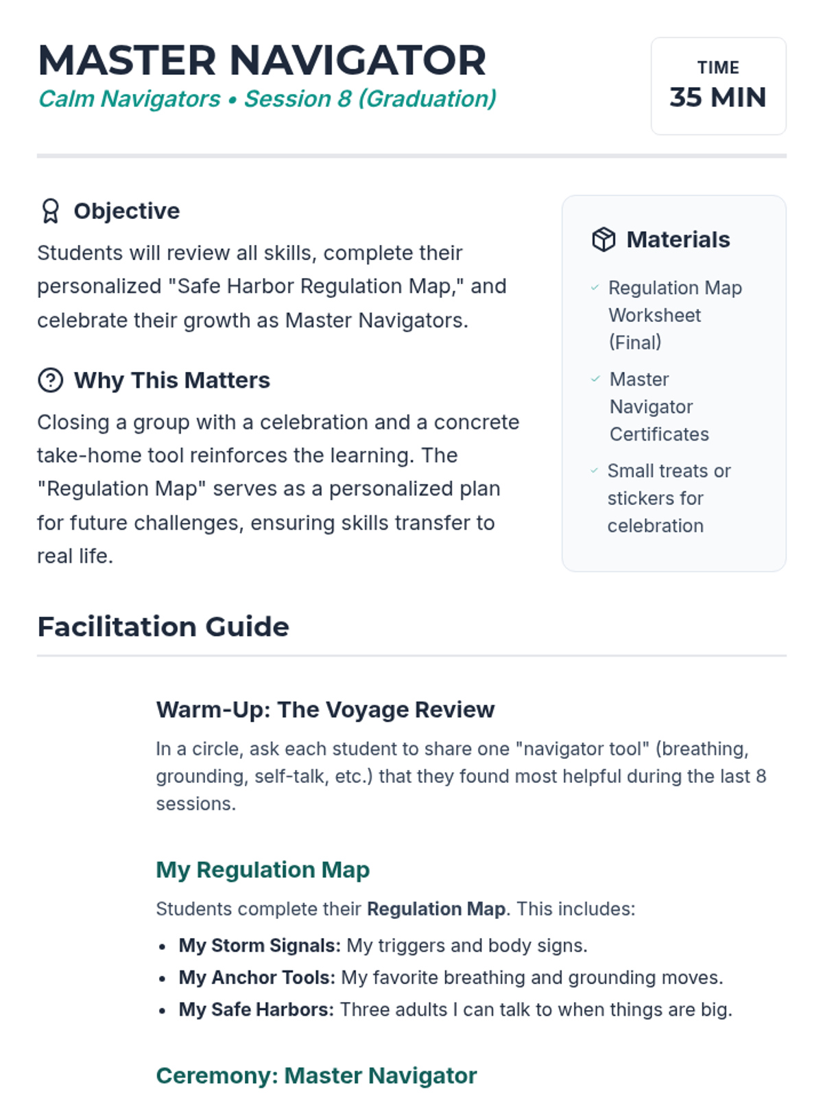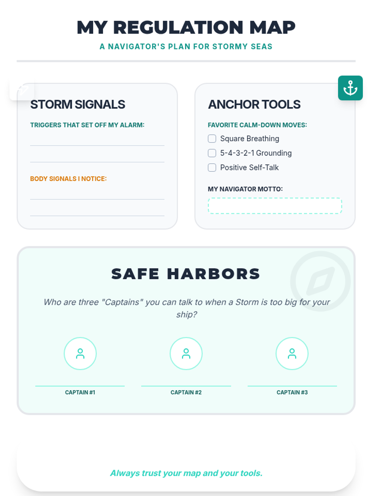 A comprehensive 8-session emotional regulation group for 4th-6th graders, using a nautical theme to teach self-awareness, triggers, calming strategies, and problem-solving.