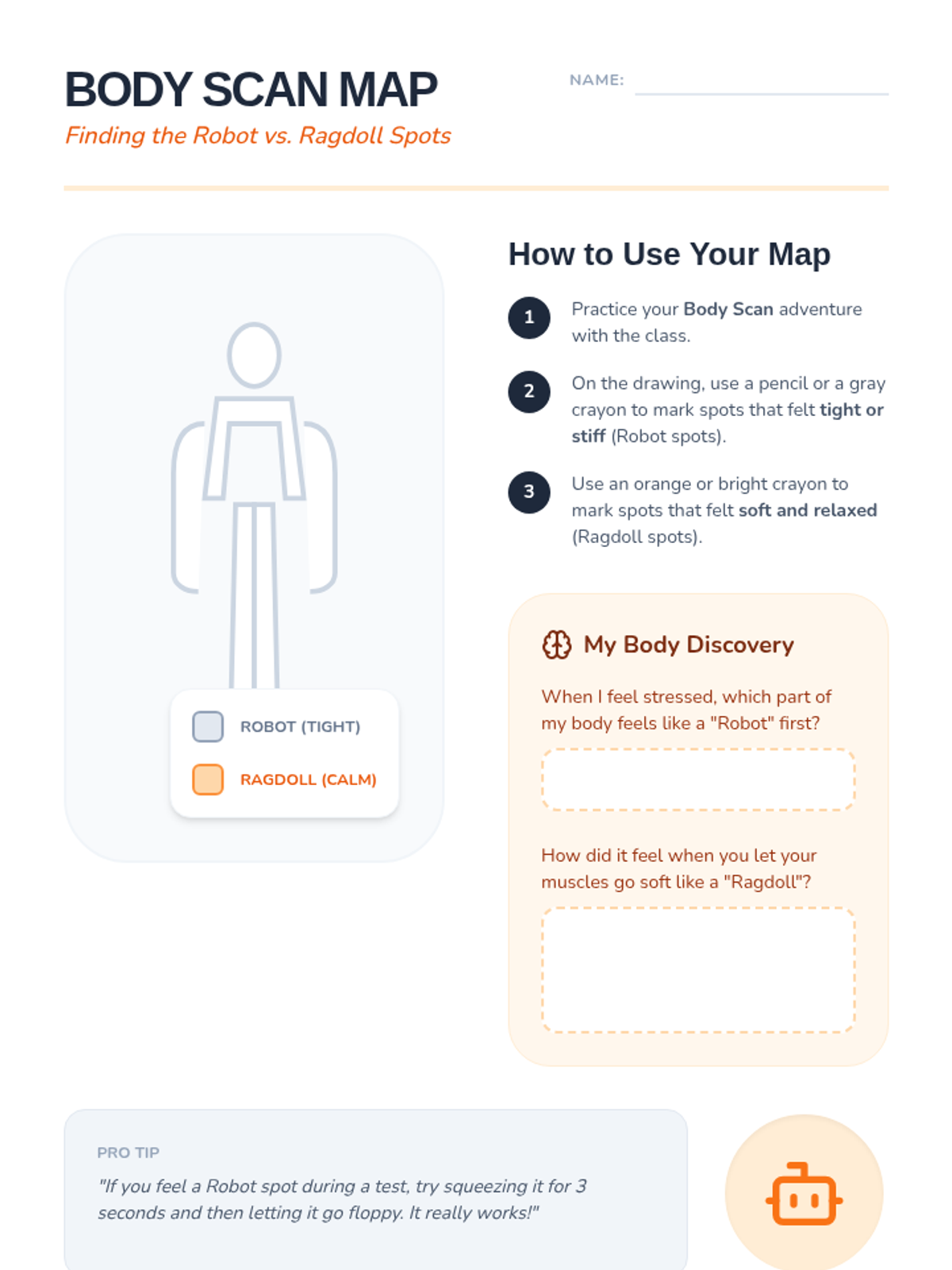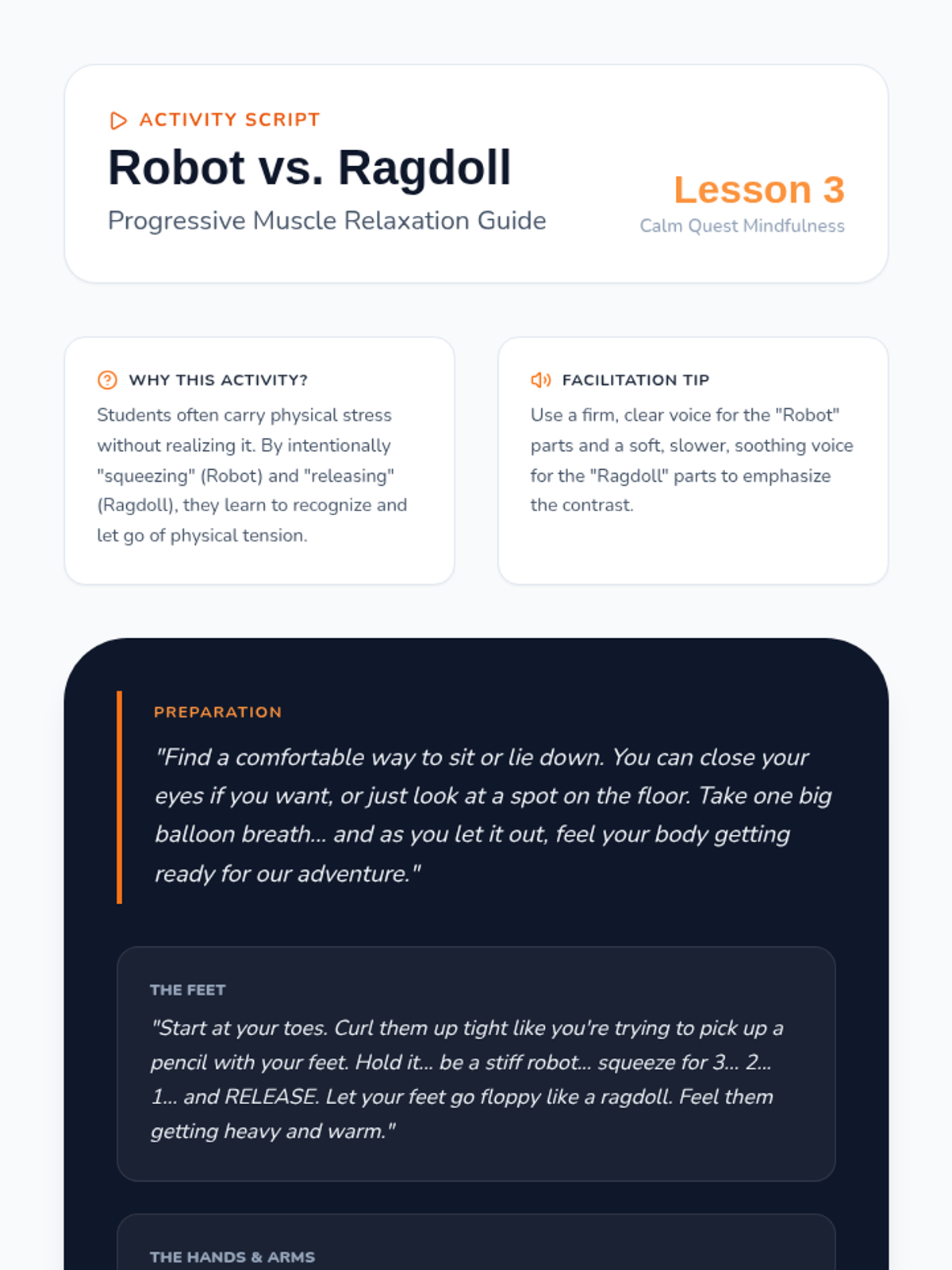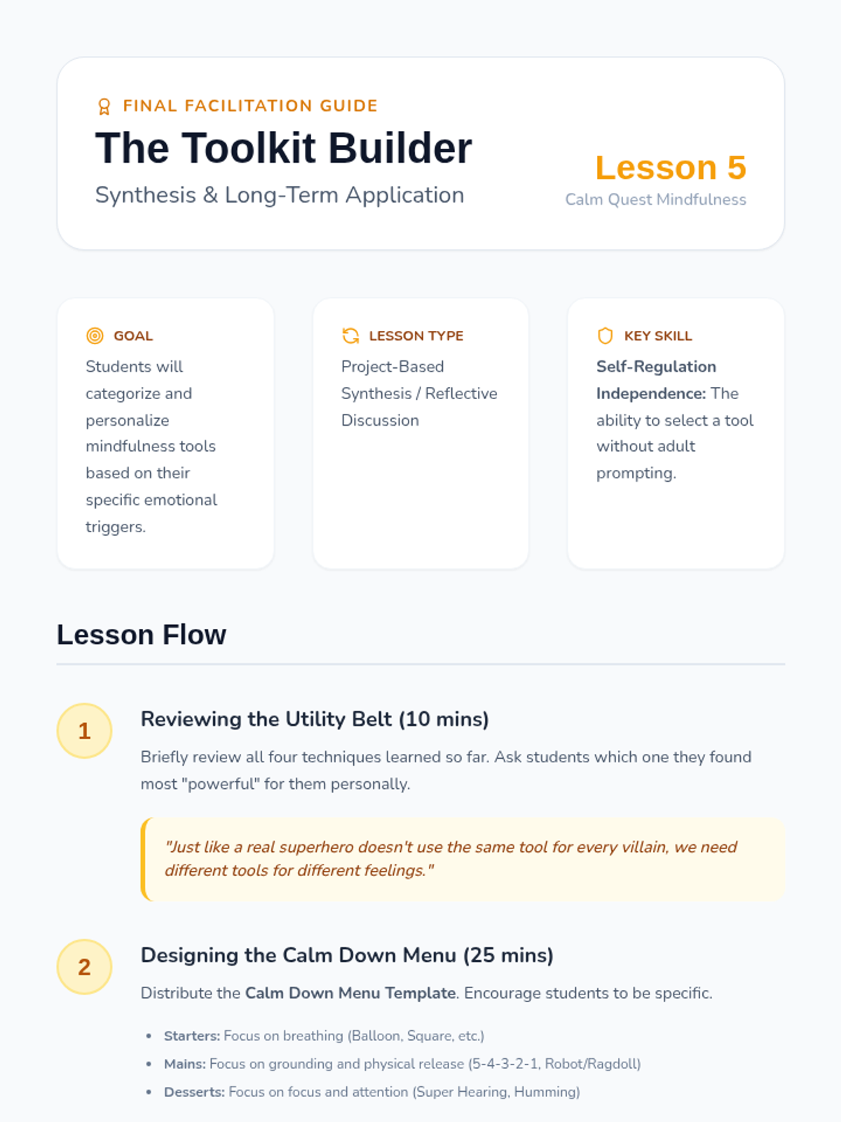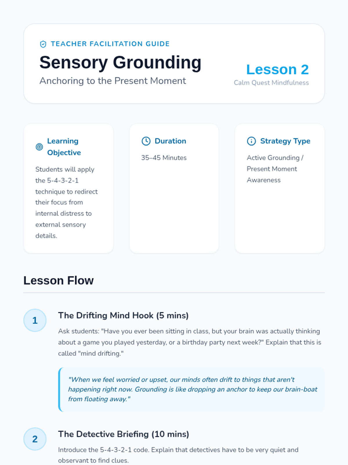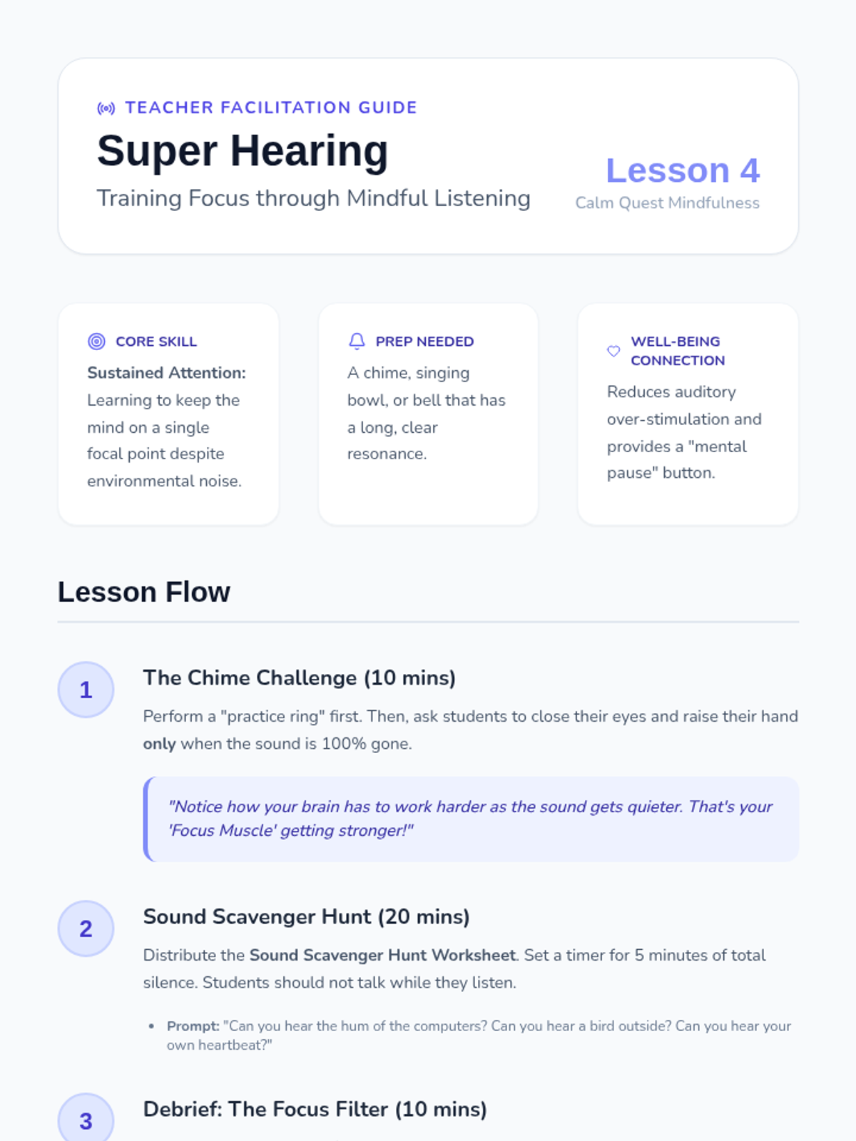 A comprehensive 5-lesson sequence for 3rd-grade students to learn and apply mindfulness techniques for emotional regulation and stress management. Students progress from basic breathing to sensory grounding, body awareness, and focused listening, culminating in a personalized mindfulness toolkit.