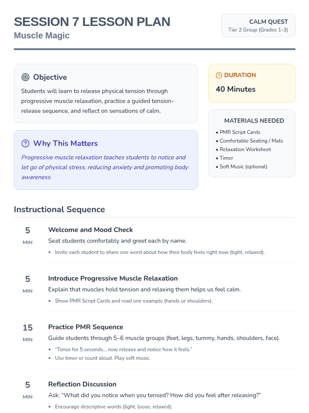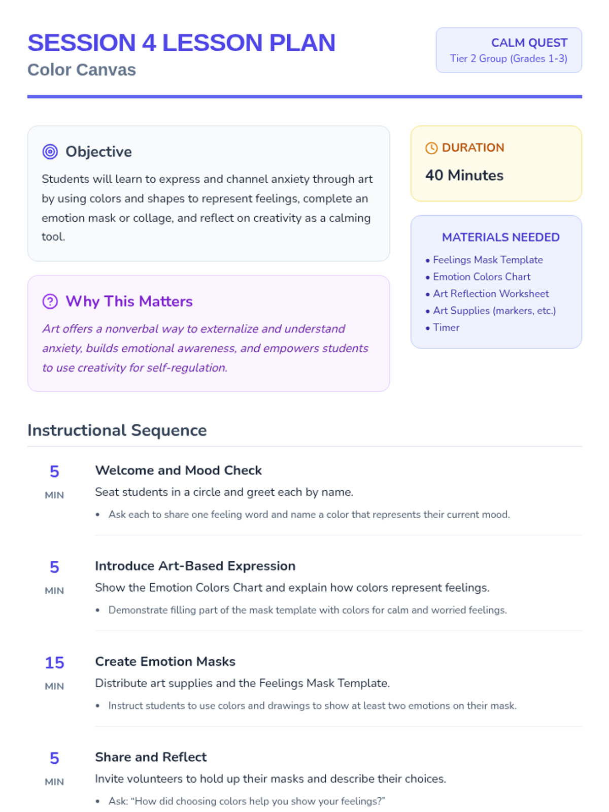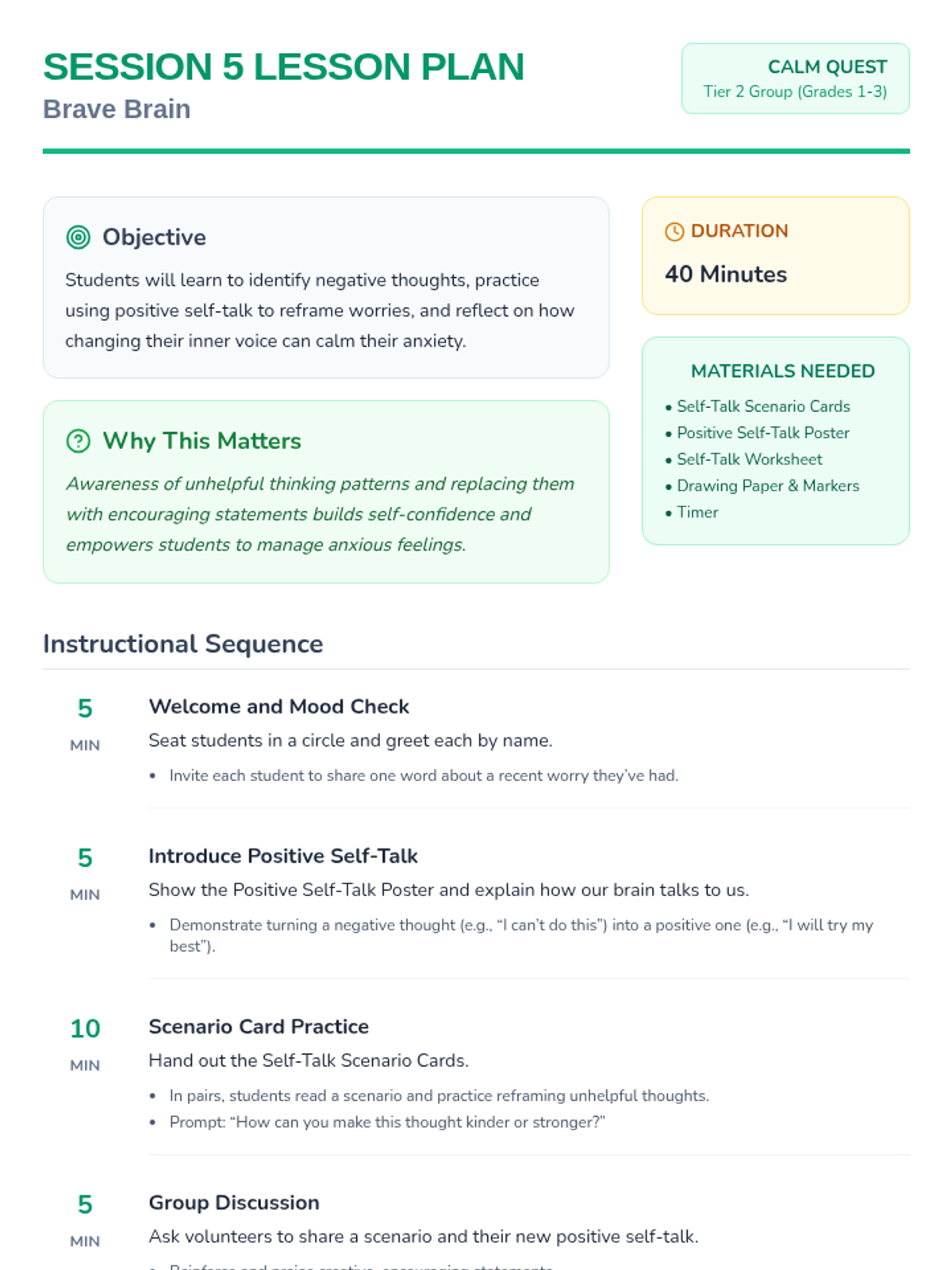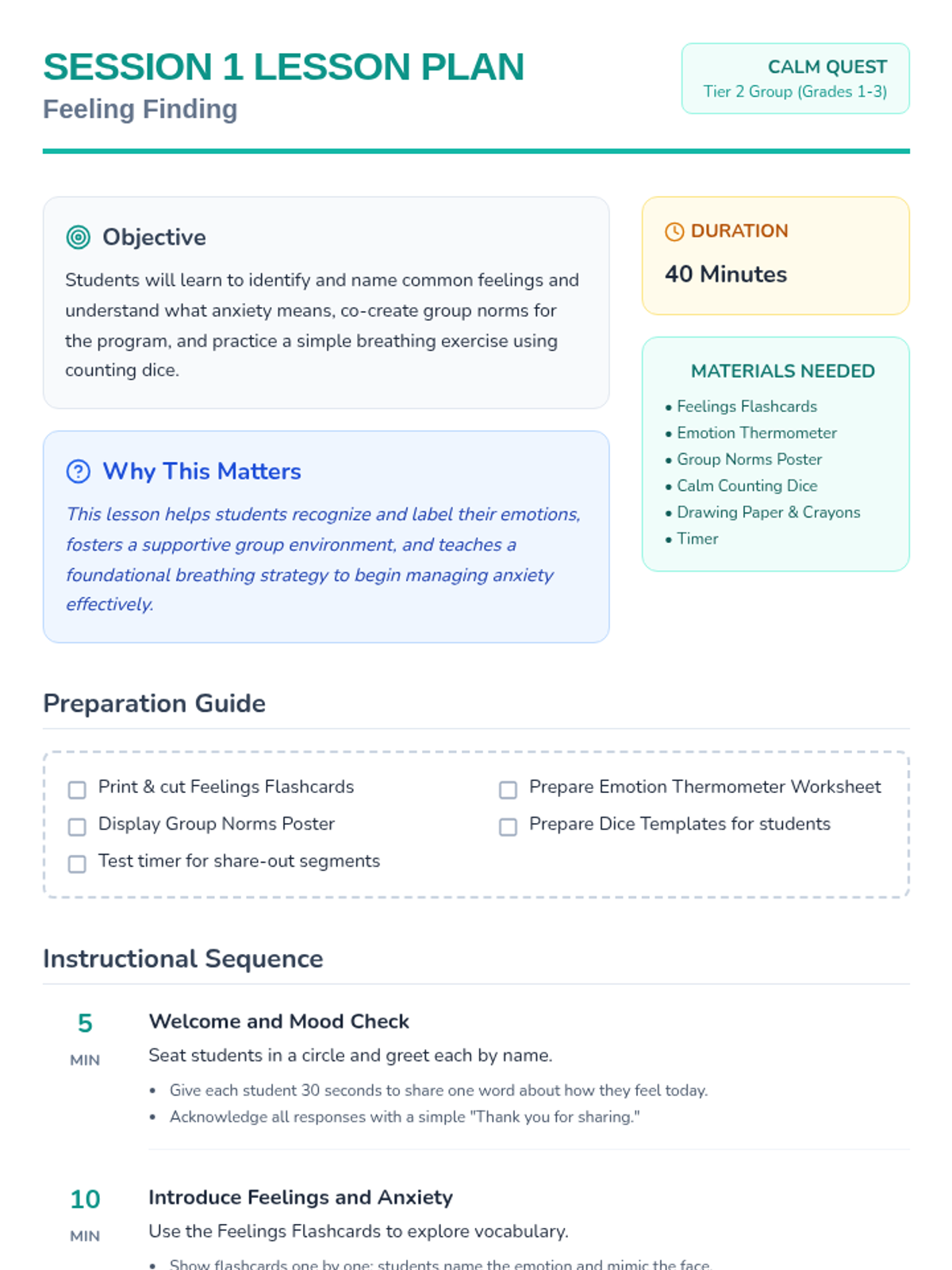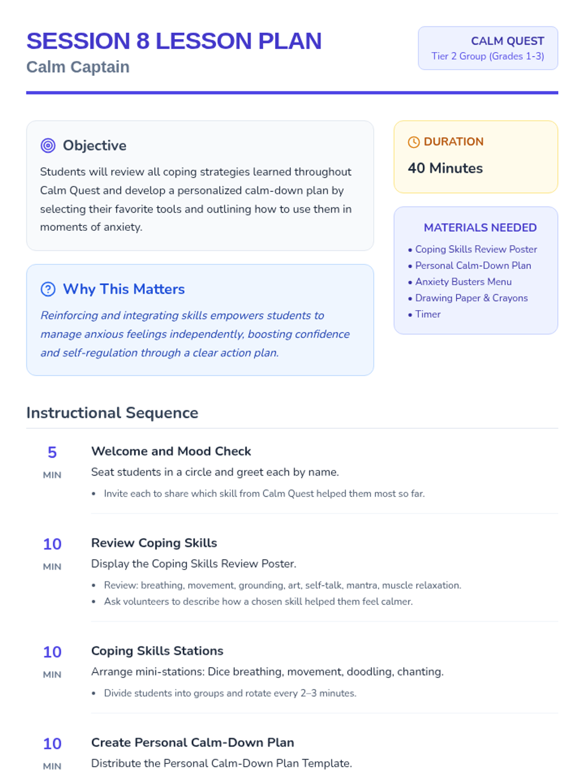 An 8-session Tier 2 group program for grades 1-3 teaching anxiety management, symptom reduction, and emotional regulation through engaging activities. Each 40-minute session builds coping skills to help students feel calm and confident.