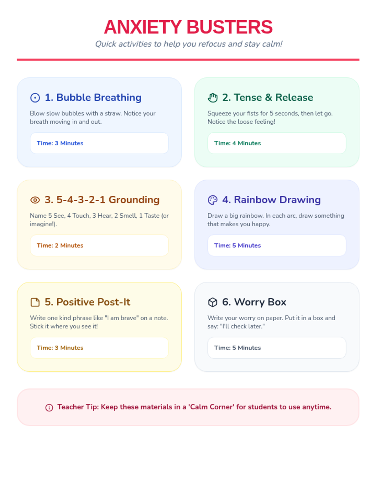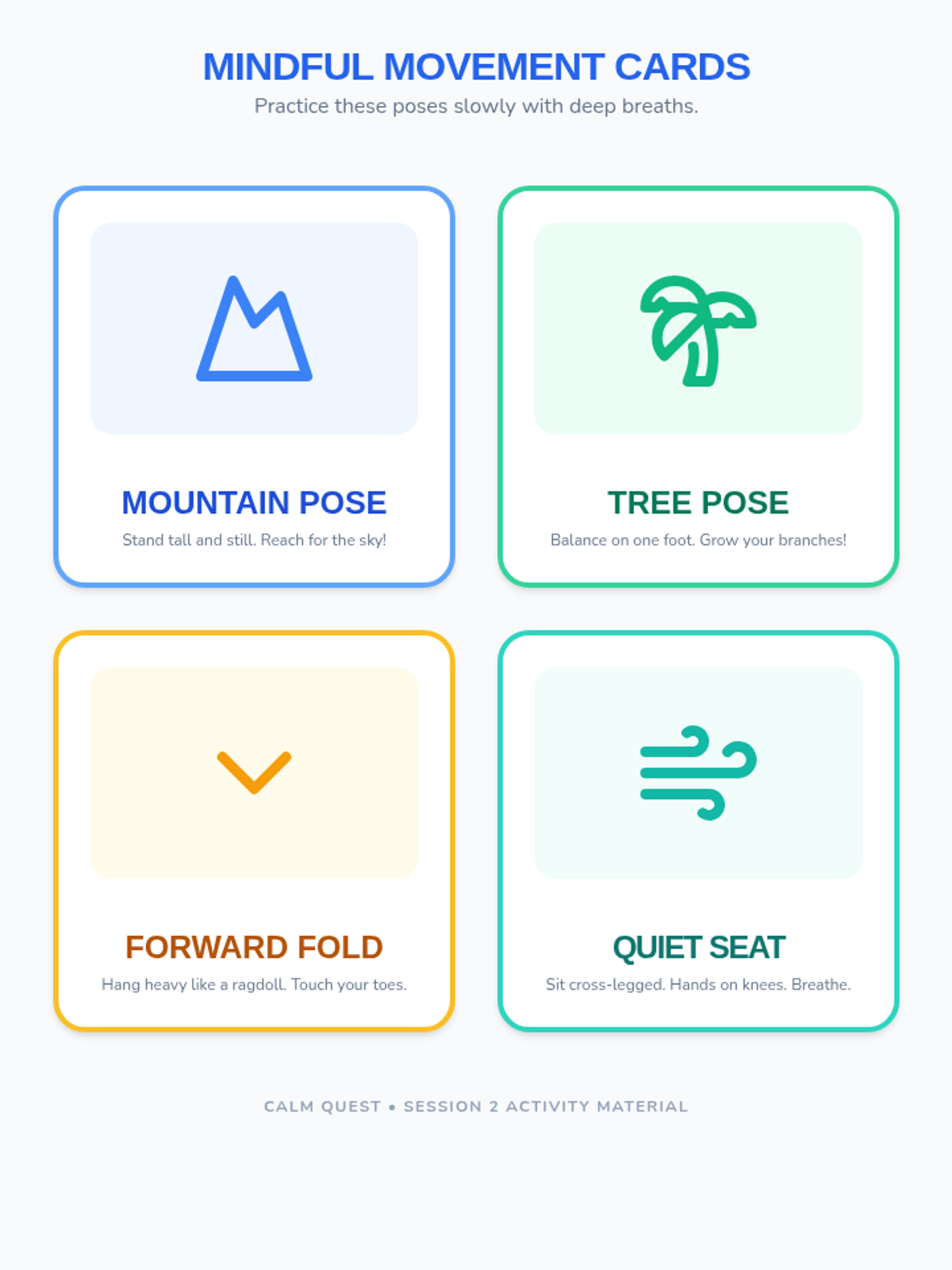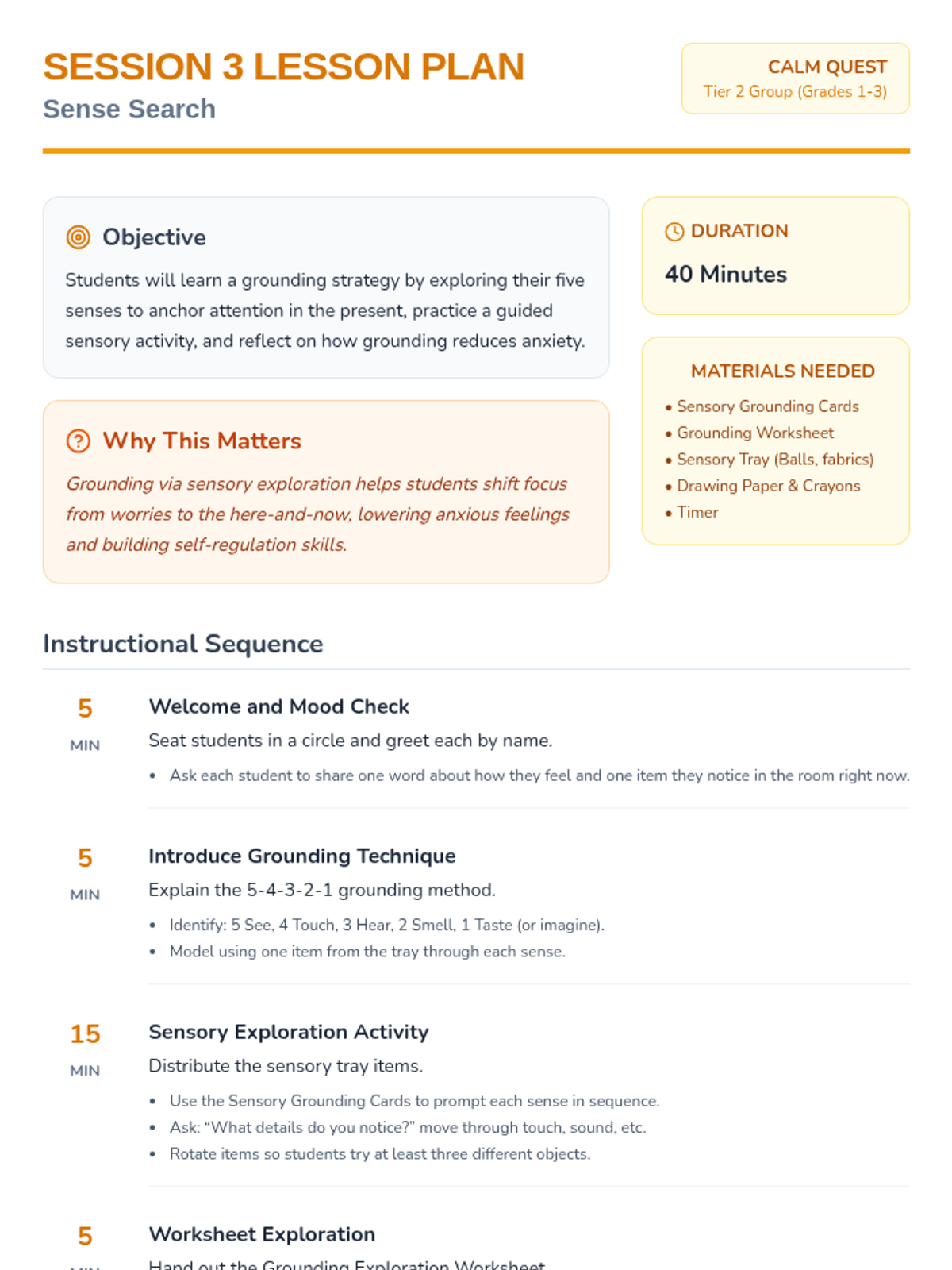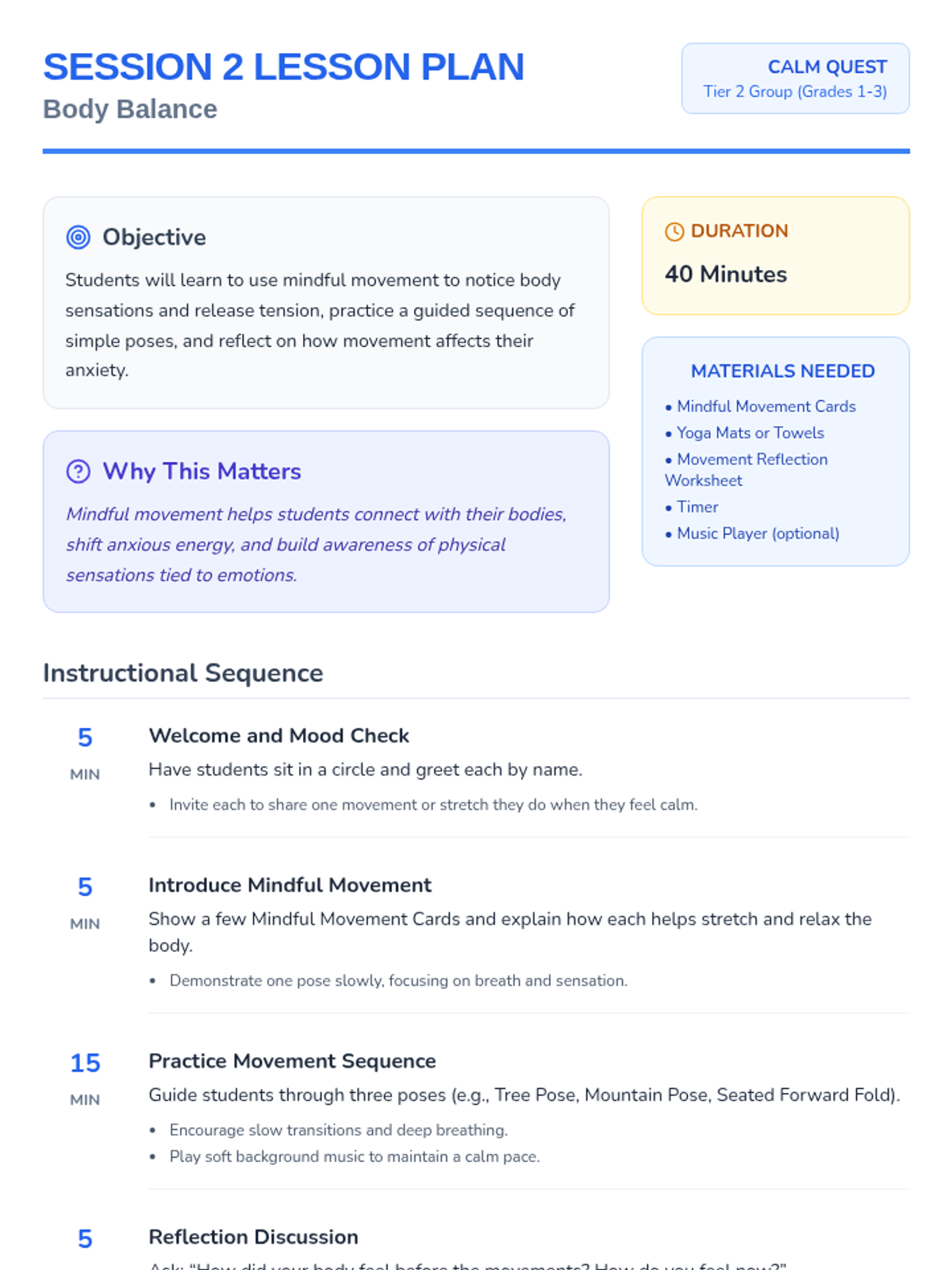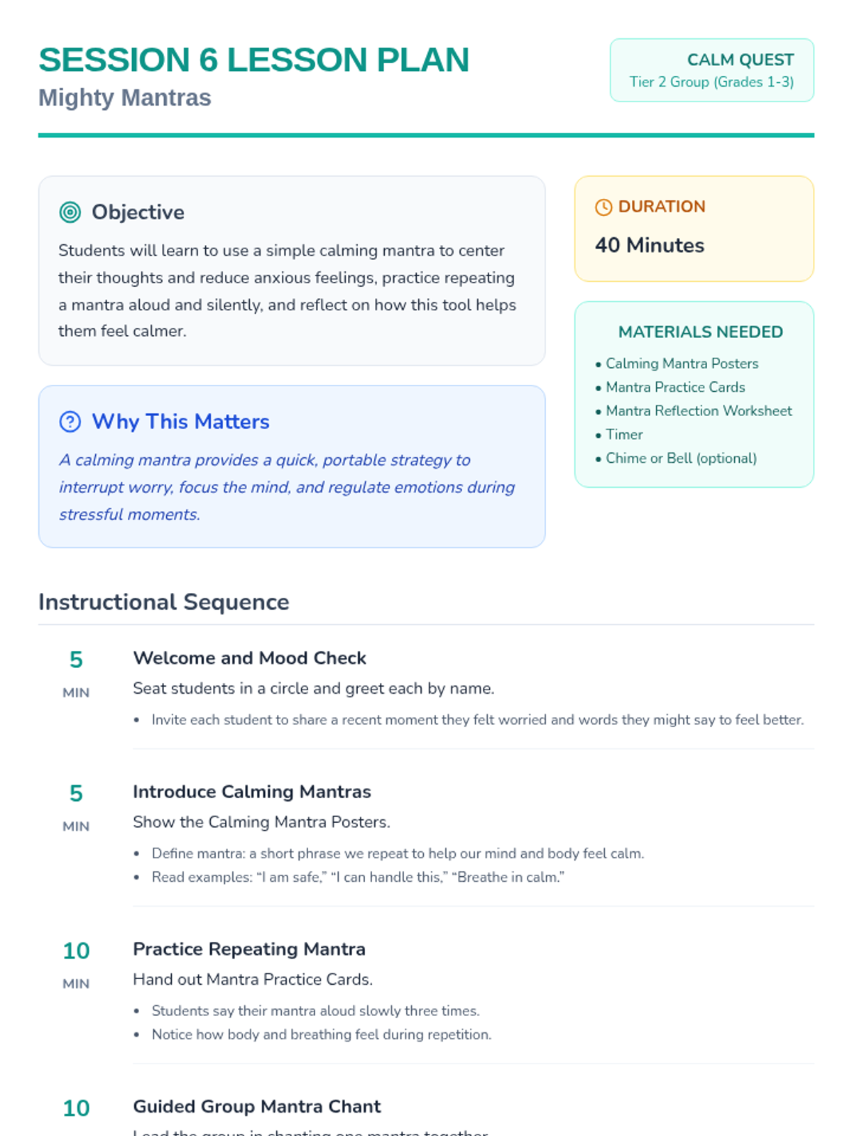 An 8-session Tier 2 group program for grades 1-3 teaching anxiety management, symptom reduction, and emotional regulation through engaging activities. Each 40-minute session builds coping skills to help students feel calm and confident.