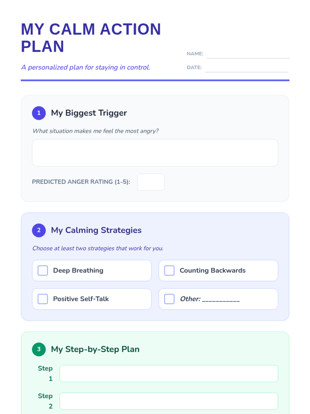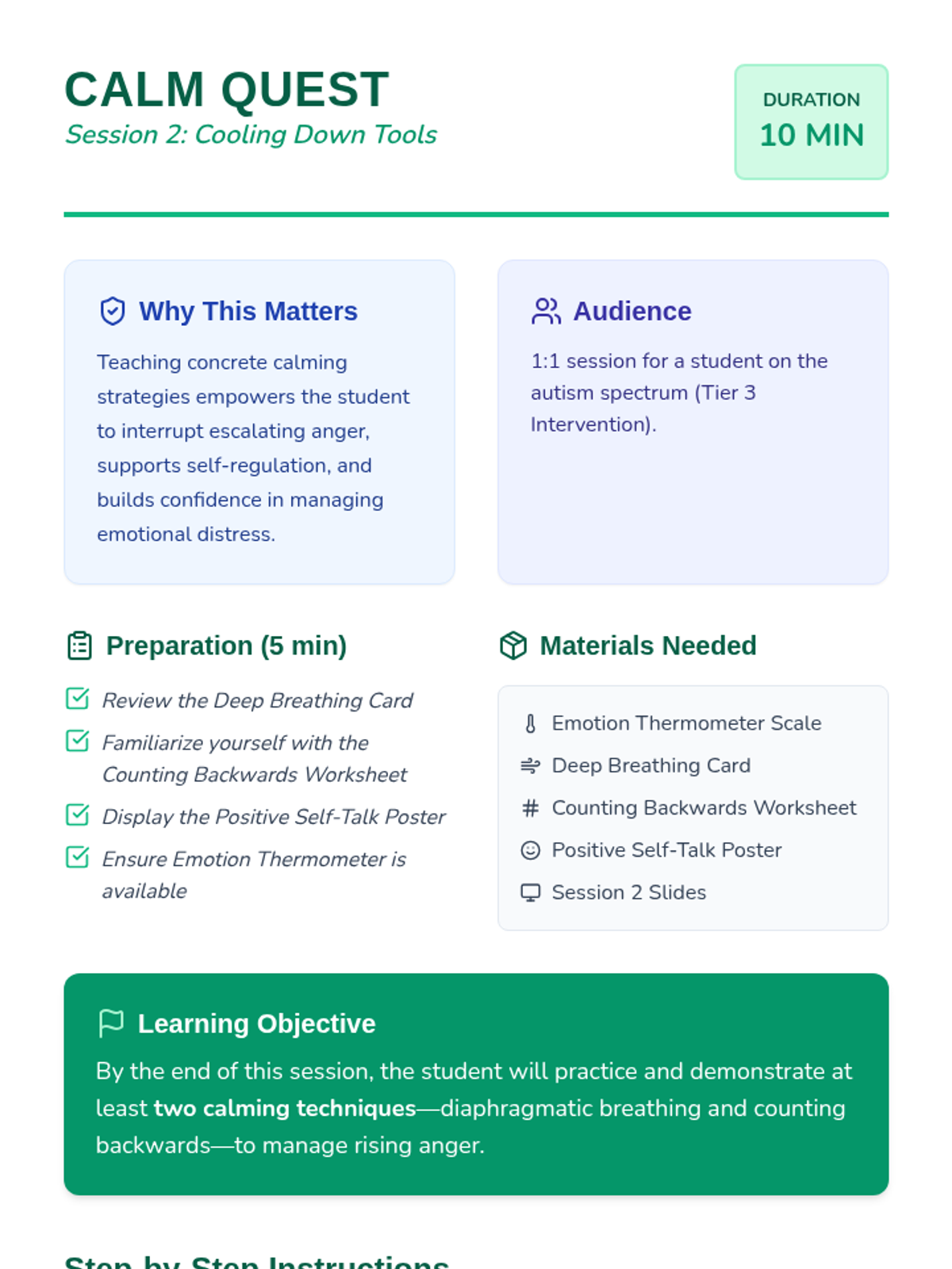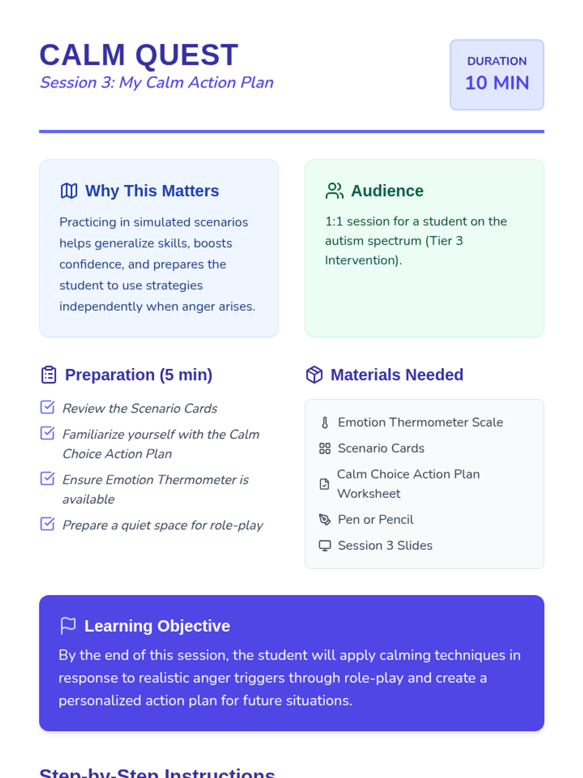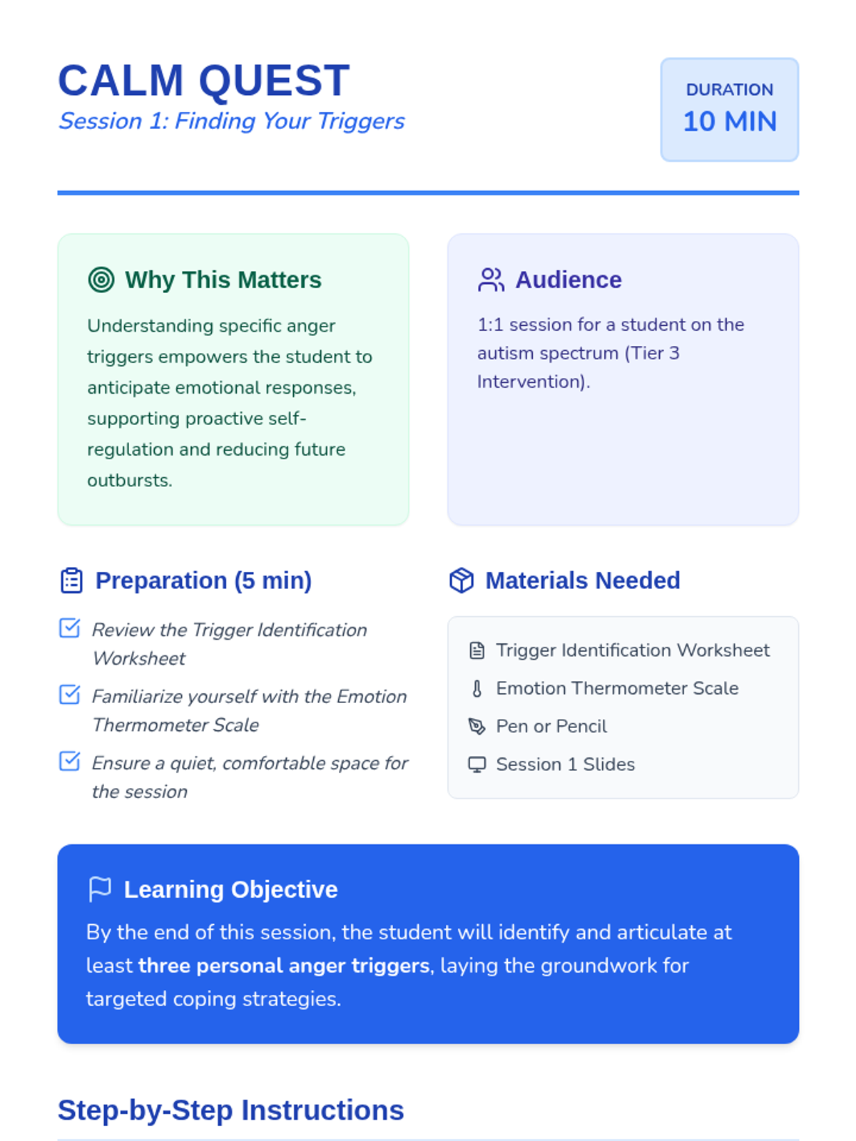 A 3-session individual intervention sequence for students on the autism spectrum focused on identifying anger triggers, practicing calming techniques, and creating a personalized action plan for emotional regulation.