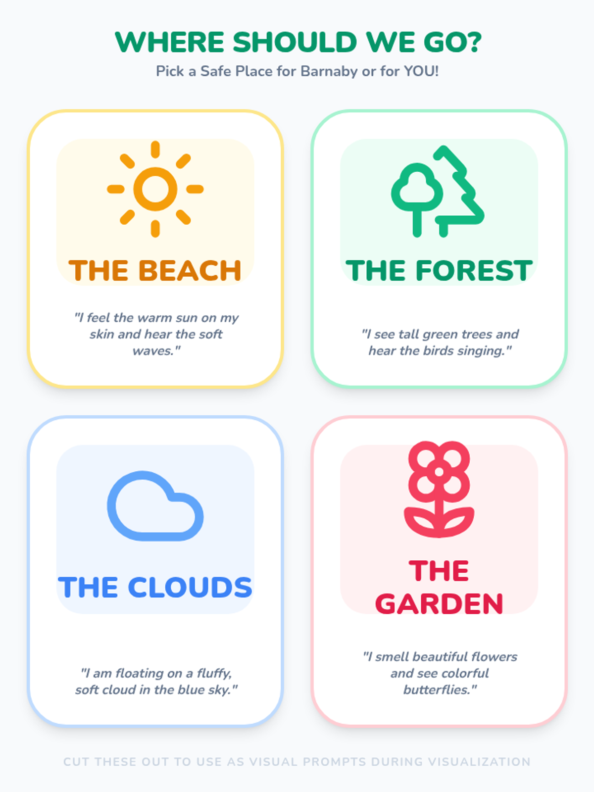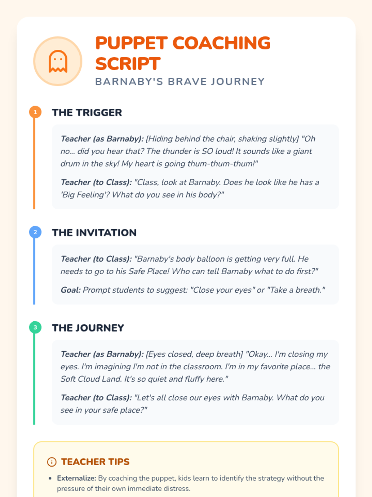 A 5-lesson sequence for Pre-K students to learn safe place visualization through role-play, puppet coaching, and breathing techniques to manage 'big feelings'.