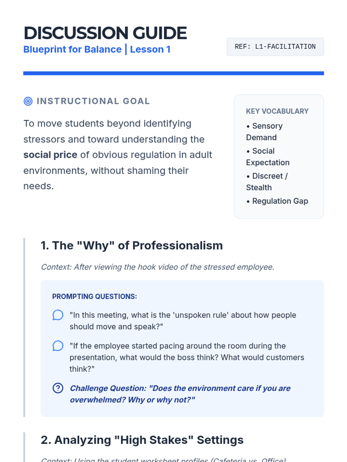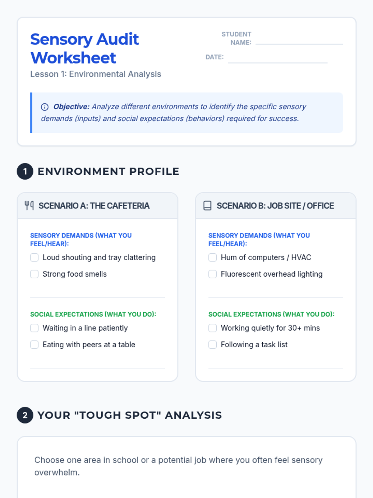 A 9th-grade sequence focused on sensory regulation within high school and workplace settings. Students learn to analyze environments, adapt strategies for discretion, build portable kits, and advocate for their needs professionally.
